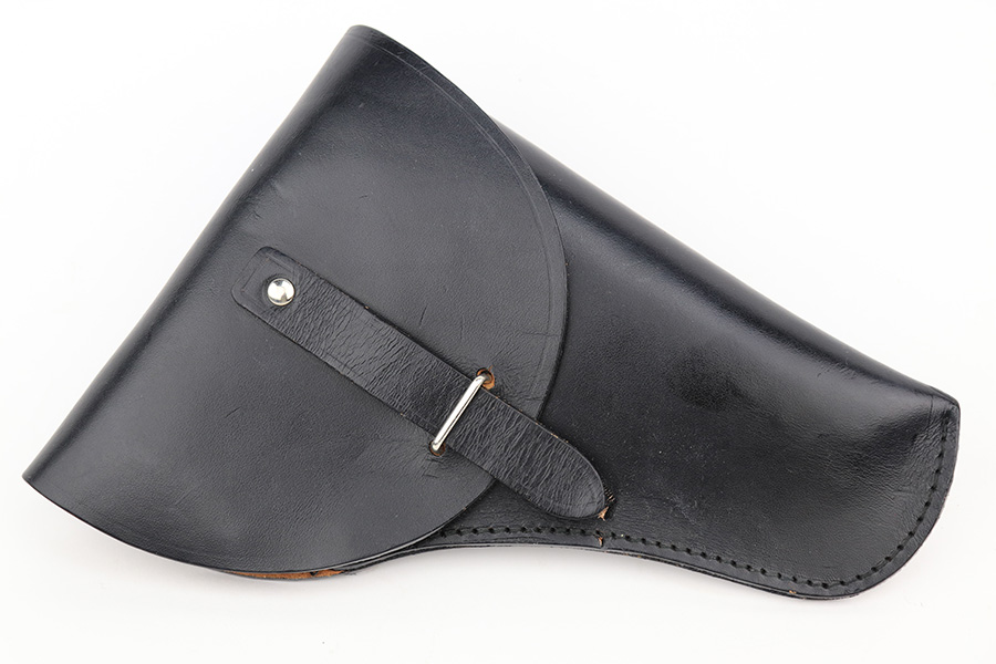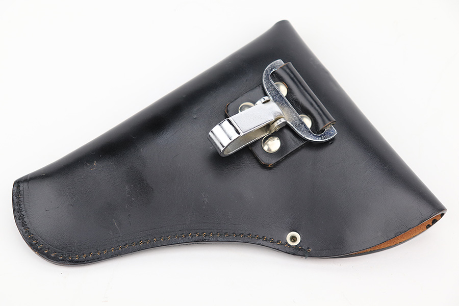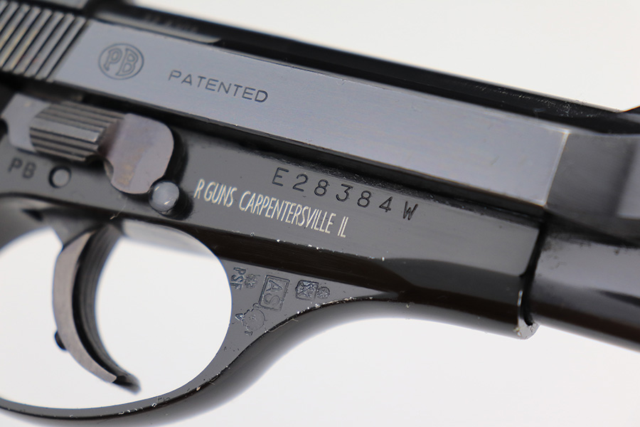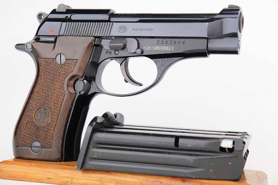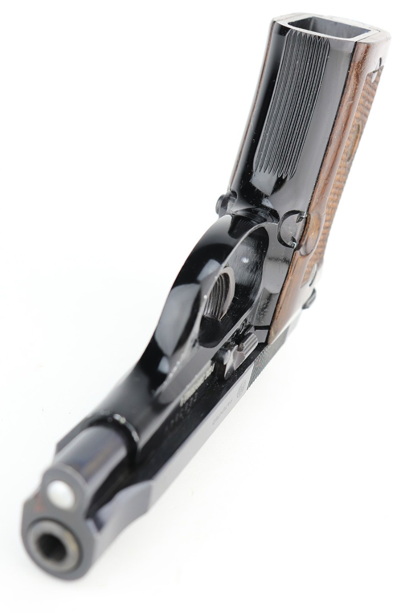 3/27/23 – This is a minty example of a Beretta Model 81BB, manufactured in 1987 and chambered in 7.65mm or .32 ACP. There is an Italian government Eagle marking on the left side of the frame and an import mark on the right side. It comes as a rig with an un-issued black leather holster and three magazines. This particular gun has retained nearly all of its original high polish finish with a few tiny handling marks here and there. Fitted with nice wood grips – minor scuffing on both sides. Minty bore.