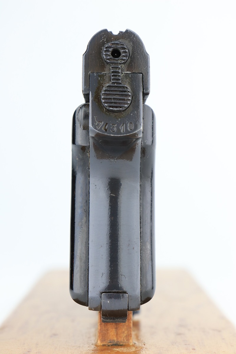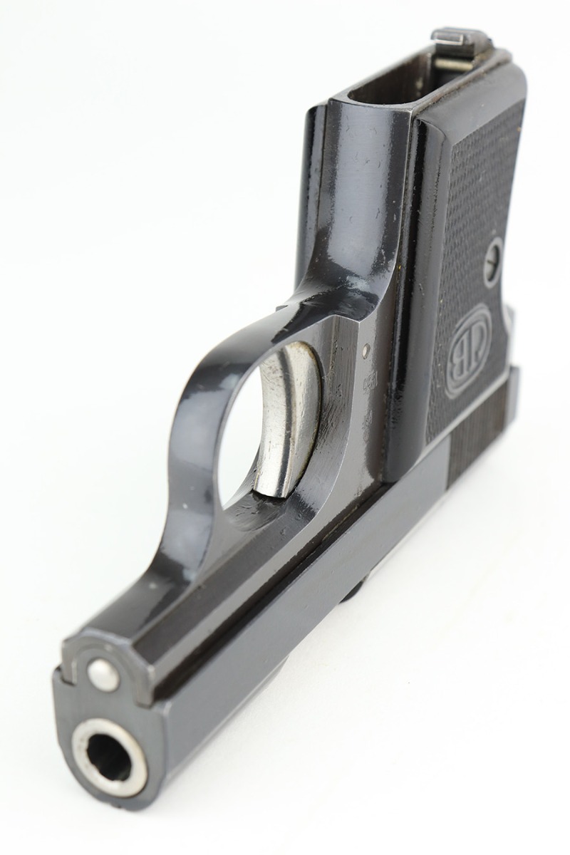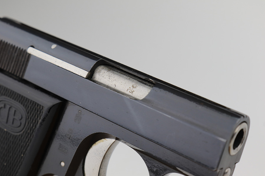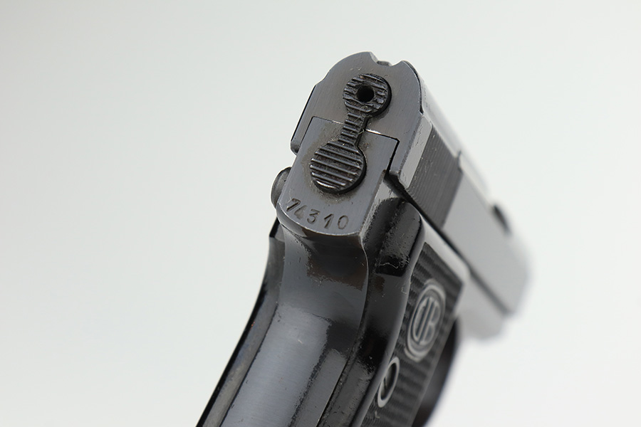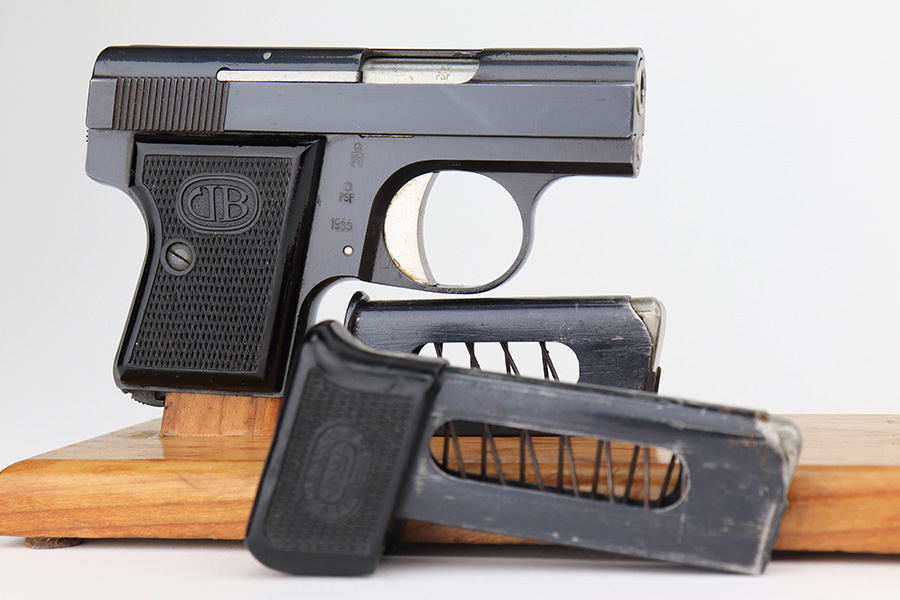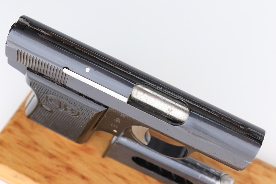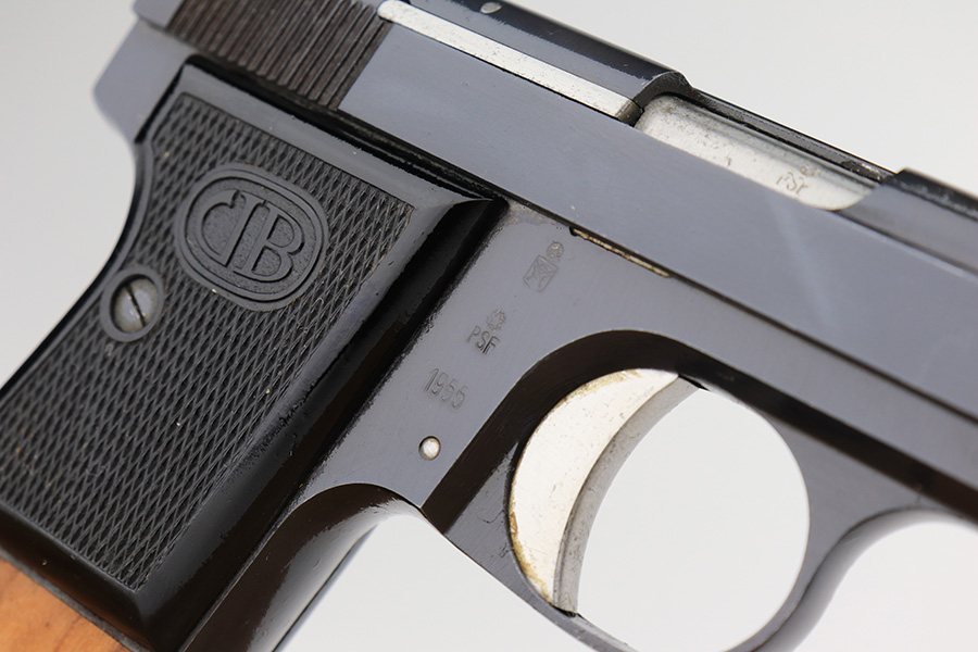 2/14/23 – This is near-mint Bernardelli Vest Pocket pistol from 1955 with spare magazine. It has 98-99% of the original blue with just a tiny bit of edge wear, and a small spot of discoloration on the right side of the slide. Minty bore and grips. Comes with an original box-style mag, as well as a flat-bottom spare.