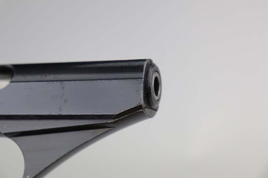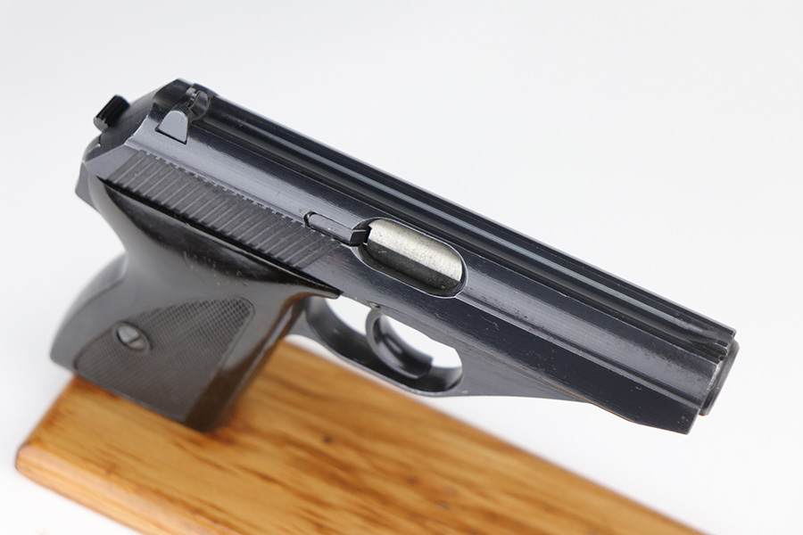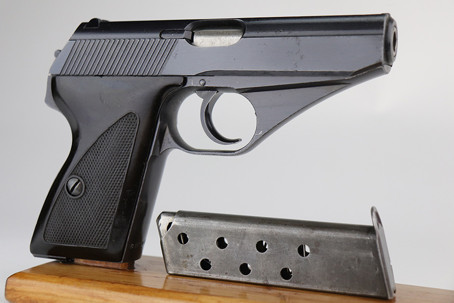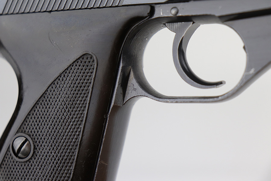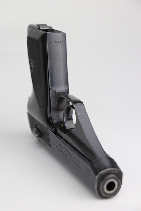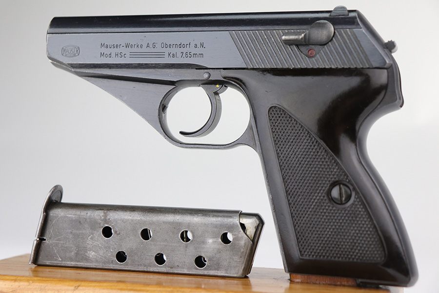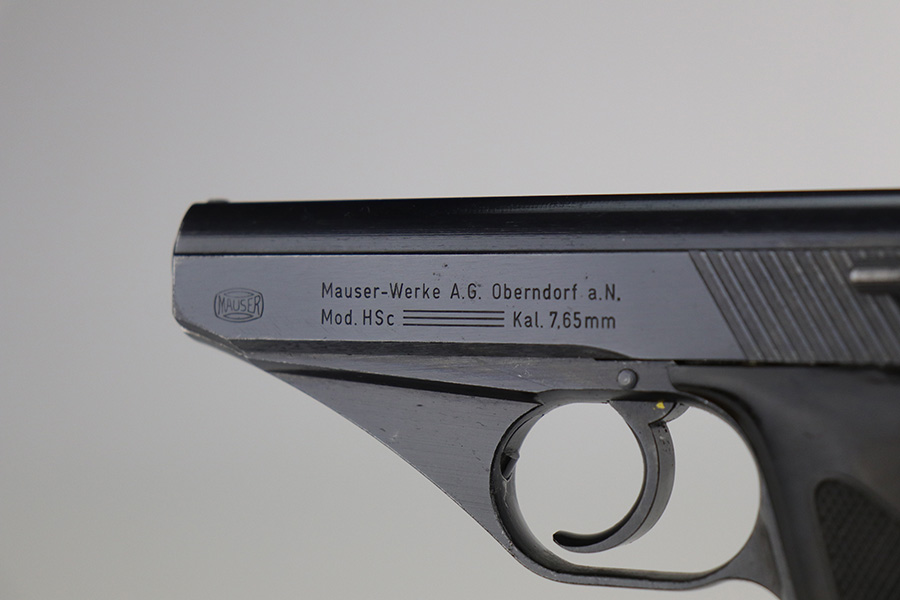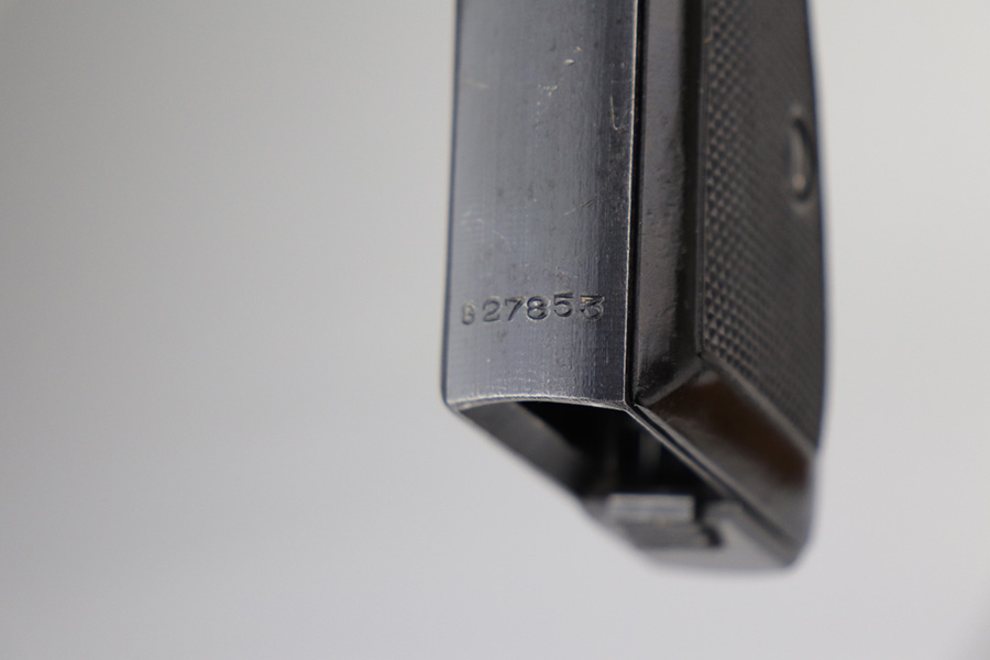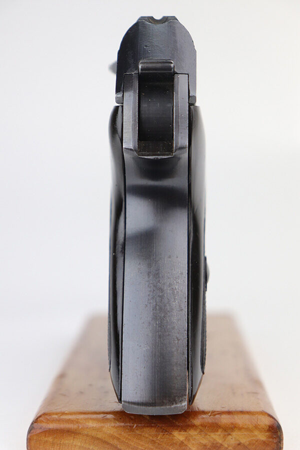 9/17/21 – This is a minty example of what we’re calling a “Black Widow” Mauser HSC sold in the commercial market in 1943. We call it a “black widow” because this one comes with black or very dark brown bakelite grips. It is all matching, lacks military proofs, and has the proper “Eagle N” commercial proofs. It has retained about 97% of its bluing. There is just a hint of wear around the muzzle and some tiny handling marks on the underside of the frame and on the front strap. There is an area on the right side of the slide where there are a few tiny pits. Comes with a period-correct halfmoon magazine. Minty bore.