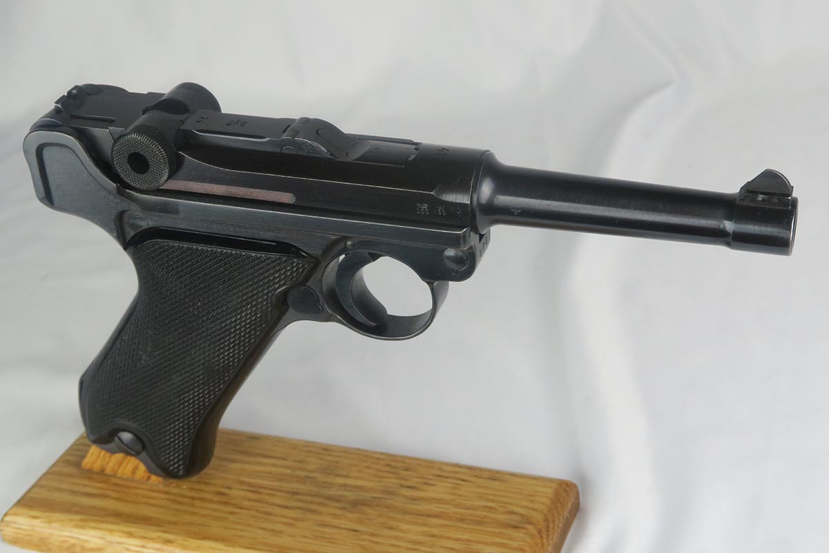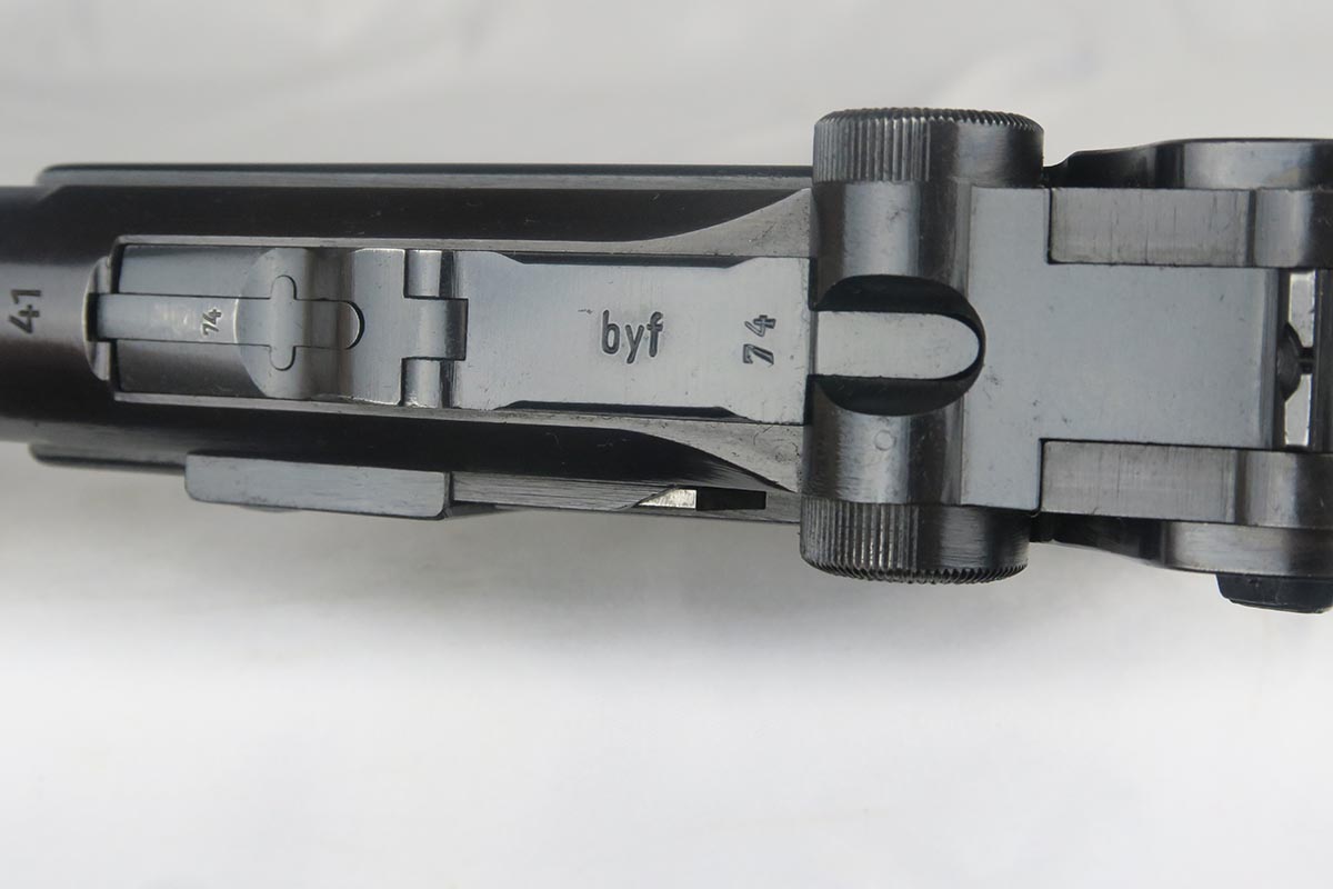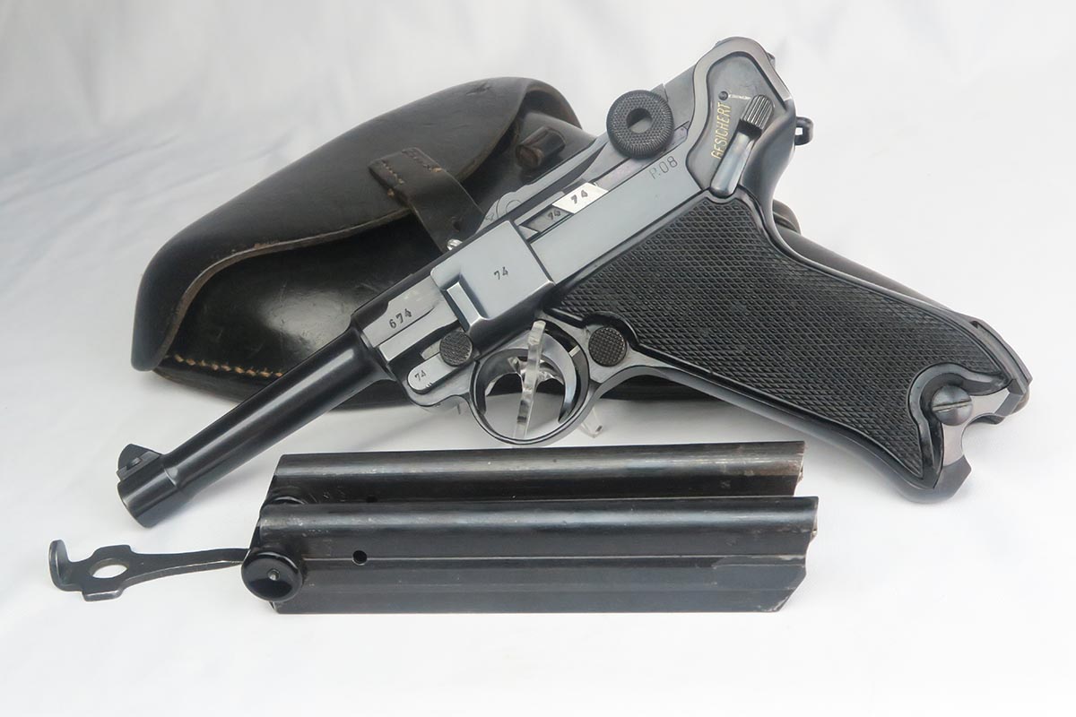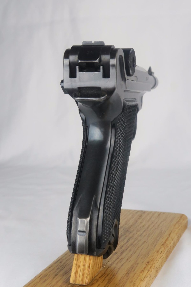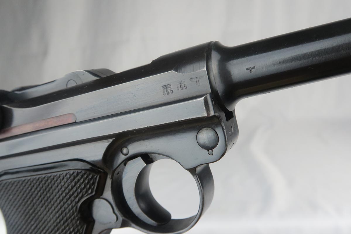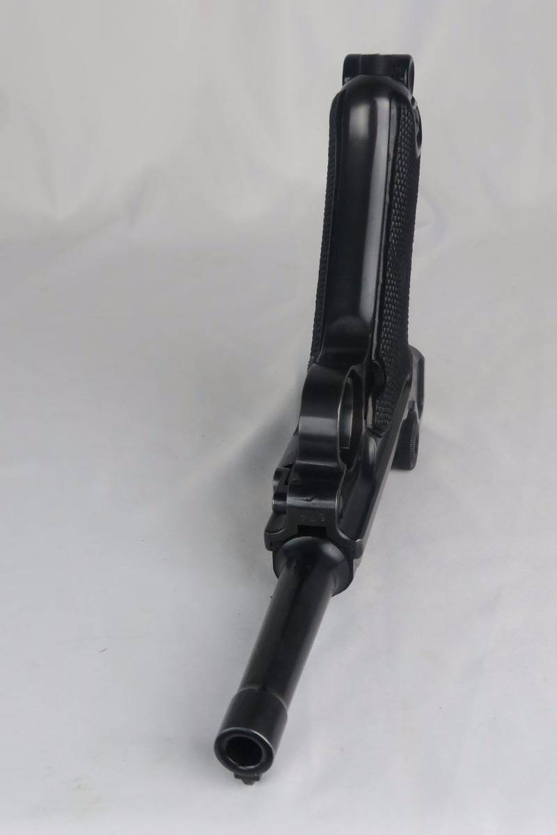 10/23/17 – This is probably the nicest Black Widow Mauser luger we have ever offered for sale.  It is a genuine 99% gun, with only minor rub wear on the muzzle and sideplate.  The pistol is all correct and matching, with Black Widow-style grips and magazine.  The pistol comes as part of a full rig, with a spare magazine, tool and holster.  The spare magazine is correct but there is a minor chip in the plastic bottom.  The tool is faintly Eagle/655 proofed, same as the gun.  The holster is 1942 dated and waffen proofed, but the front flap does show a minor puncture.  Pistol bore is minty.