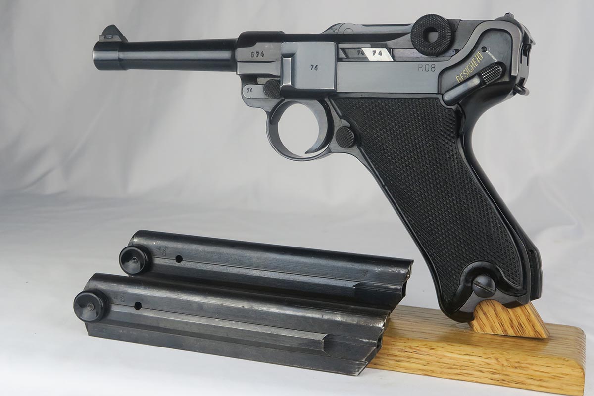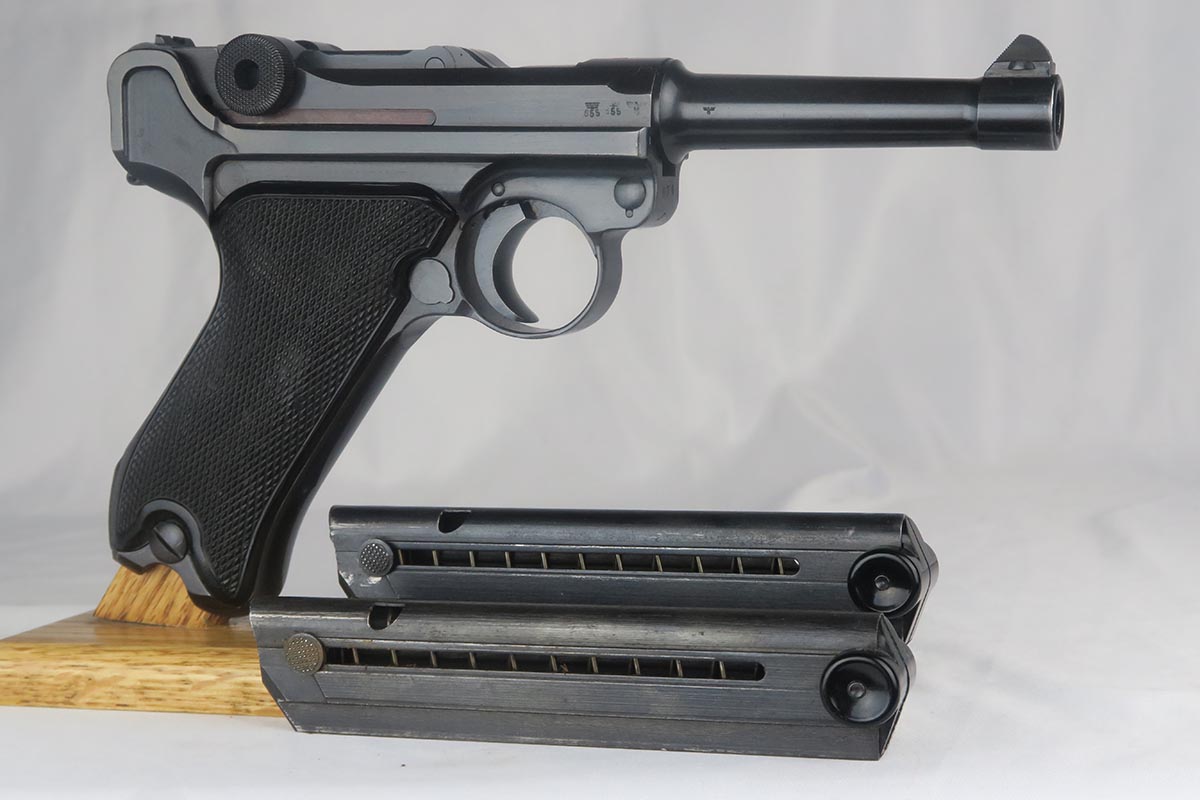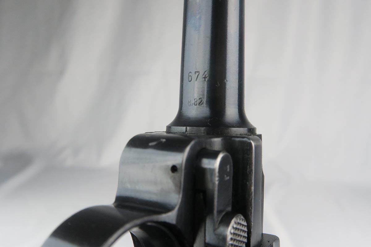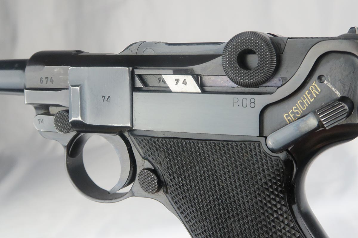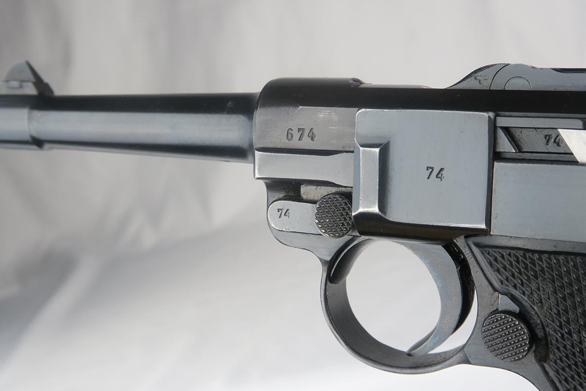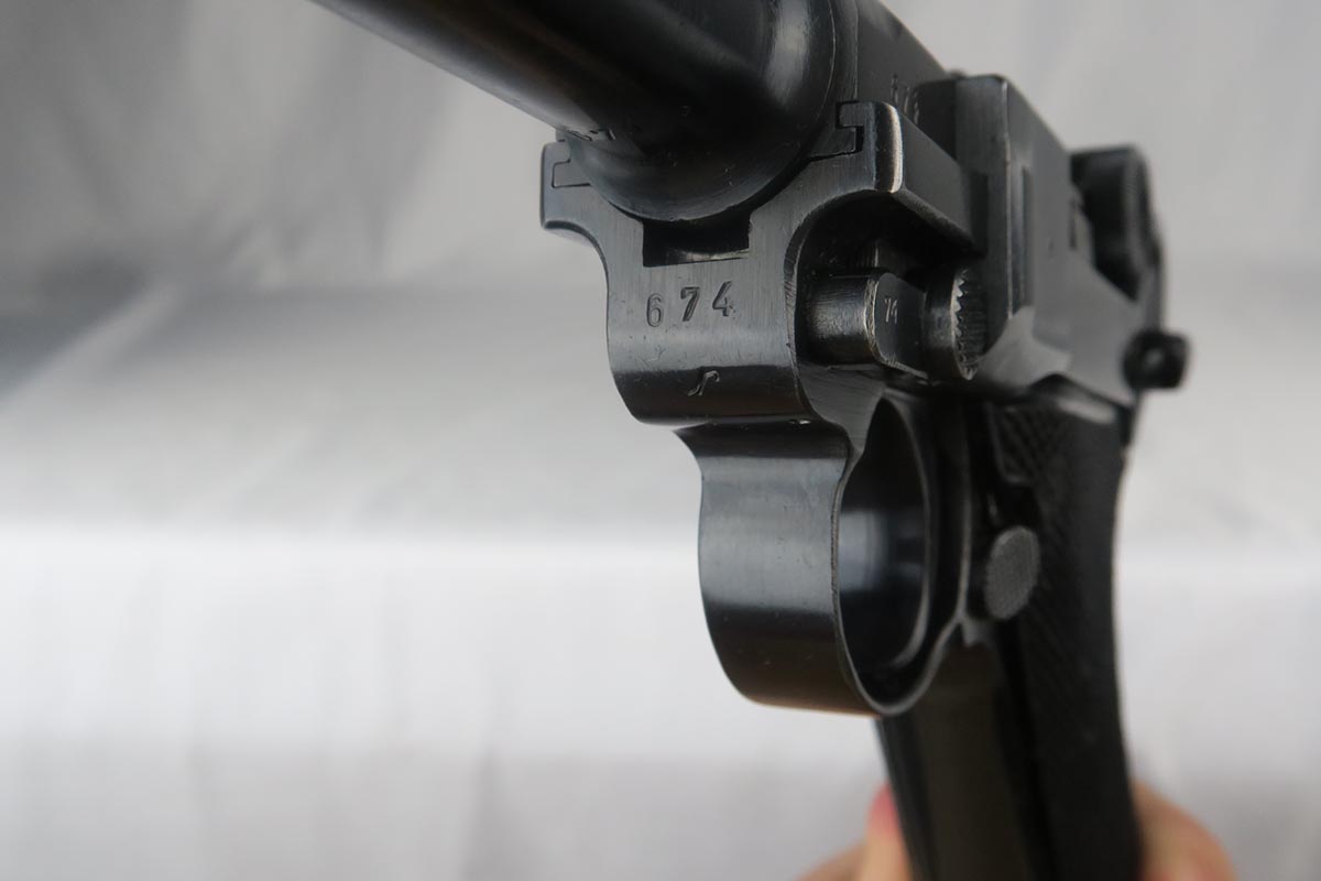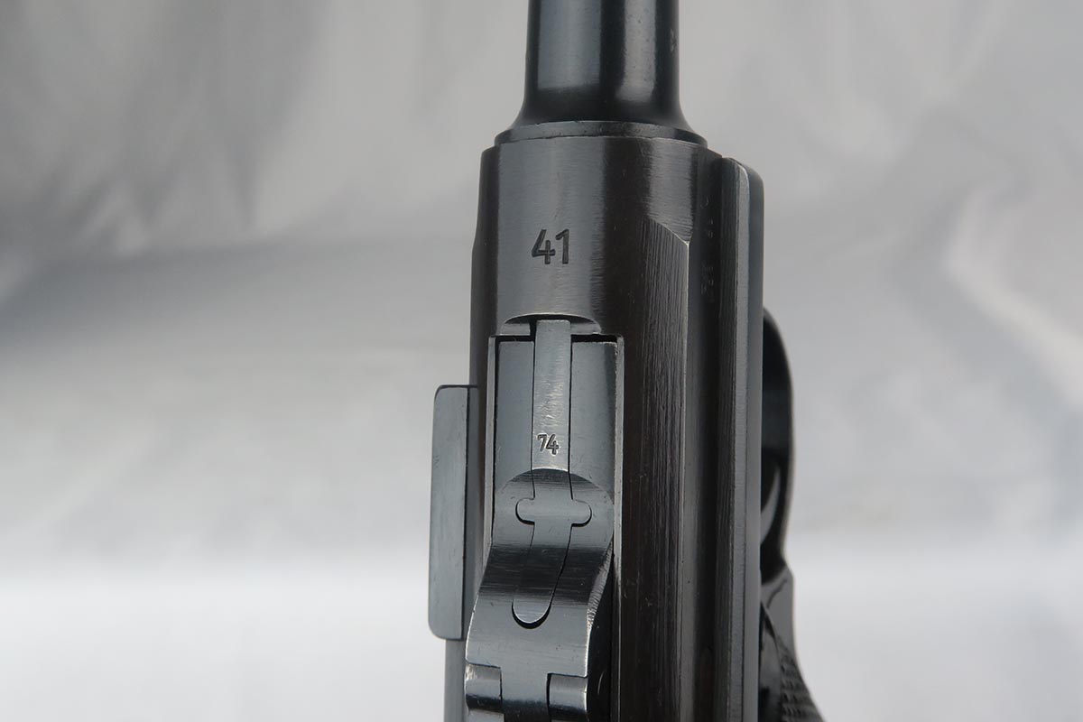 10/23/17 – This is probably the nicest Black Widow Mauser luger we have ever offered for sale.  It is a genuine 99% gun, with only minor rub wear on the muzzle and sideplate.  The pistol is all correct and matching, with Black Widow-style grips and magazine.  The pistol comes as part of a full rig, with a spare magazine, tool and holster.  The spare magazine is correct but there is a minor chip in the plastic bottom.  The tool is faintly Eagle/655 proofed, same as the gun.  The holster is 1942 dated and waffen proofed, but the front flap does show a minor puncture.  Pistol bore is minty.