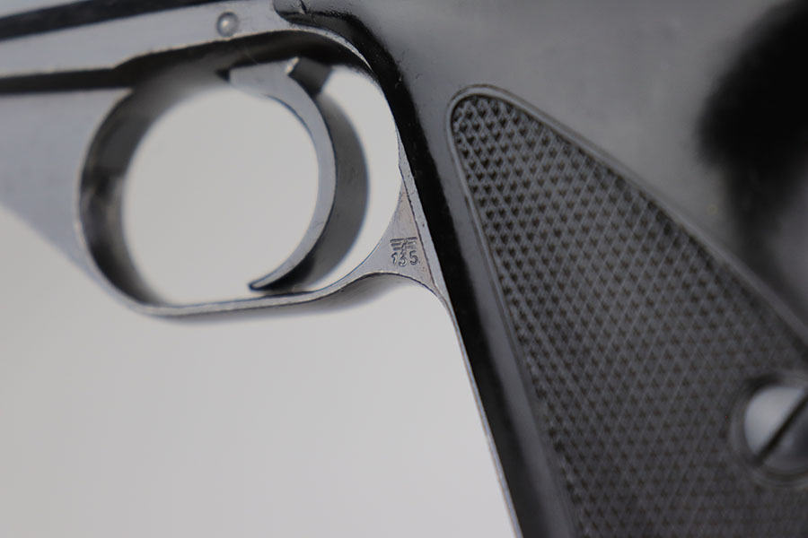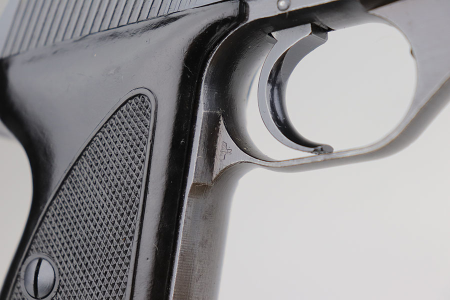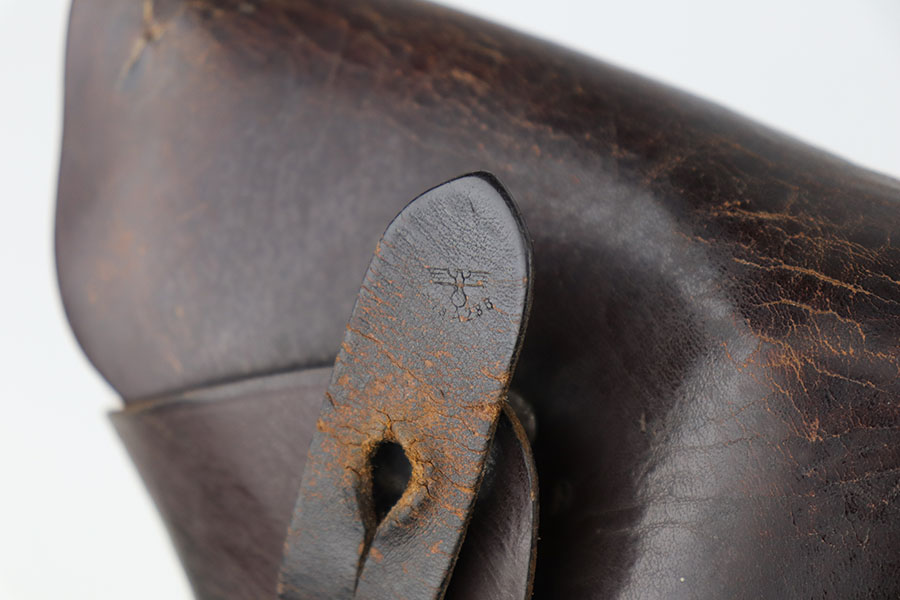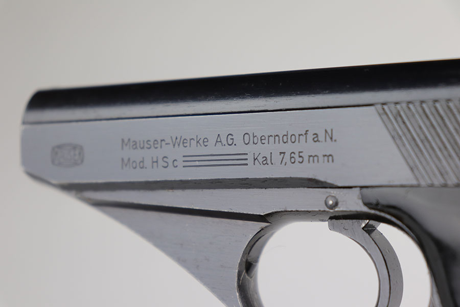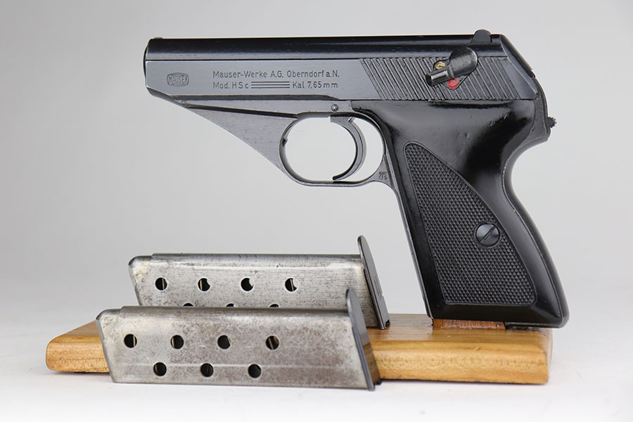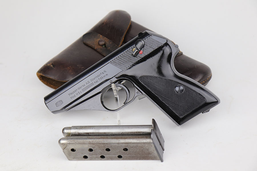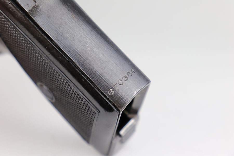 8/11/20 – This is an excellent Nazi Mauser HSc rig with the scarce black plastic grips, hence drawing comparison to the Black Widow Mauser Lugers. It has 97-98% of the original blue with minor high edge wear from the holster, and just a bit of finish loss on the bottom of the back strap. Made in 1943 and has E/135 proof on frame. Excellent bore and grips. One magazine is banner marked, the other is blank. The rig is completed by a Berlin marked, original holster.