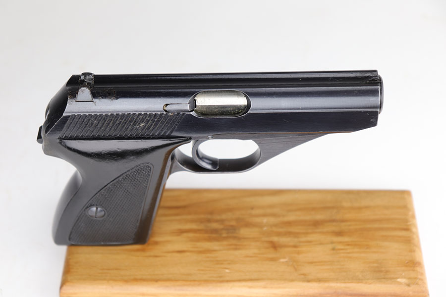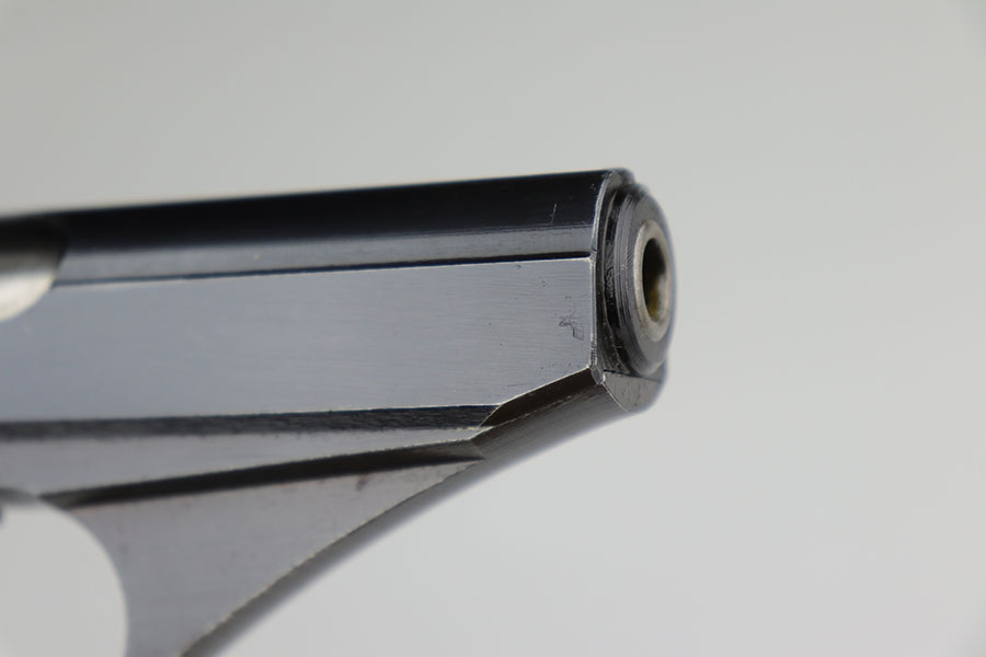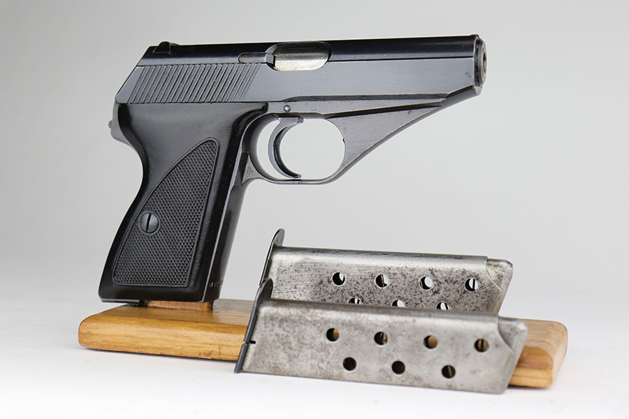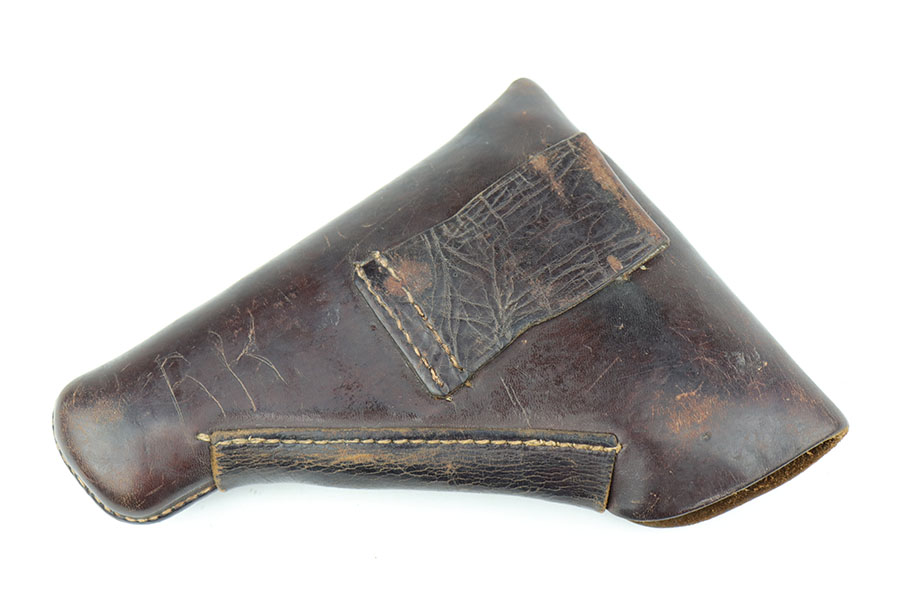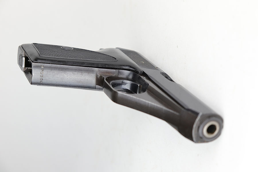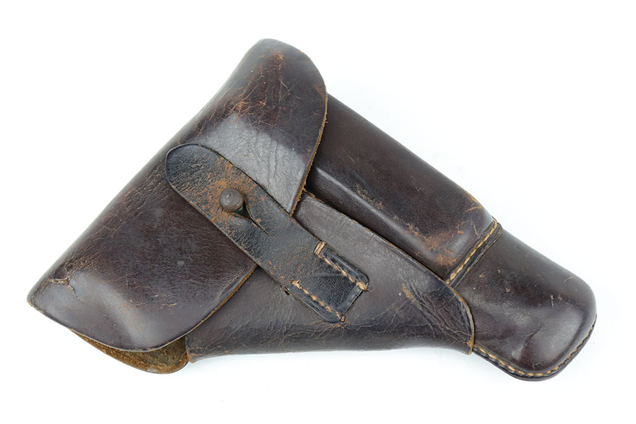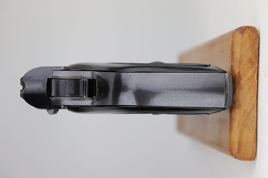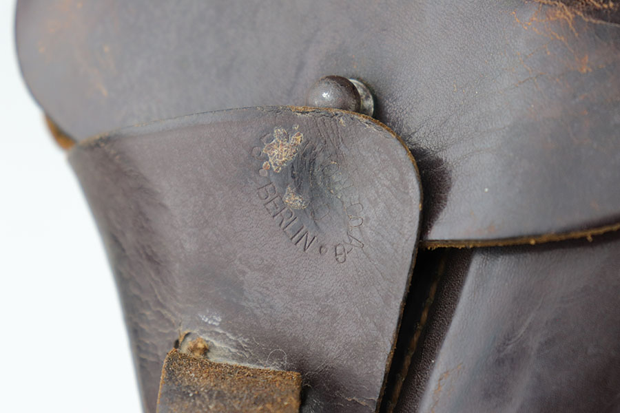 8/11/20 – This is an excellent Nazi Mauser HSc rig with the scarce black plastic grips, hence drawing comparison to the Black Widow Mauser Lugers. It has 97-98% of the original blue with minor high edge wear from the holster, and just a bit of finish loss on the bottom of the back strap. Made in 1943 and has E/135 proof on frame. Excellent bore and grips. One magazine is banner marked, the other is blank. The rig is completed by a Berlin marked, original holster.