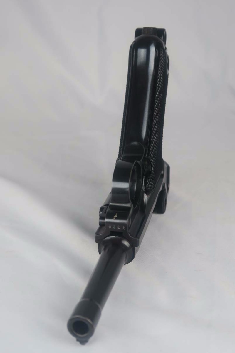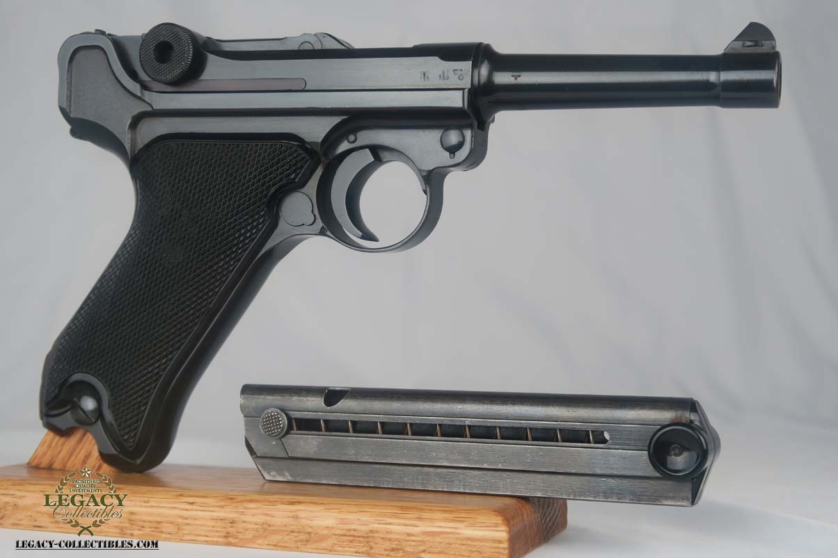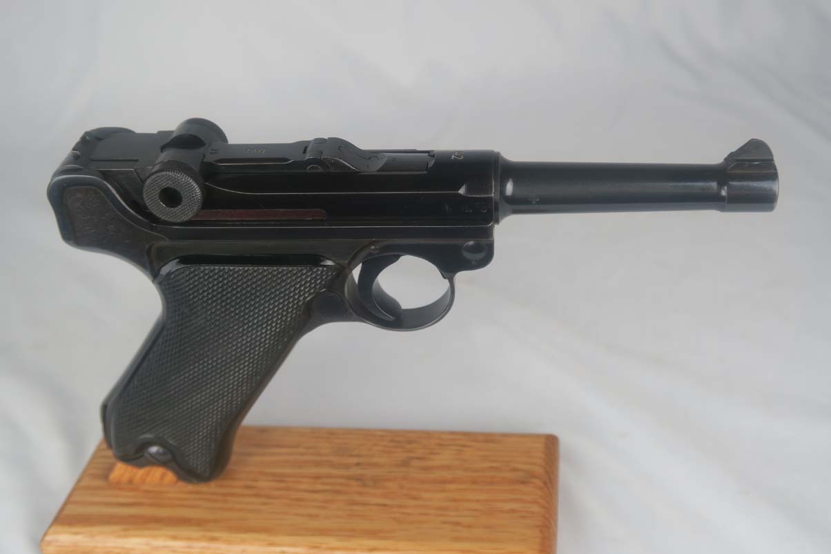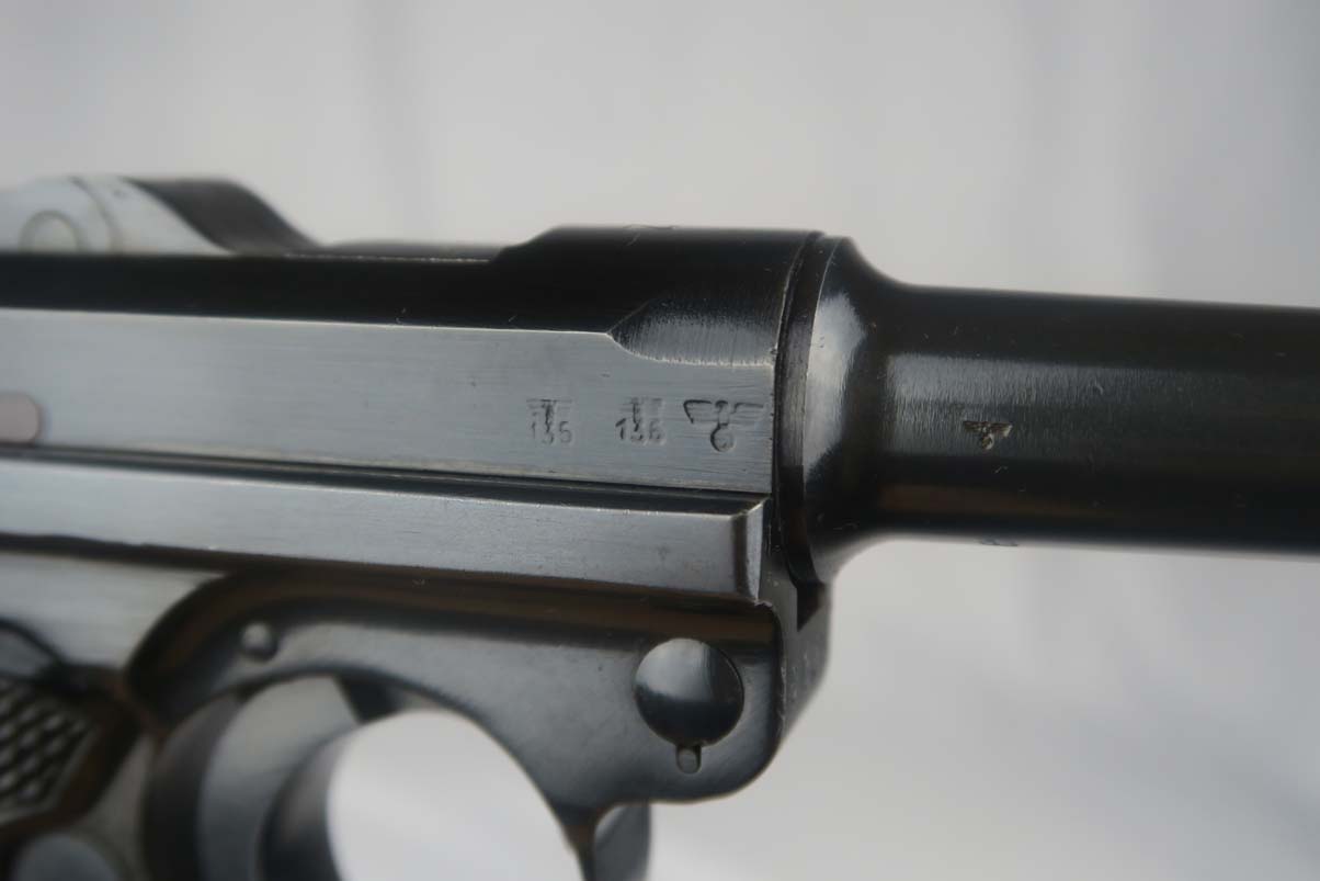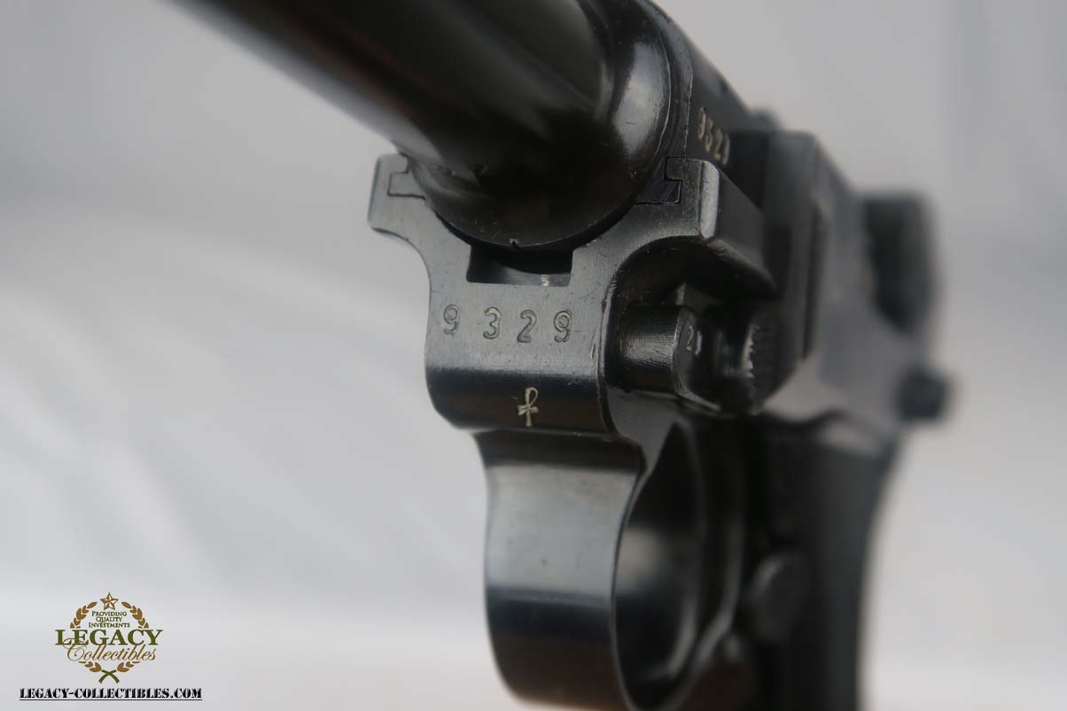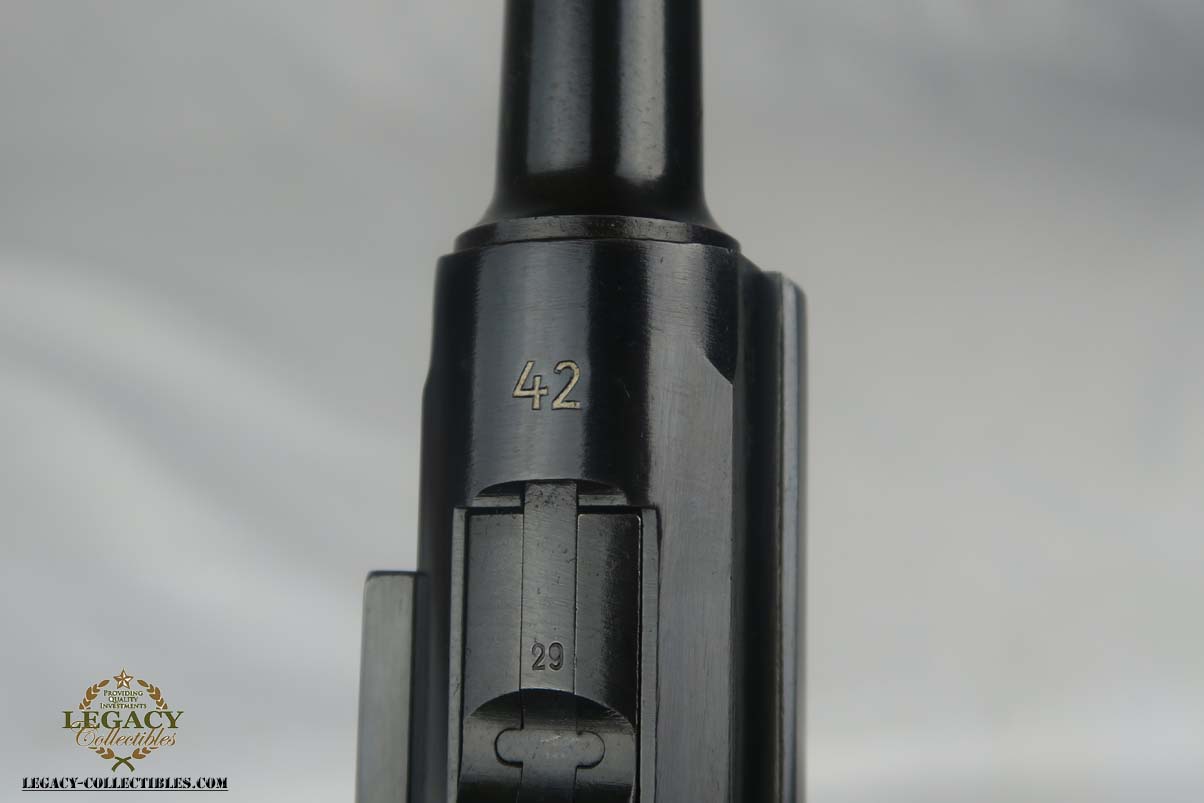 6/6/17 – This is a minty 1942 Mauser Luger, with Black Widow-style grips and magazine. The original finish rates at about 99%, with only a little edge wear on the muzzle and sideplate. All numbered parts are matching. Grips and magazine are both correct and in excellent condition. Proper E/135 proofs on the right side of the frame. Smooth mechanics and minty bore – would be a tough one to upgrade!