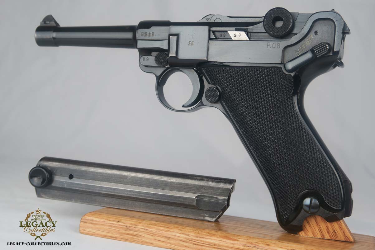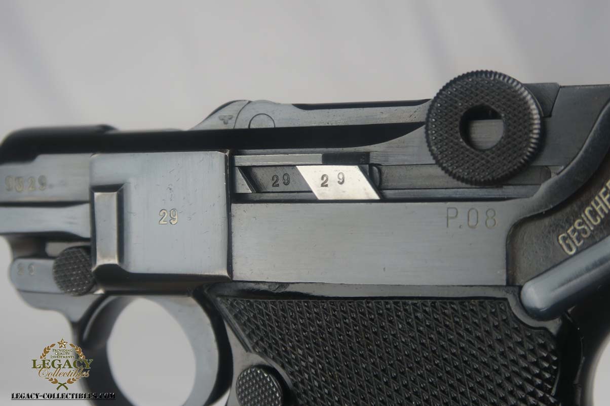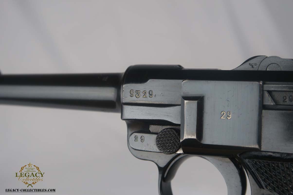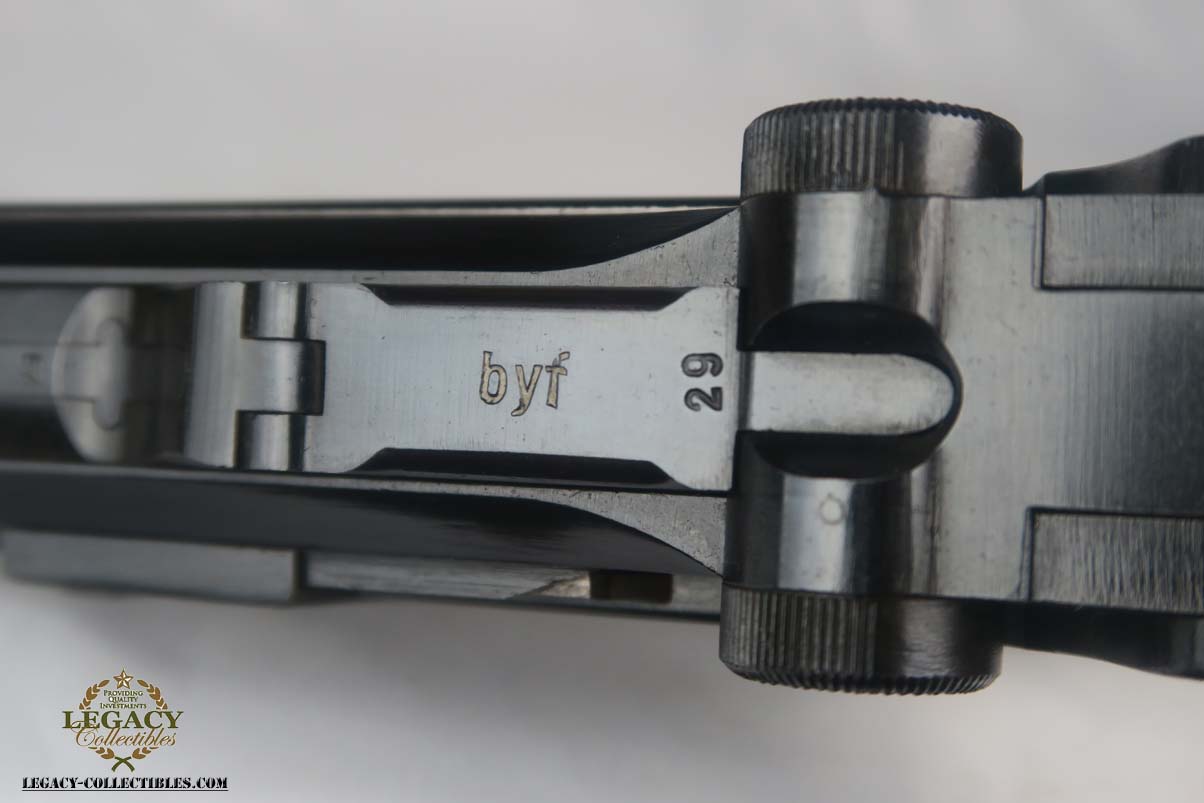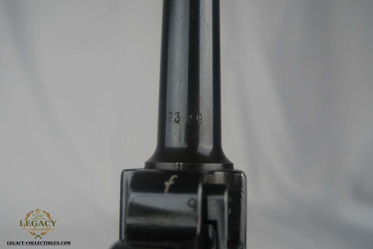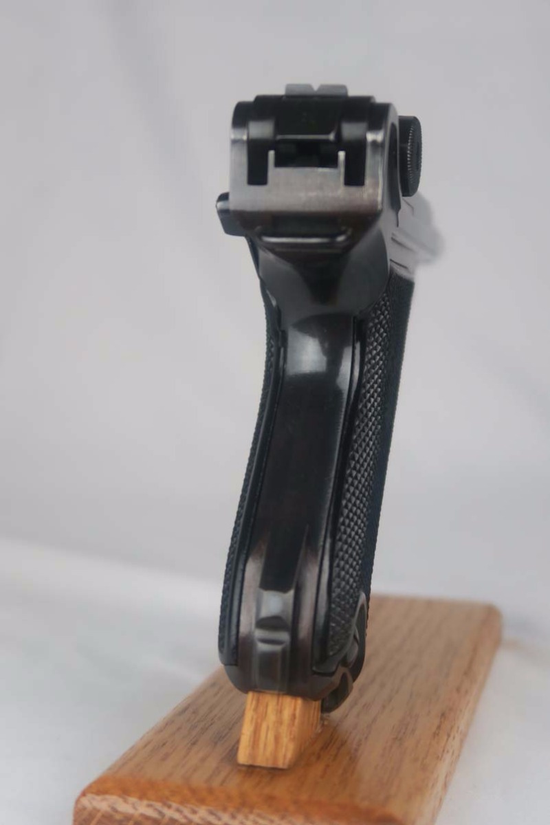 6/6/17 – This is a minty 1942 Mauser Luger, with Black Widow-style grips and magazine. The original finish rates at about 99%, with only a little edge wear on the muzzle and sideplate. All numbered parts are matching. Grips and magazine are both correct and in excellent condition. Proper E/135 proofs on the right side of the frame. Smooth mechanics and minty bore – would be a tough one to upgrade!