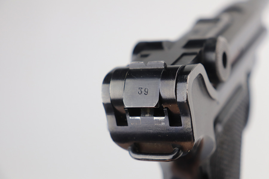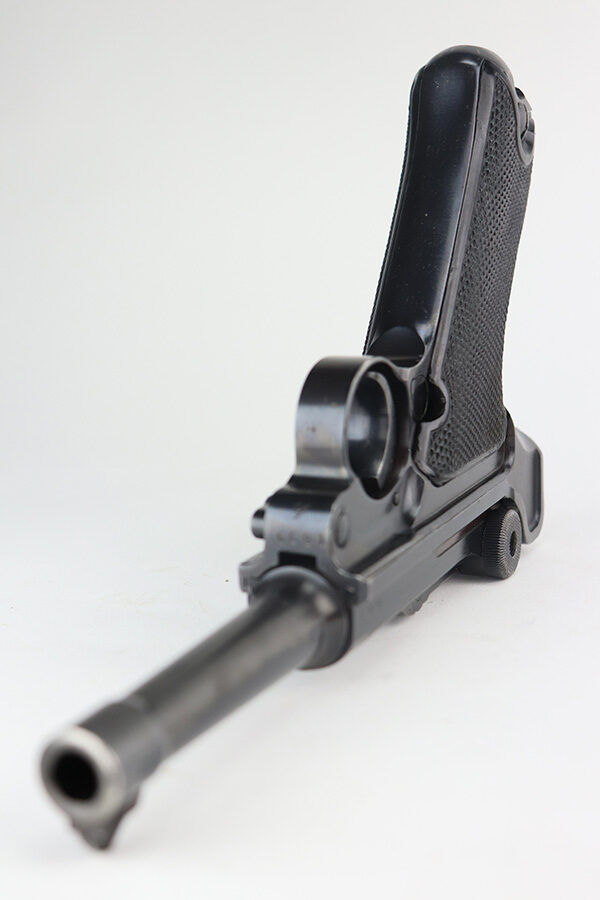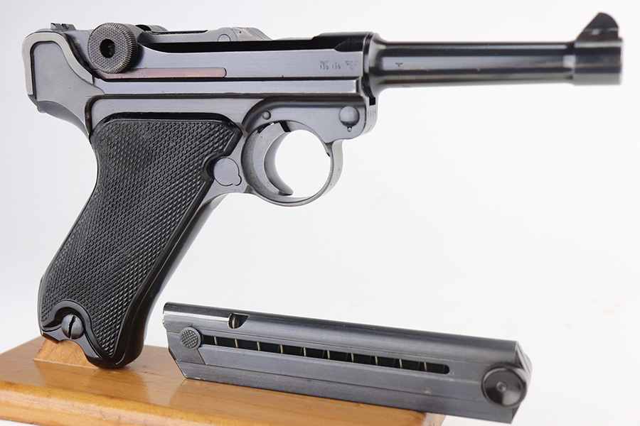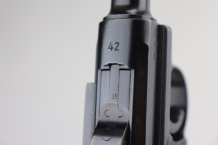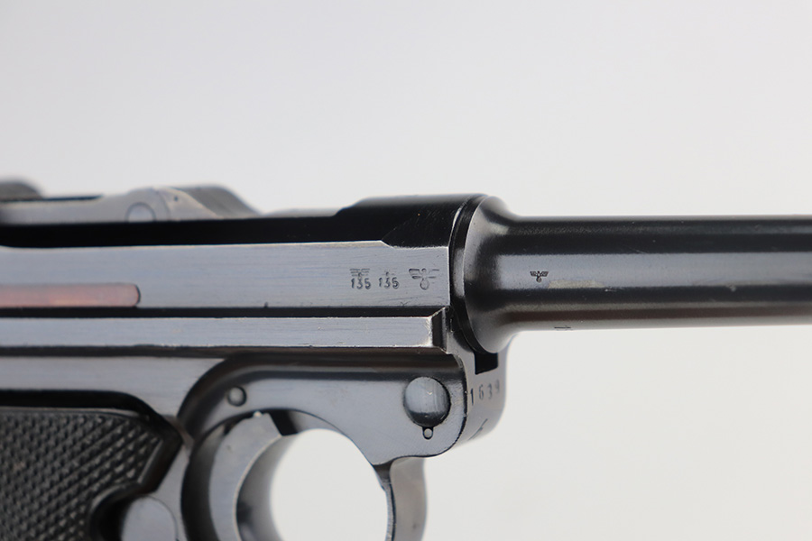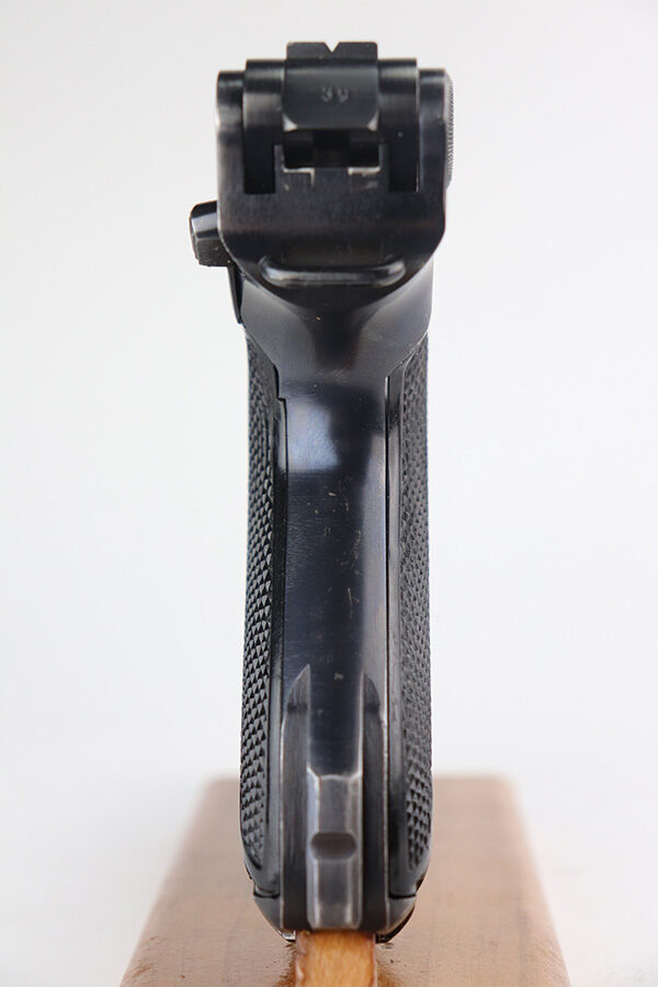 6/22/21 – This is a minty example of a “Black Widow” Mauser Luger issued to the Nazi military in 1942. It is all matching and has the proper “Eagle 135” military proofs. The rig comes with two proper black widow magazines, an “Eagle 655” Luger tool, and a rare 1942-dated waffen-proofed pigskin holster. The holster is in near-mint condition. Someone scratched their name “Hess” on the front and back of the holster, though. The gun has retained about 98% of its original finish. There are hints of wear on the side plate, side rails, and around the muzzle. Tiny handling marks on the barrel, left side of the frame, and on the straps. Excellent black widow grips. Mint bore.