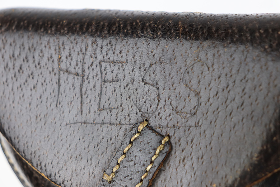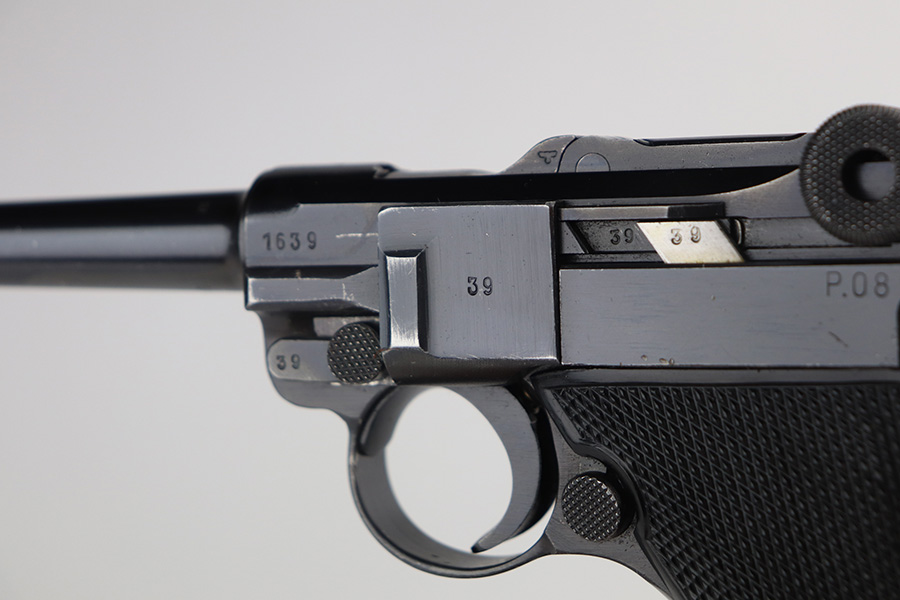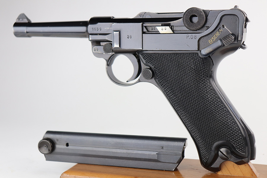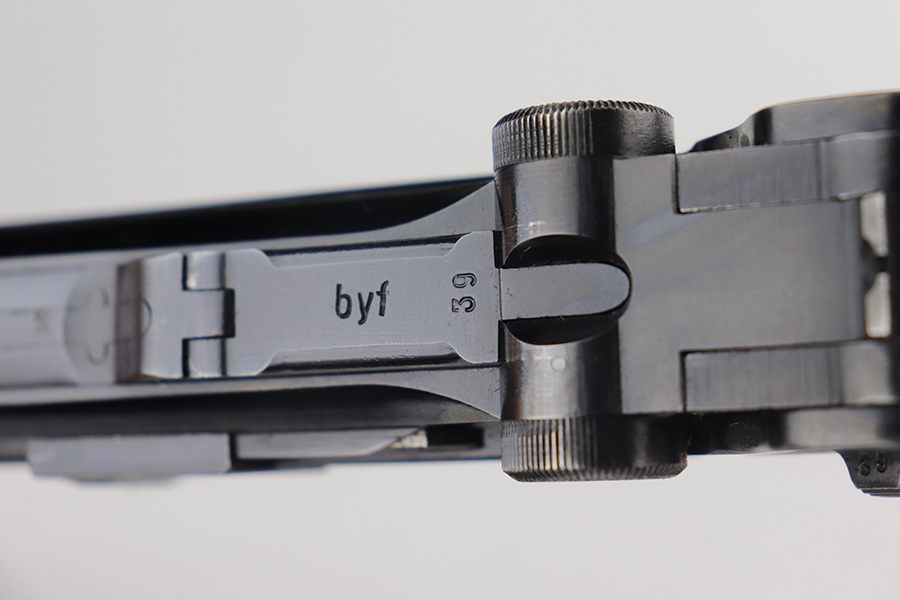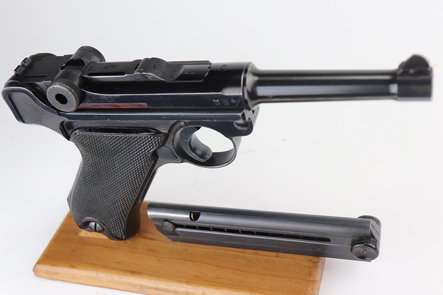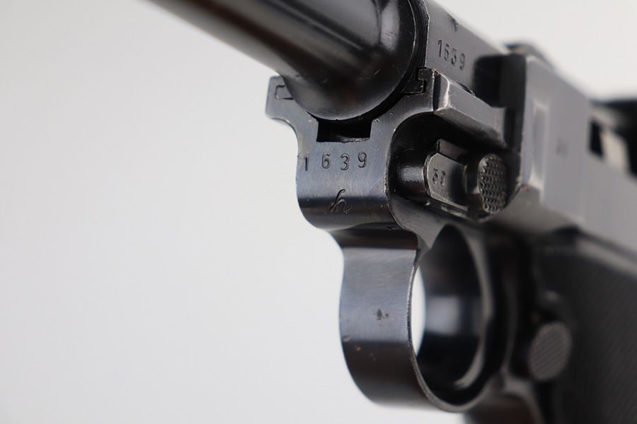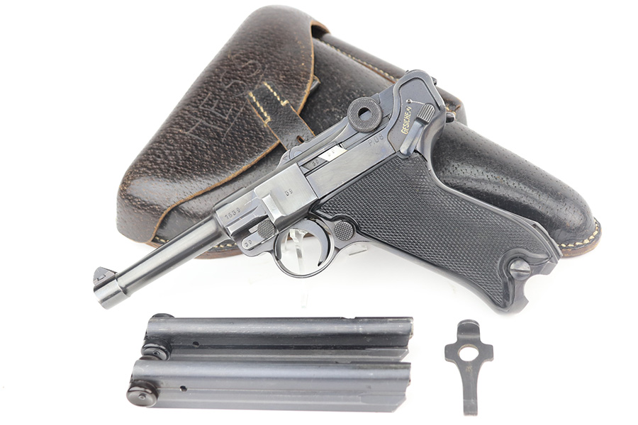 6/22/21 – This is a minty example of a “Black Widow” Mauser Luger issued to the Nazi military in 1942. It is all matching and has the proper “Eagle 135” military proofs. The rig comes with two proper black widow magazines, an “Eagle 655” Luger tool, and a rare 1942-dated waffen-proofed pigskin holster. The holster is in near-mint condition. Someone scratched their name “Hess” on the front and back of the holster, though. The gun has retained about 98% of its original finish. There are hints of wear on the side plate, side rails, and around the muzzle. Tiny handling marks on the barrel, left side of the frame, and on the straps. Excellent black widow grips. Mint bore.