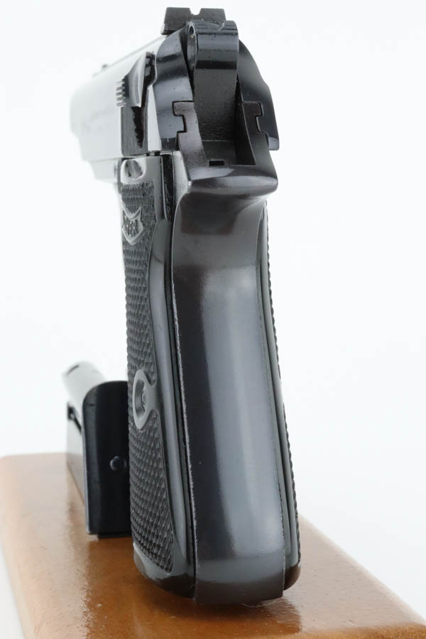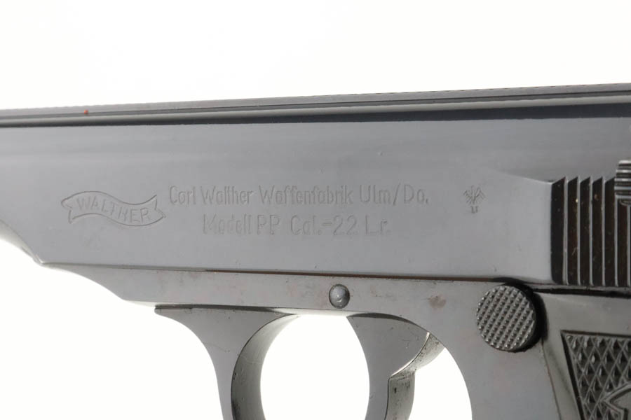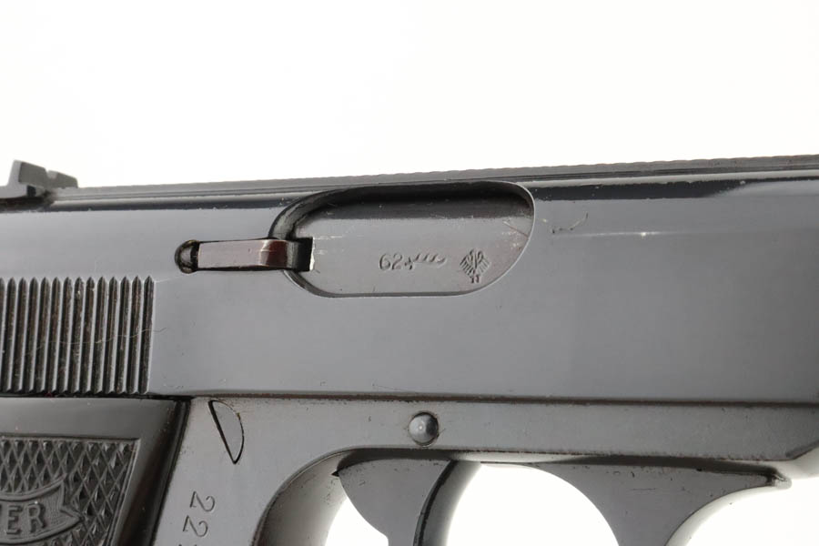 7/10/24 – This is a minty example of a Walther PP manufactured in 1962 and chambered in .22 LR. All matching. Small import mark on the edge of the magazine well. It comes with a period-correct box (not numbered), owners manual, and spare magazine. We believe the frame has been refinished, because there is some minor pin-pricking under the finish on the grip straps. In any case, there is almost no actual finish loss. Fitted with black plastic grips. Mint bore.