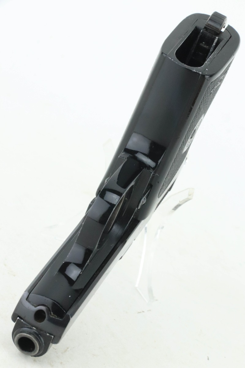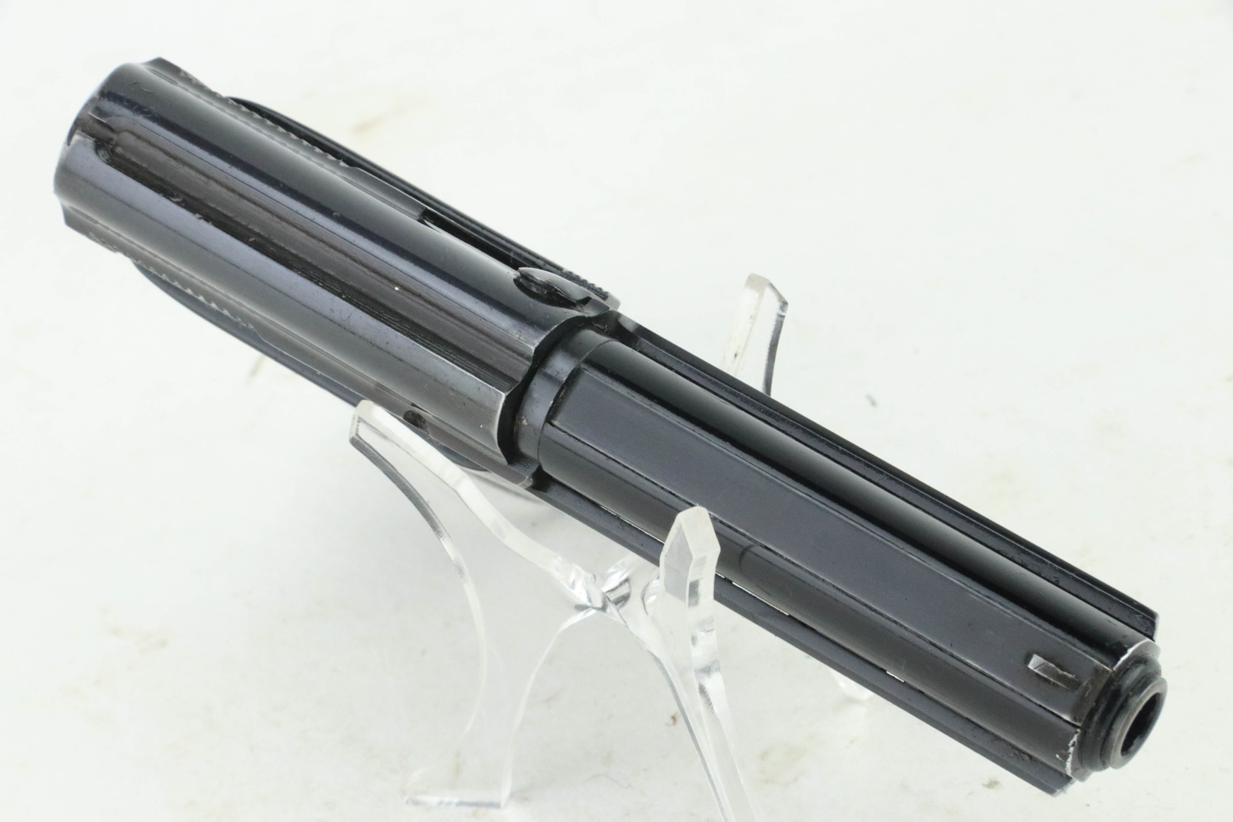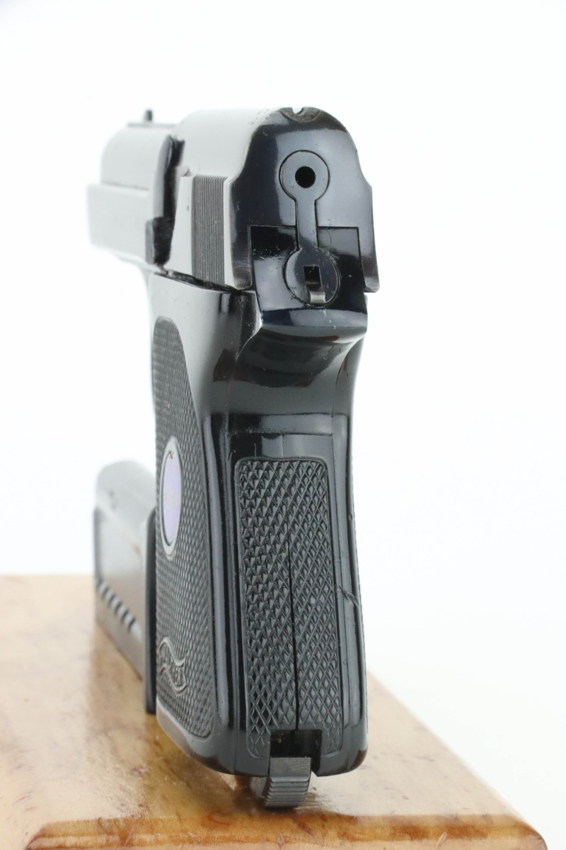 9/11/24 – This is a near-mint example of a Walther Model TP, manufactured in 1967 and chambered in 6.35mm or .25 ACP. All matching, no import marks. It comes with a period-correct box that is not numbered and one proper magazine. There are just hints of high edge and muzzle wear. Fitted with excellent black plastic grips. Mint bore.