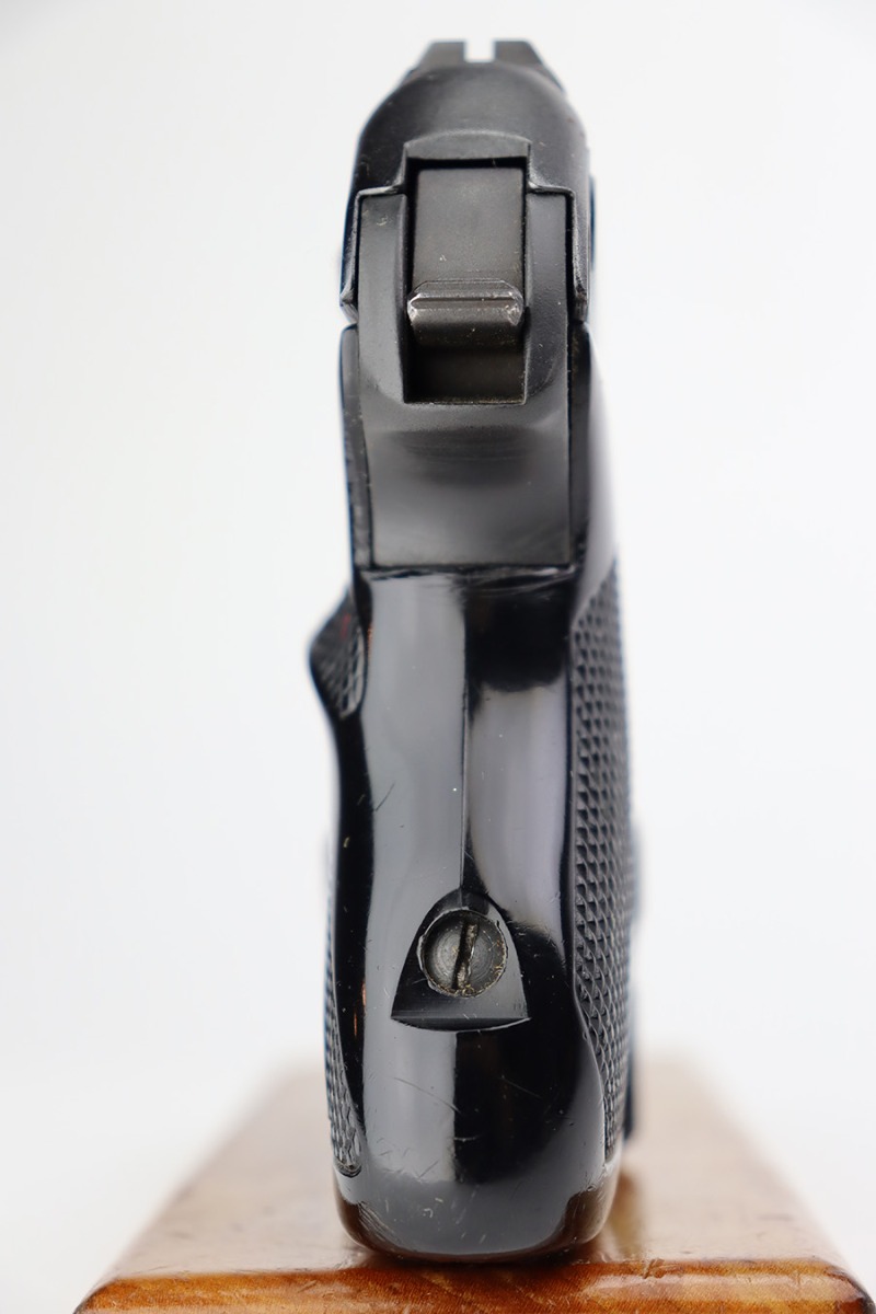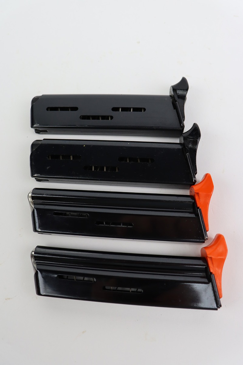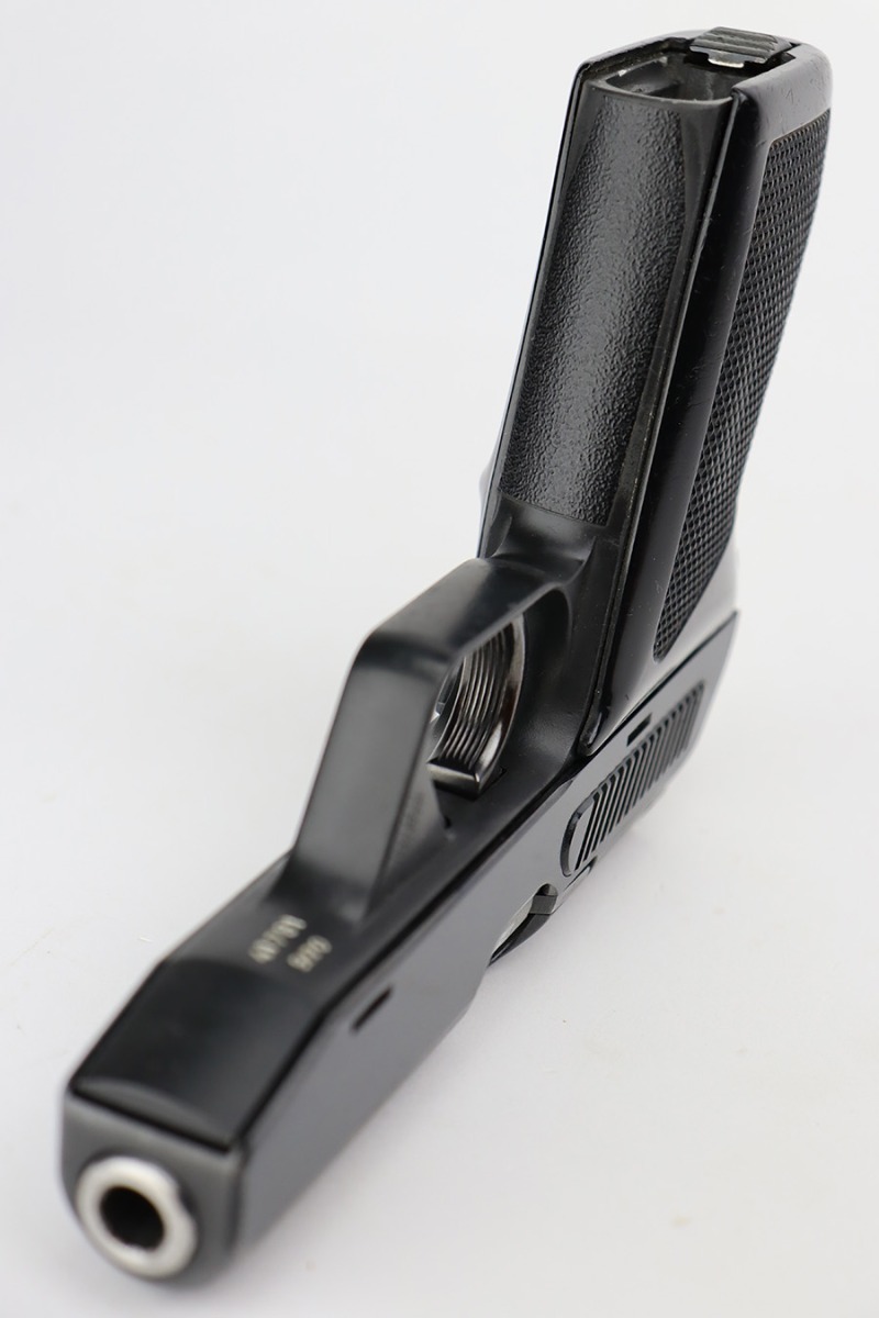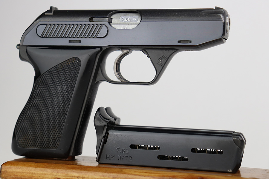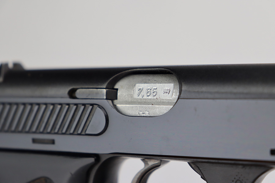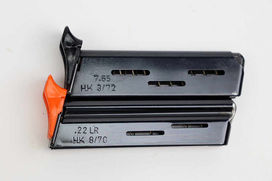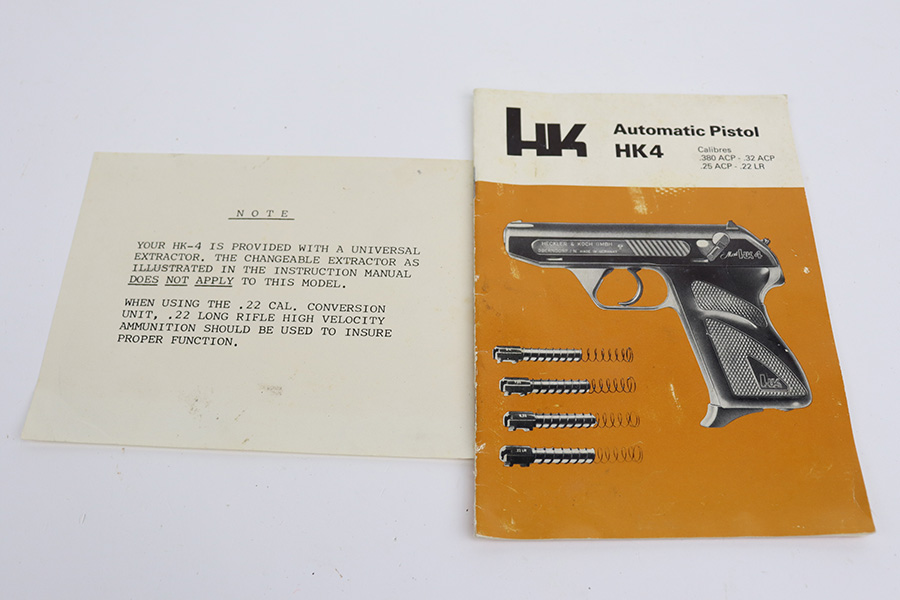 8/8/23 – This is a near-mint example of a an HK4, manufactured in 1970 and chambered in 7.65mm. It is matching and has the proper West German proofs. It comes with a period-correct box (not numbered), two 1972-dated finger extension magazines, and owners manual. It also comes with a boxed .22 Caliber conversion kit, which includes a barrel, recoil spring, screw driver (with cleaning chain), and two .22 caliber finger extension magazines. The .22 Cal barrel is numbered and matches the gun. The gun itself has retained nearly all of its finish with just a hint of wear around the muzzle. Fitted with very nice black plastic grips – some light scratching and scuffing on both sides. Mint bore.