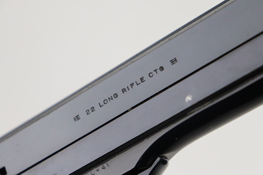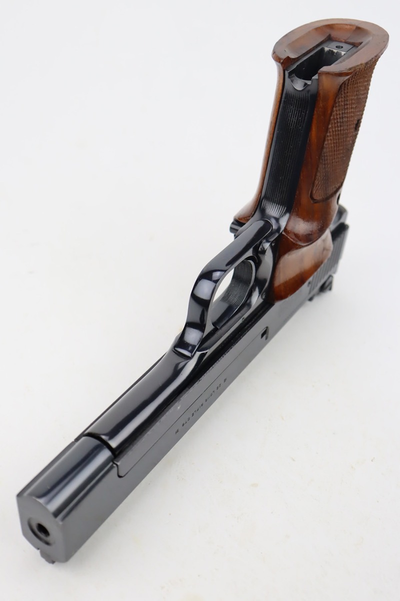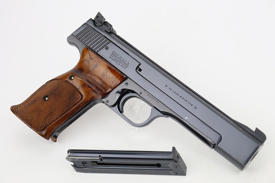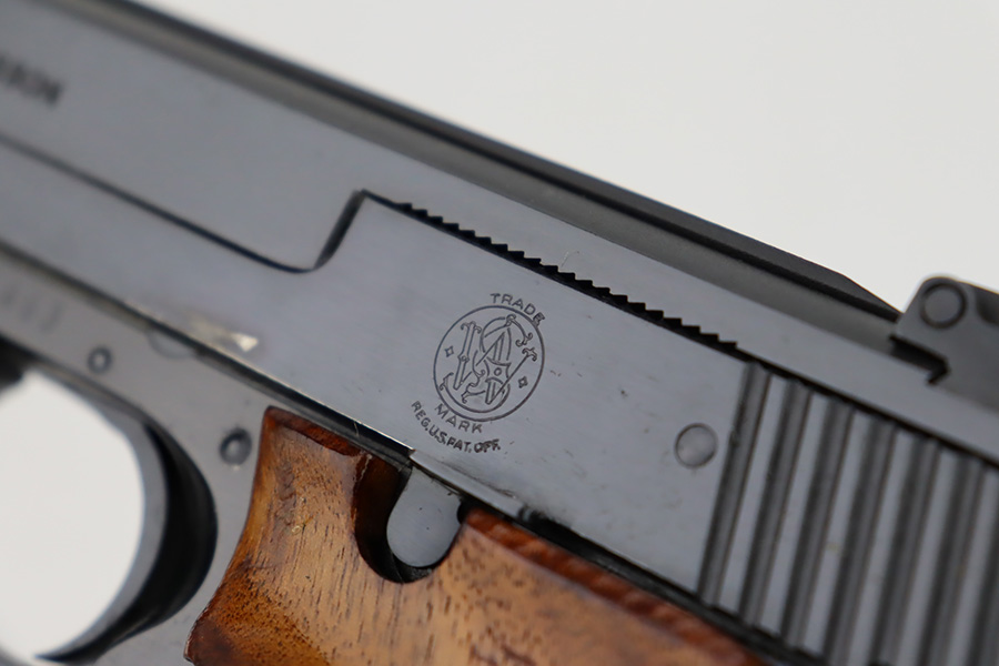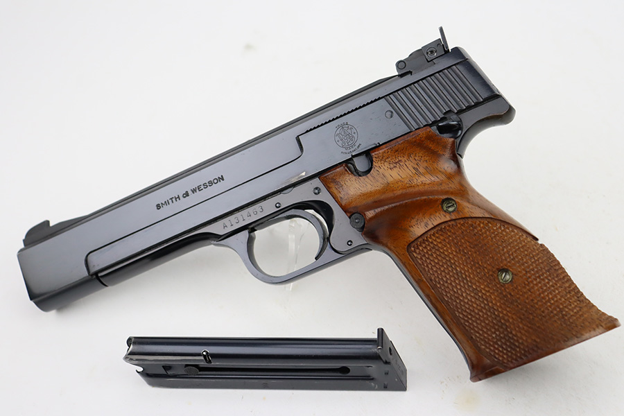 9/27/23 – This is a near-mint Smith & Wesson Model 41, manufactured in 1970 and chambered in .22 LR. It comes with a period-correct box, but it is mismatched. The gun itself has retained nearly all of its original high polish finish with one small spot of wear on the left side of the slide and one small spot on the right. Beautiful wood grips. Mint bore.