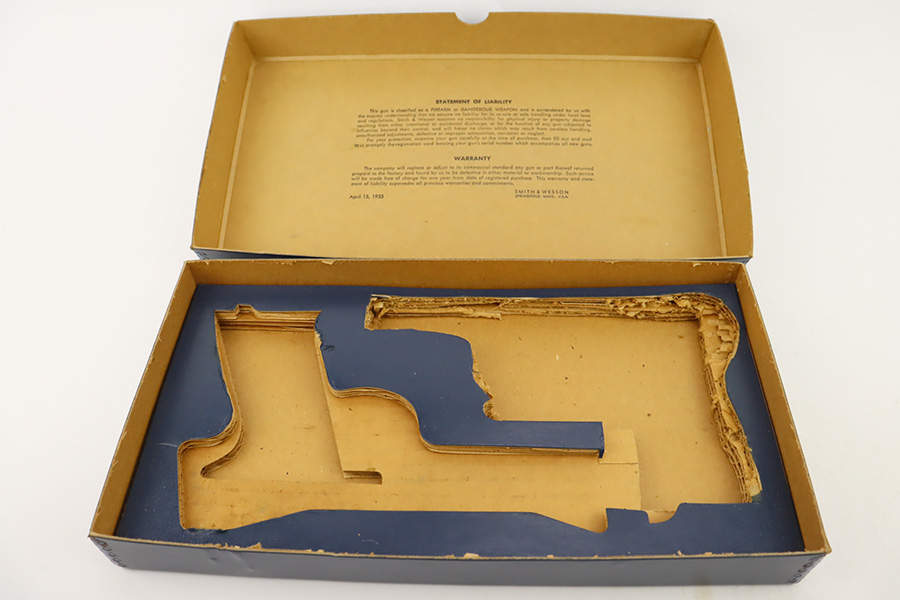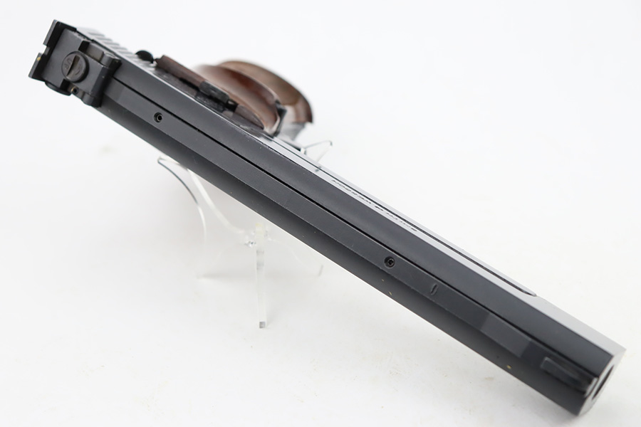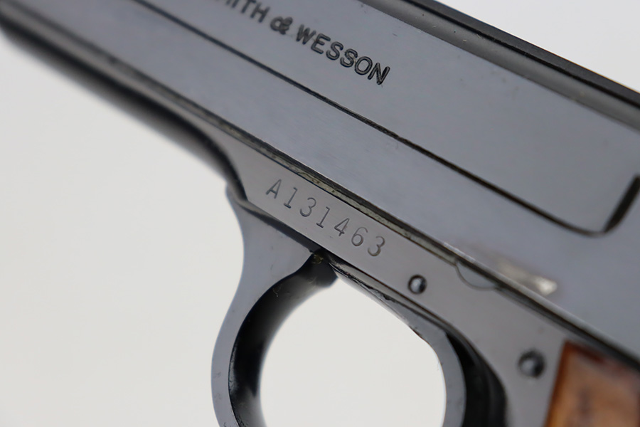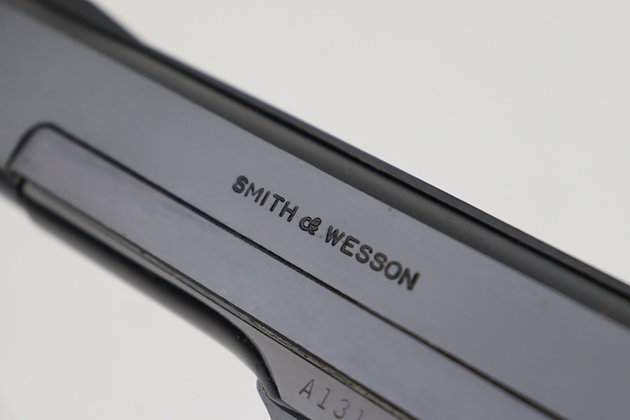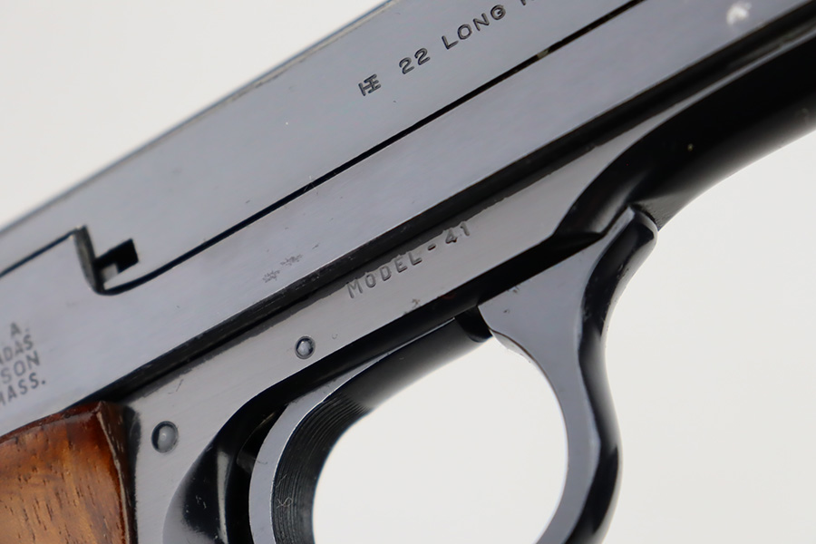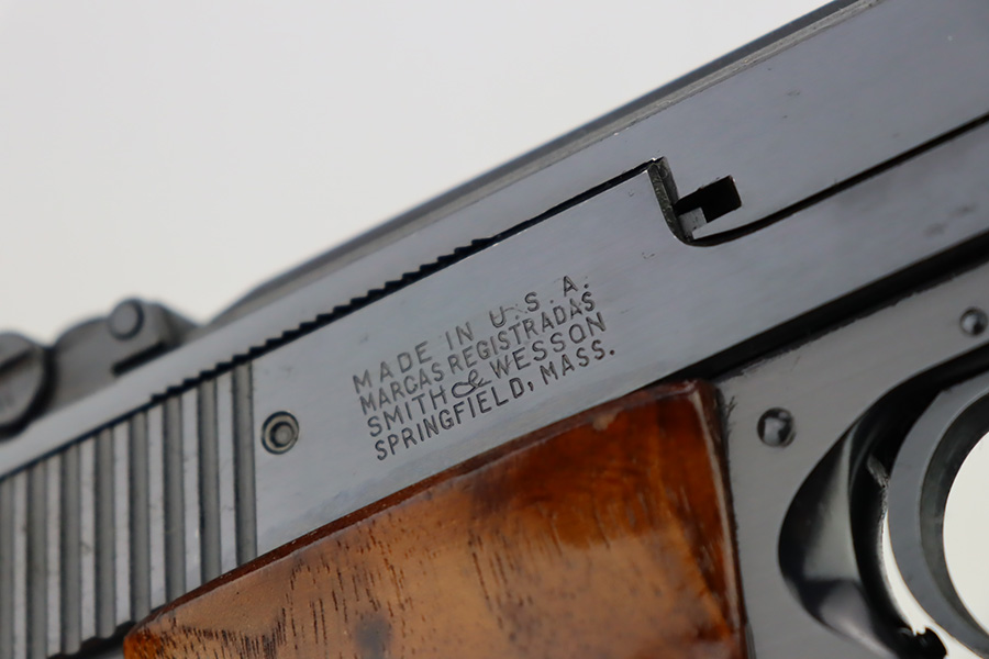 9/27/23 – This is a near-mint Smith & Wesson Model 41, manufactured in 1970 and chambered in .22 LR. It comes with a period-correct box, but it is mismatched. The gun itself has retained nearly all of its original high polish finish with one small spot of wear on the left side of the slide and one small spot on the right. Beautiful wood grips. Mint bore.