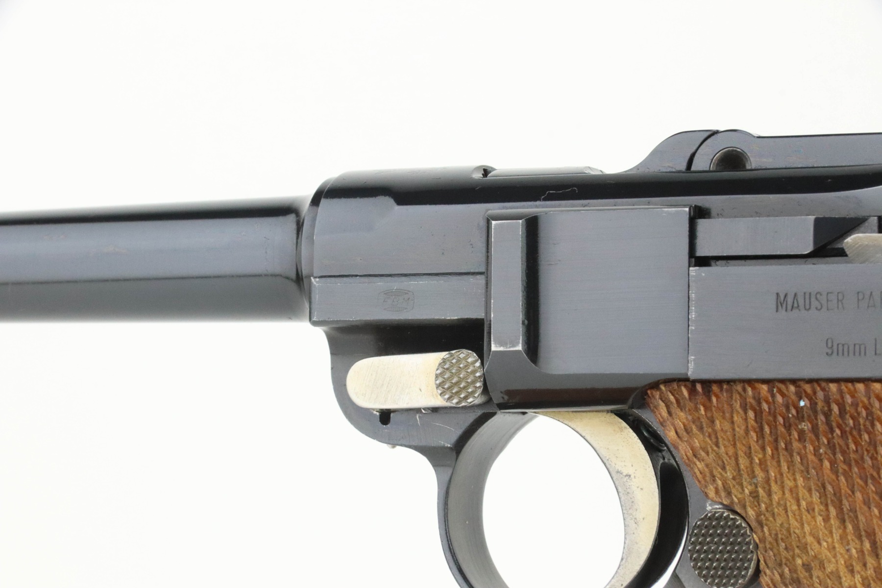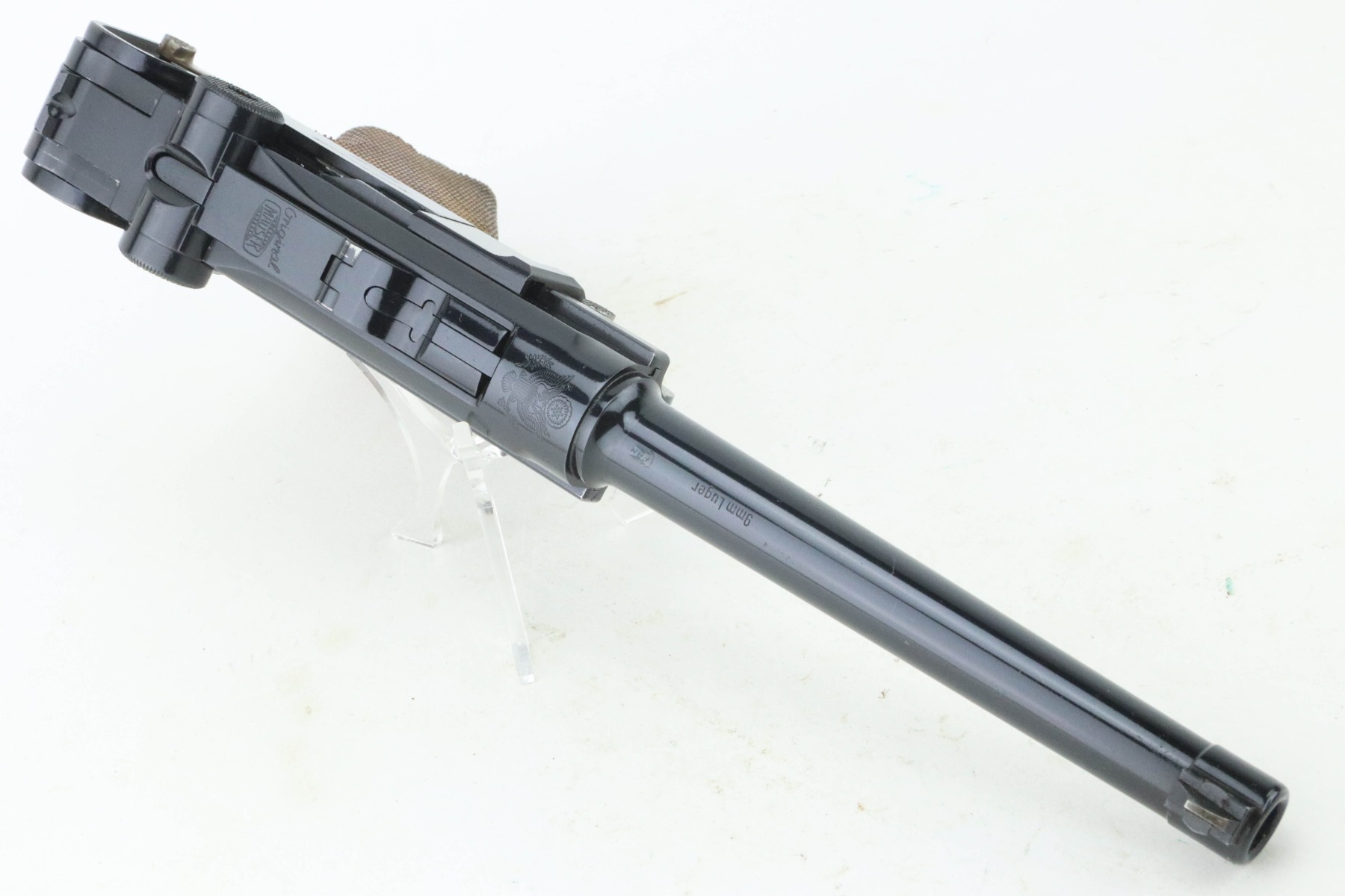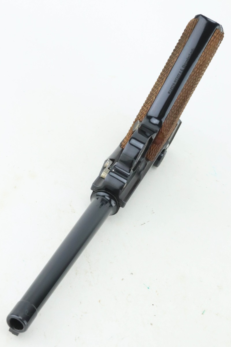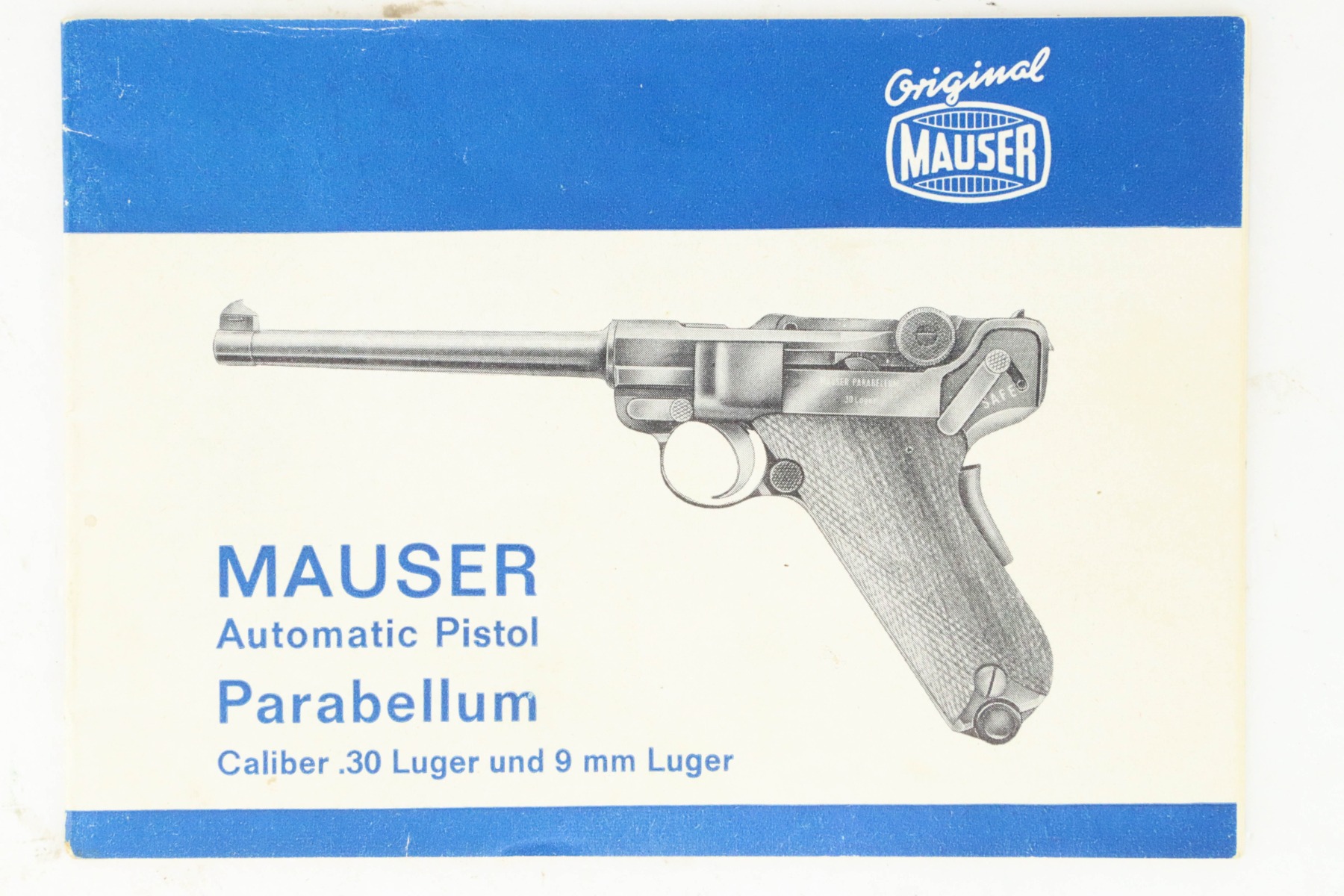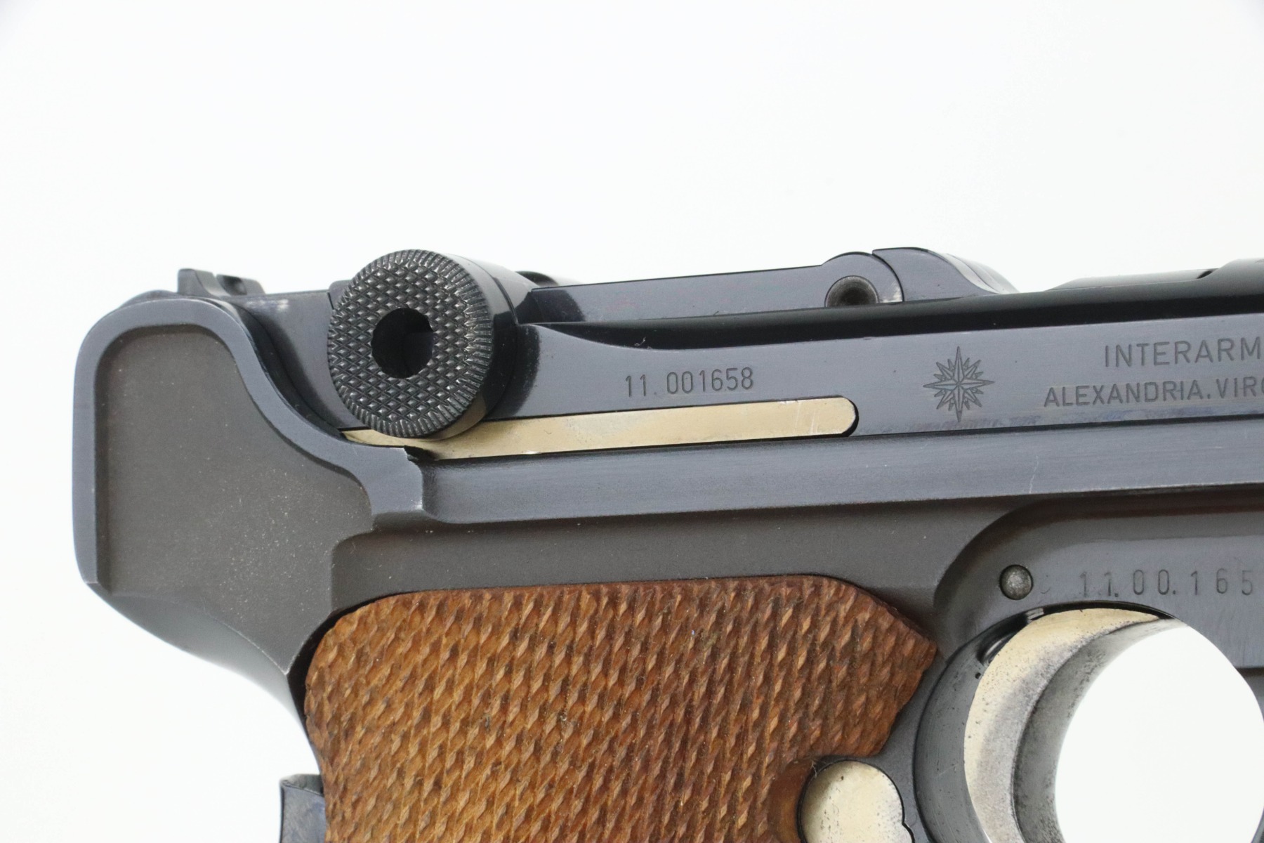 8/27/24 – This is a near-mint example of a M1906 pattern Mauser / Interarms American Eagle Luger, manufactured in the 1970’s. Chambered in 9mm Luger with a 5 inch barrel. It has retained virtually all of its high polish but there are a few tiny surface scratches here and there and one small dot of oxidation on the right side of the barrel. Fitted with mint wood grips. Minty bore. It comes with its original matching-numbered box, owners manual, matching-numbered test target, two magazines, tool, and cleaning brush. The box itself is tattered and repaired with tape.