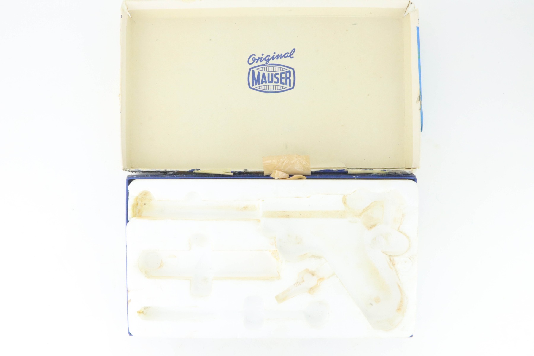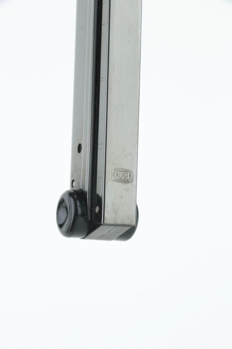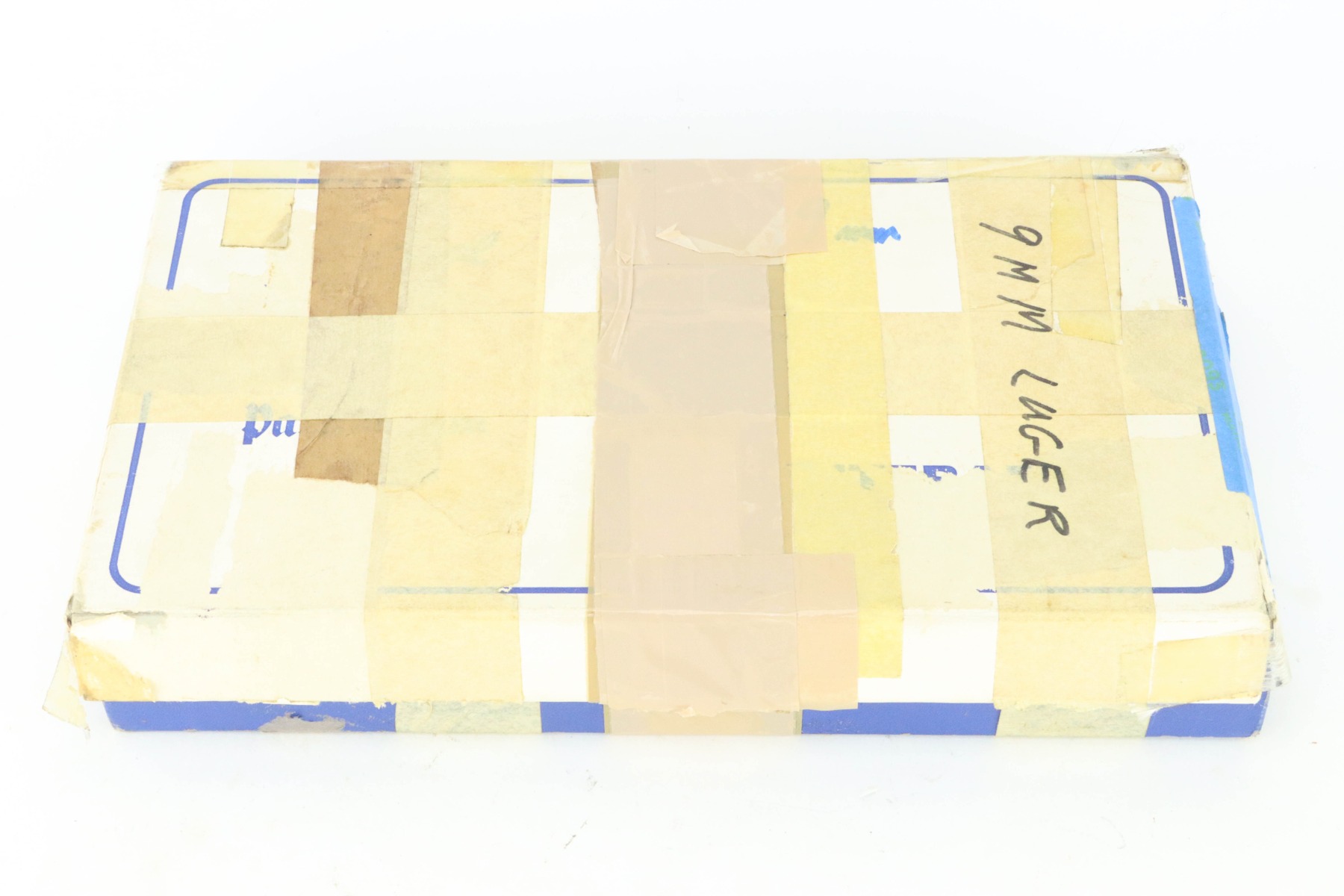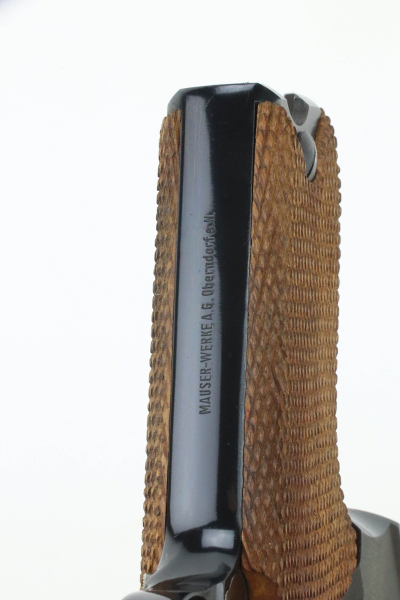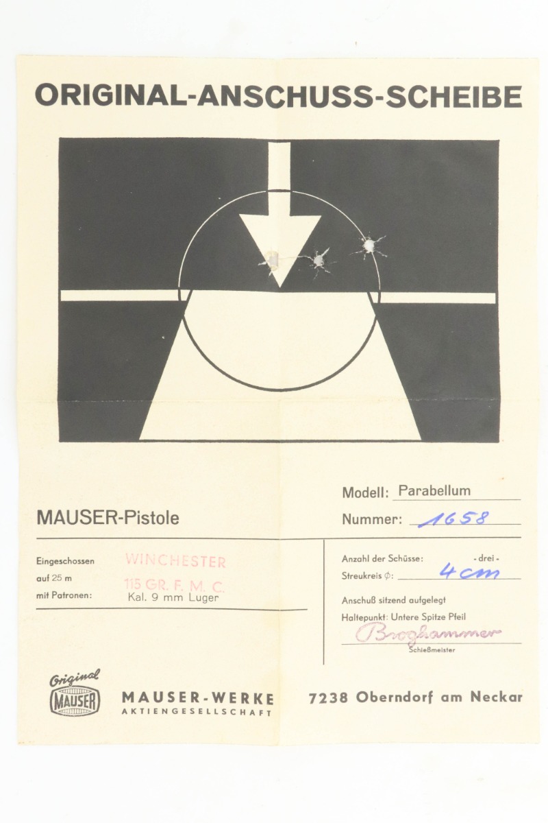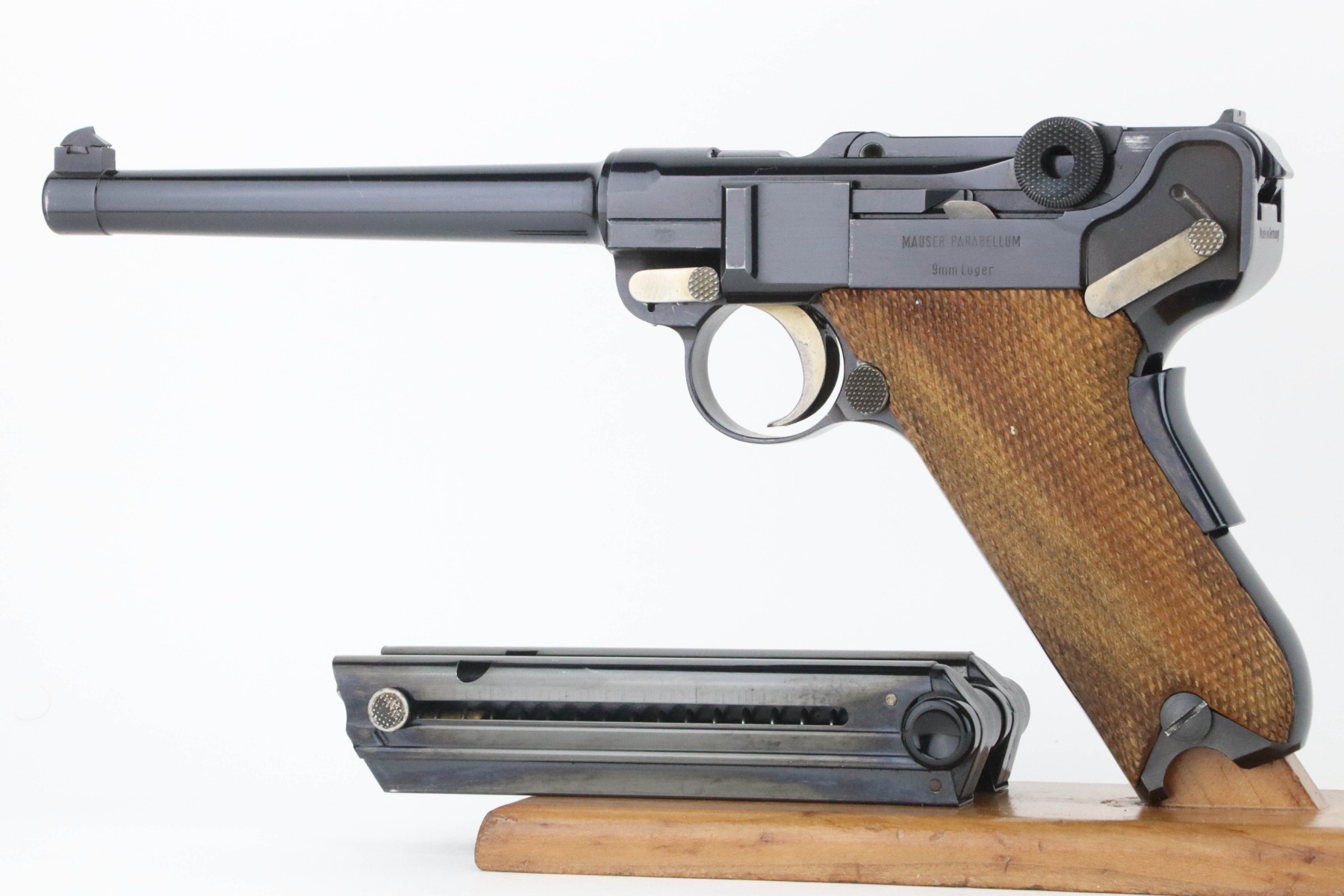 8/27/24 – This is a near-mint example of a M1906 pattern Mauser / Interarms American Eagle Luger, manufactured in the 1970’s. Chambered in 9mm Luger with a 5 inch barrel. It has retained virtually all of its high polish but there are a few tiny surface scratches here and there and one small dot of oxidation on the right side of the barrel. Fitted with mint wood grips. Minty bore. It comes with its original matching-numbered box, owners manual, matching-numbered test target, two magazines, tool, and cleaning brush. The box itself is tattered and repaired with tape.