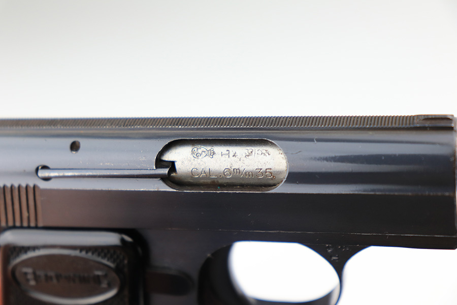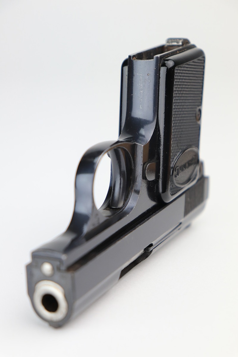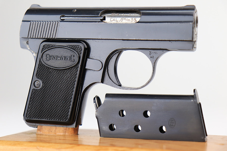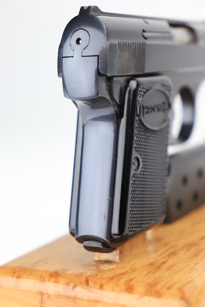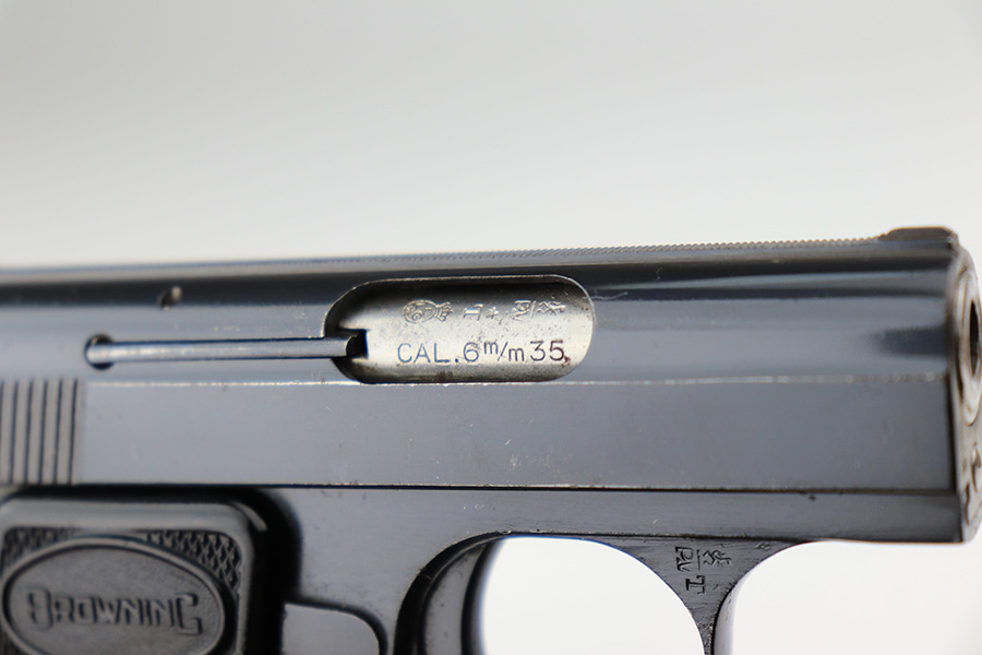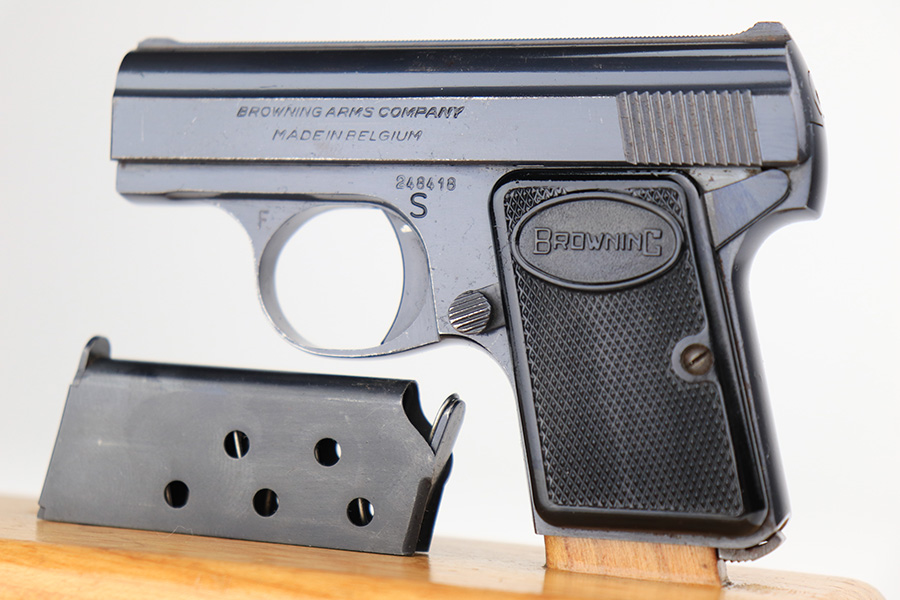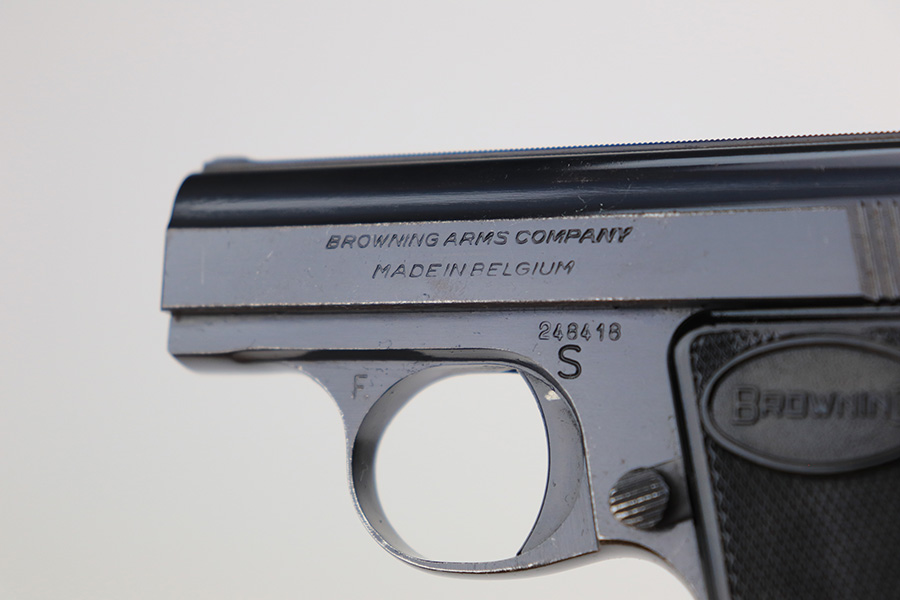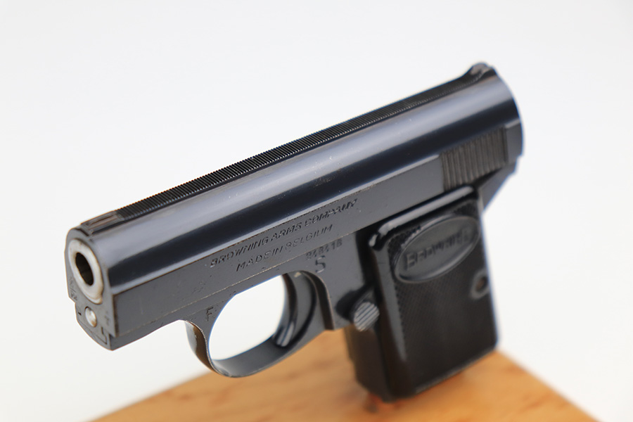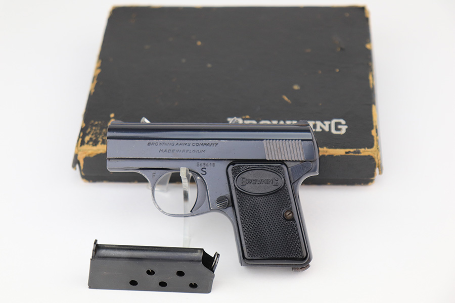 3/11/22 – This is a beautiful, minty example of a Baby Browning pistol manufactured in Belgium in 1961. The gun is all matching and has the proper Belgian proofs throughout. It comes with the original Browning box and one proper magazine. The box is lined with a red velvet interior and is hand-numbered to match the gun. The pistol has retained more than 98% of its high polish finish. There are just hints of wear on some of the high edges and some very light handling marks on the front strap and underside of the trigger guard. Comes with excellent black plastic grips. The bore is stone-mint.