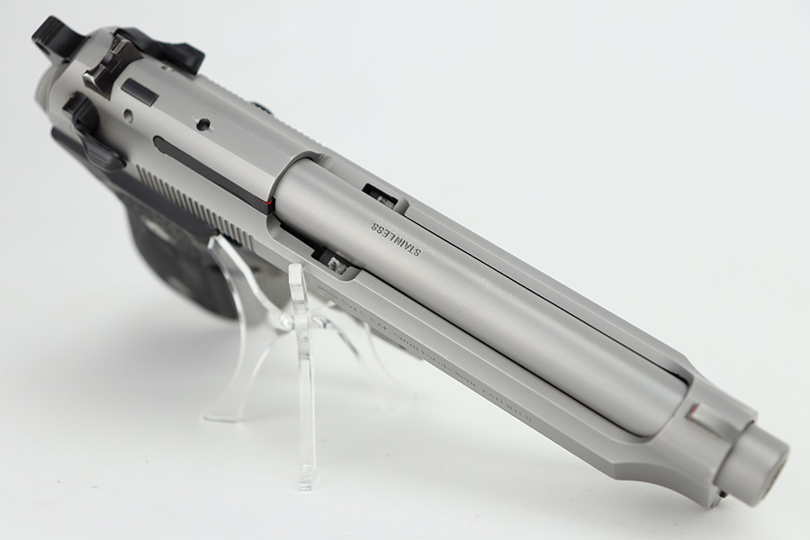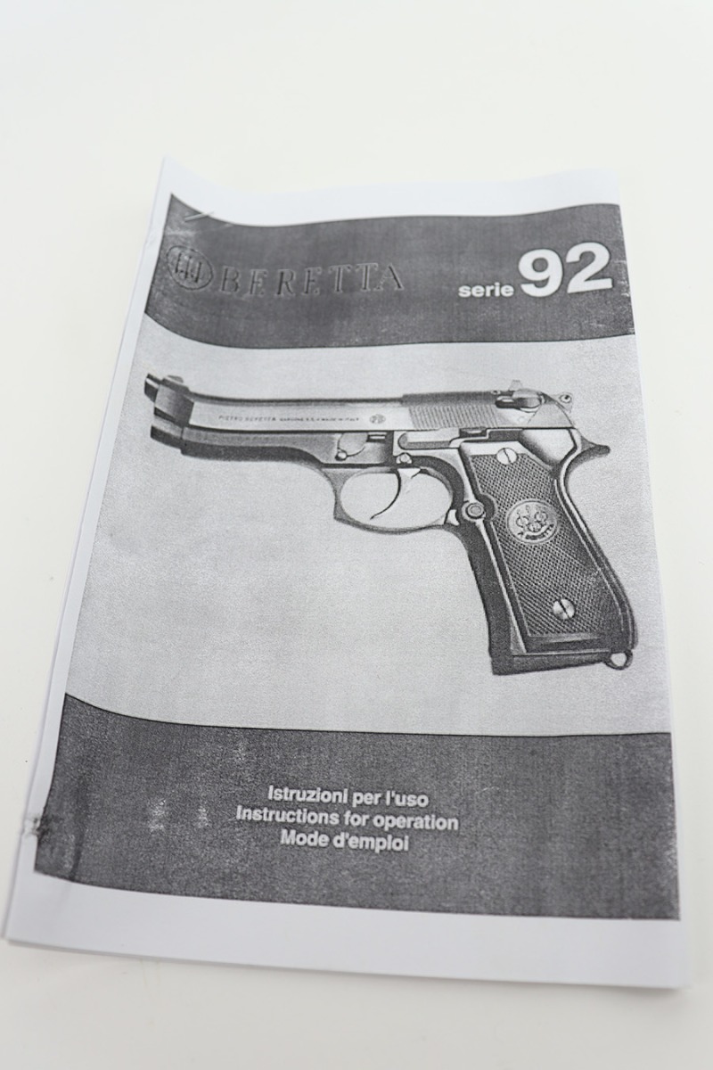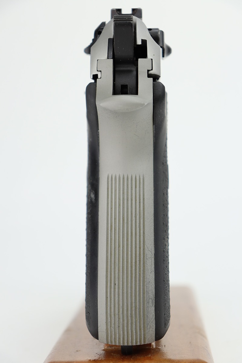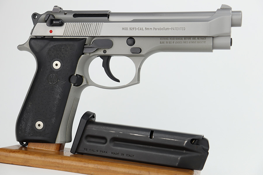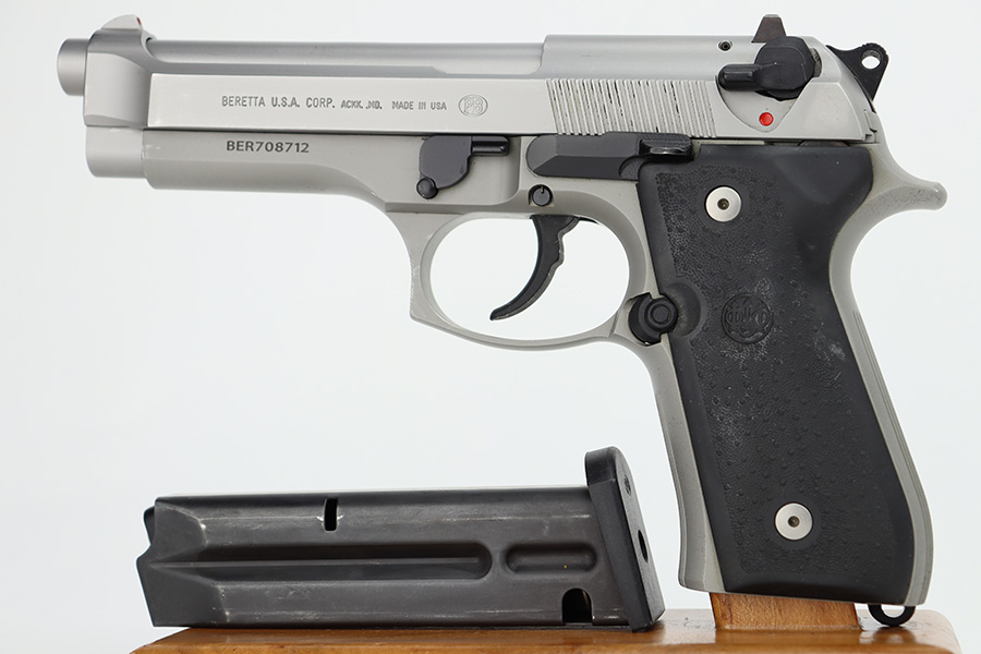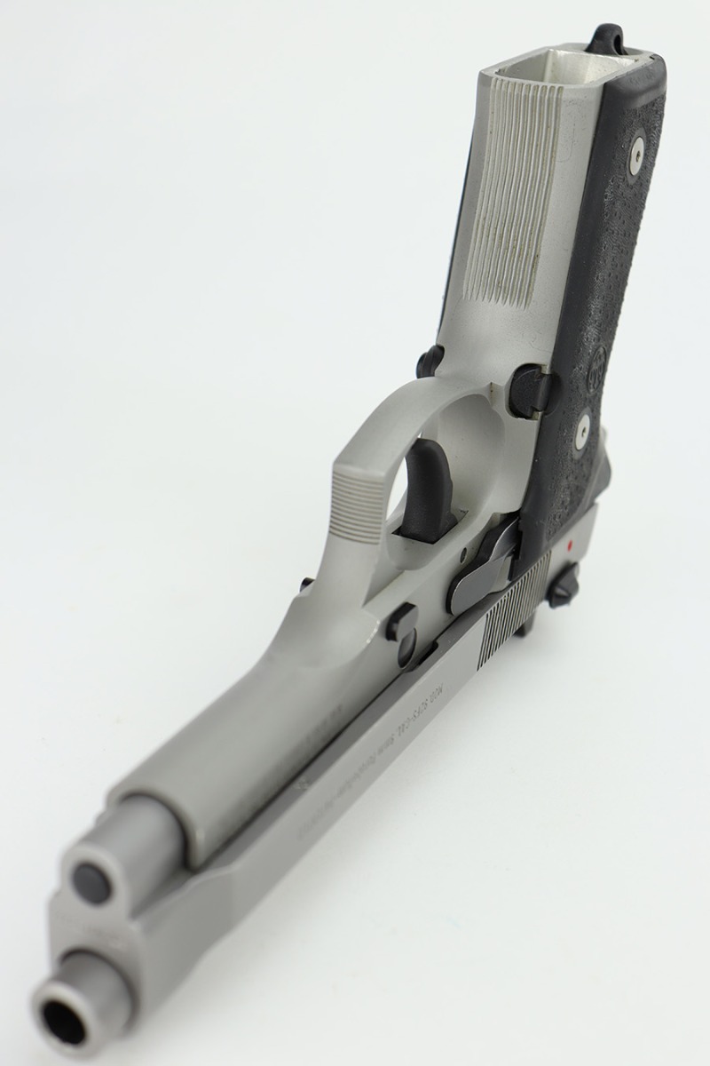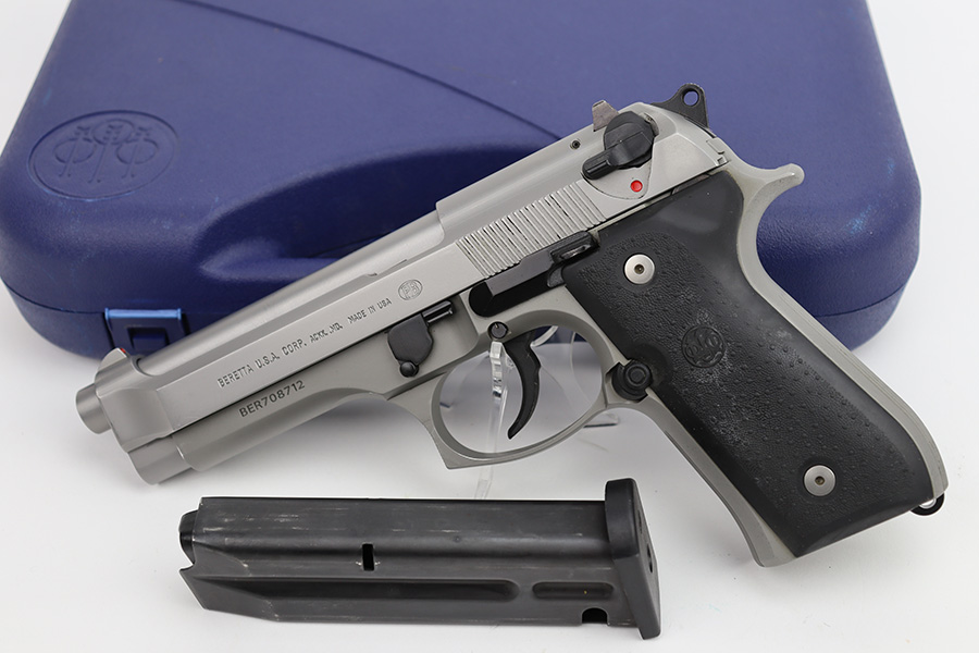 12/15/23 – This is a minty example of a Beretta 92FS, chambered in 9mm with a really nice matte stainless finish. Comes with an un-numbered hard case, one magazine, a Beretta cup, and a printed-out manual. The gun itself shows very little sign of use or wear – just a few tiny scratches and handling marks here and there. Fitted with black rubber grips. Minty bore.