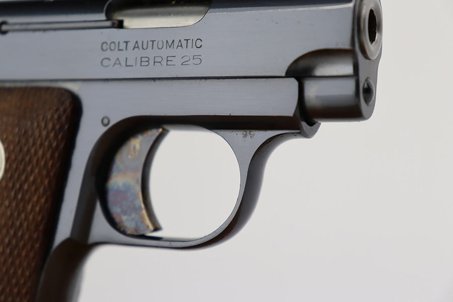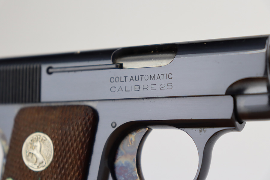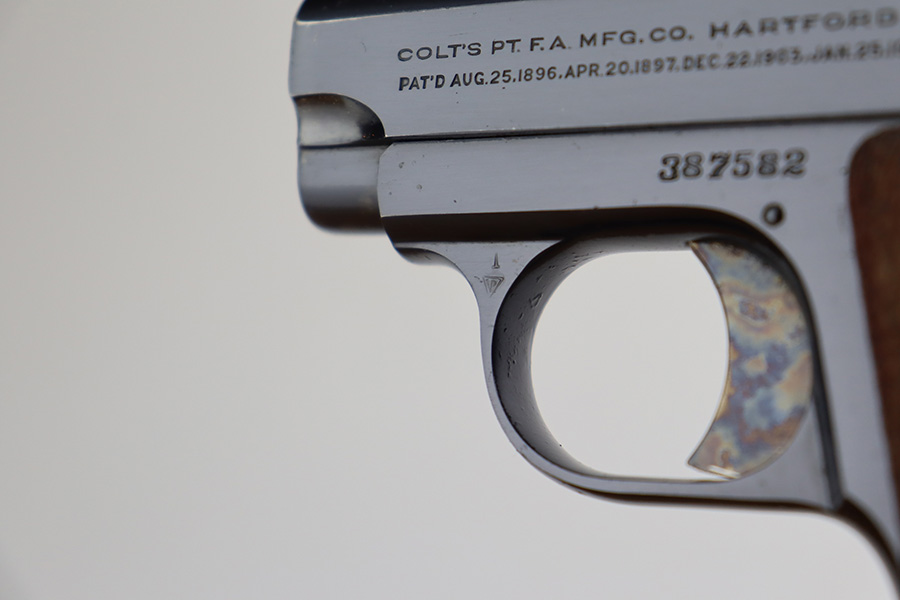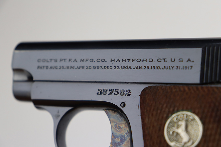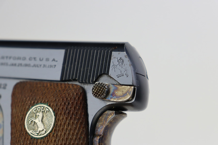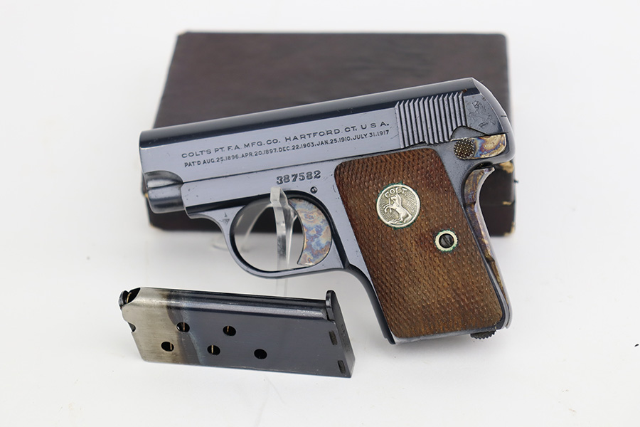 7/3/23 – This is a beautiful and near-mint Colt 1908 Vest Pocket in the original box. Made in 1930, the pistol has gorgeous case hardening on the trigger, grip safety and frame safety. Tiny bit of high edge wear but very little sign of use. Excellent Colt grips with no cracks or chips. Strong, shiny bore. The box is numbered on the bottom and matching to the pistol.