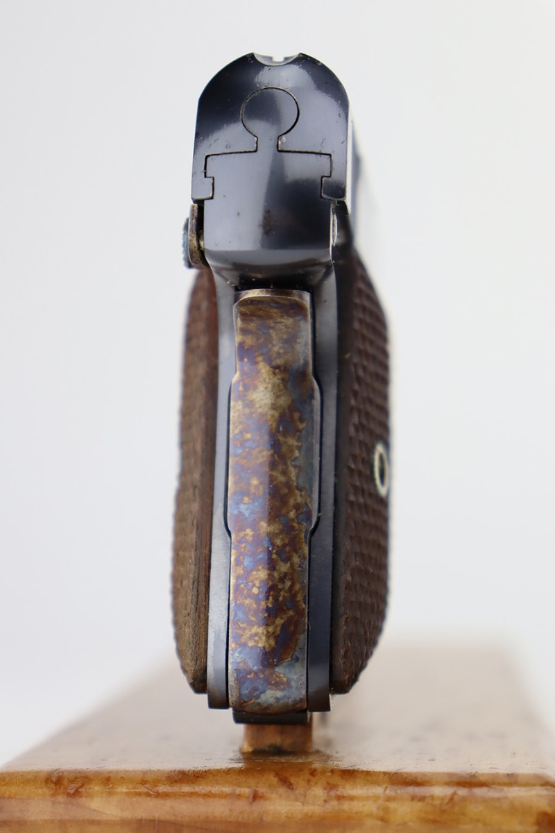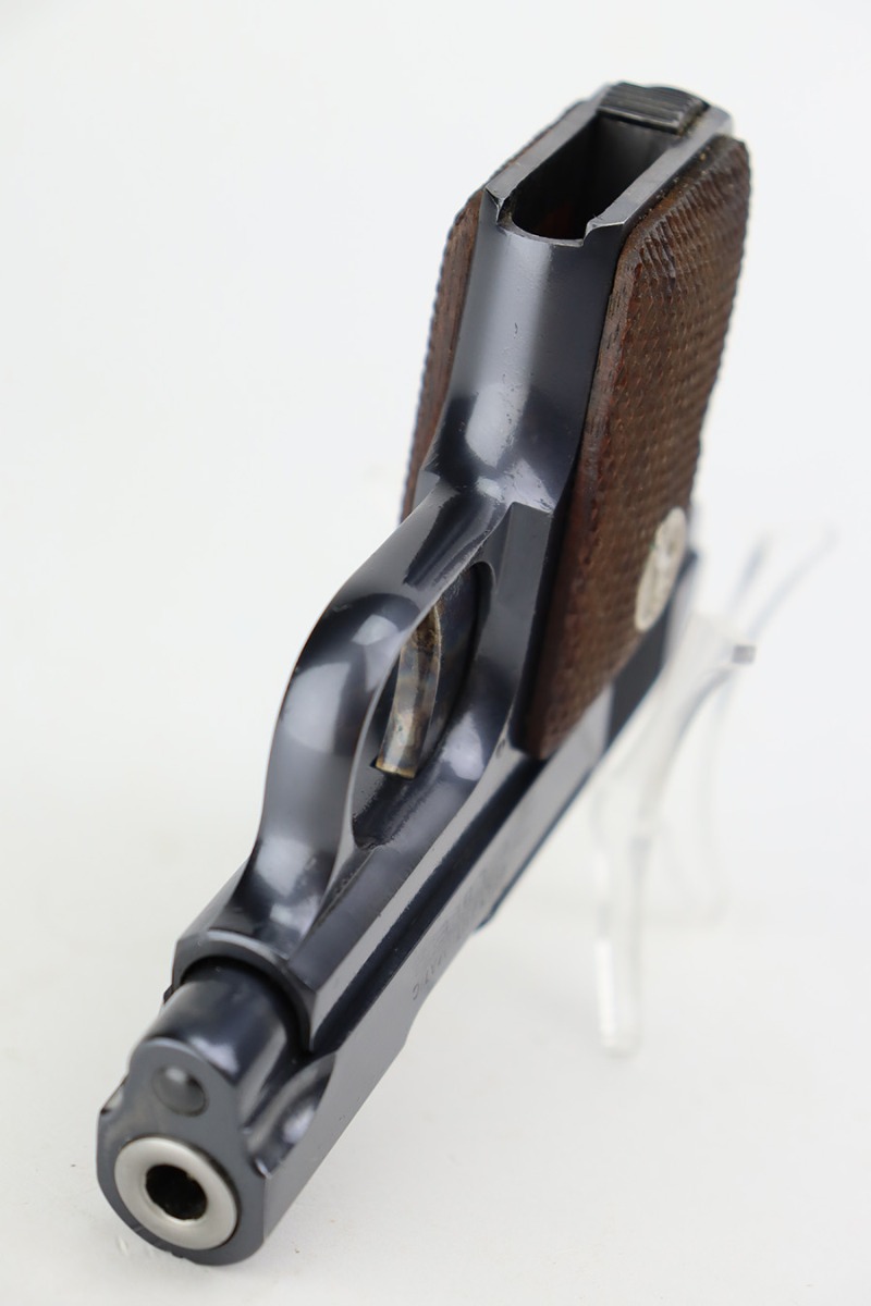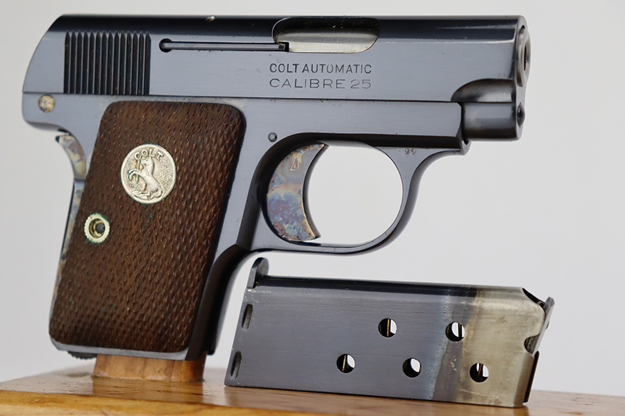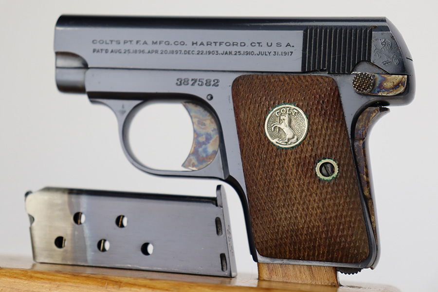 7/3/23 – This is a beautiful and near-mint Colt 1908 Vest Pocket in the original box. Made in 1930, the pistol has gorgeous case hardening on the trigger, grip safety and frame safety. Tiny bit of high edge wear but very little sign of use. Excellent Colt grips with no cracks or chips. Strong, shiny bore. The box is numbered on the bottom and matching to the pistol.