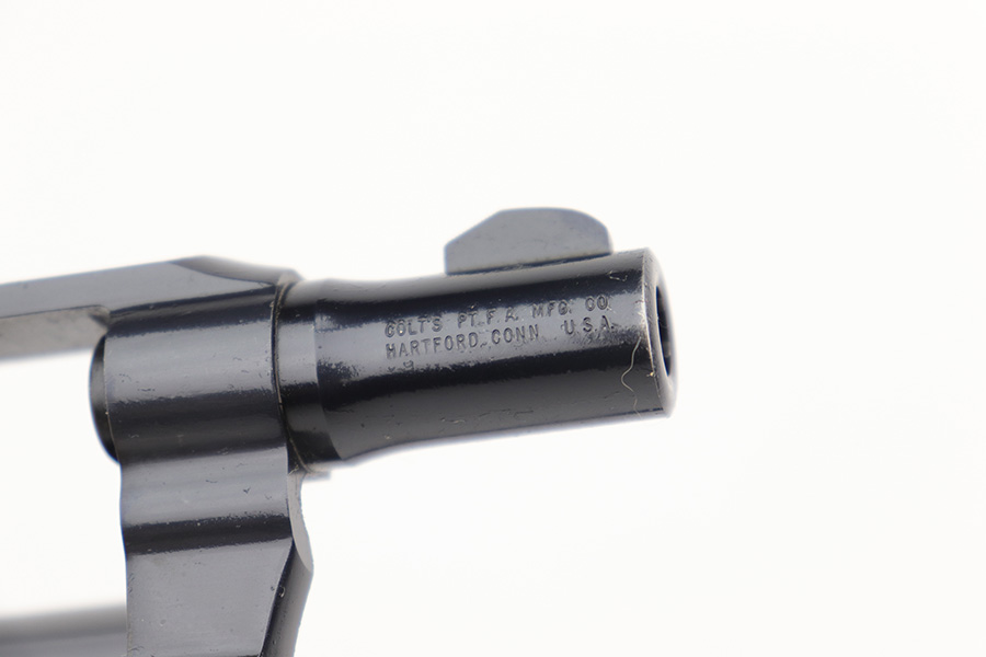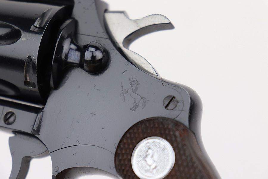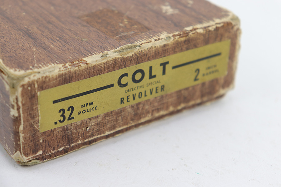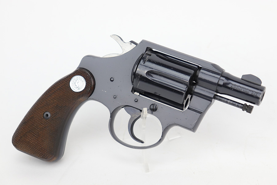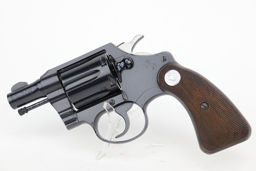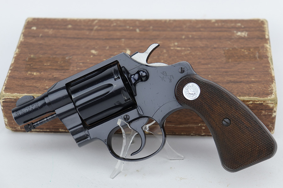6/7/23 – This is a near-mint example of a scarce Colt Detective Special chambered in .32 New Police and manufactured in 1964. 2″ barrel. It is matching and comes with its original matching-numbered box. The gun itself has retained nearly all of its original high polish finish with just a hint of muzzle wear and a couple of small spots of wear on the cylinder. Fitted with mint hand-checkered Walnut grips. Mint bore. The cylinder is tight, and the action is smooth.