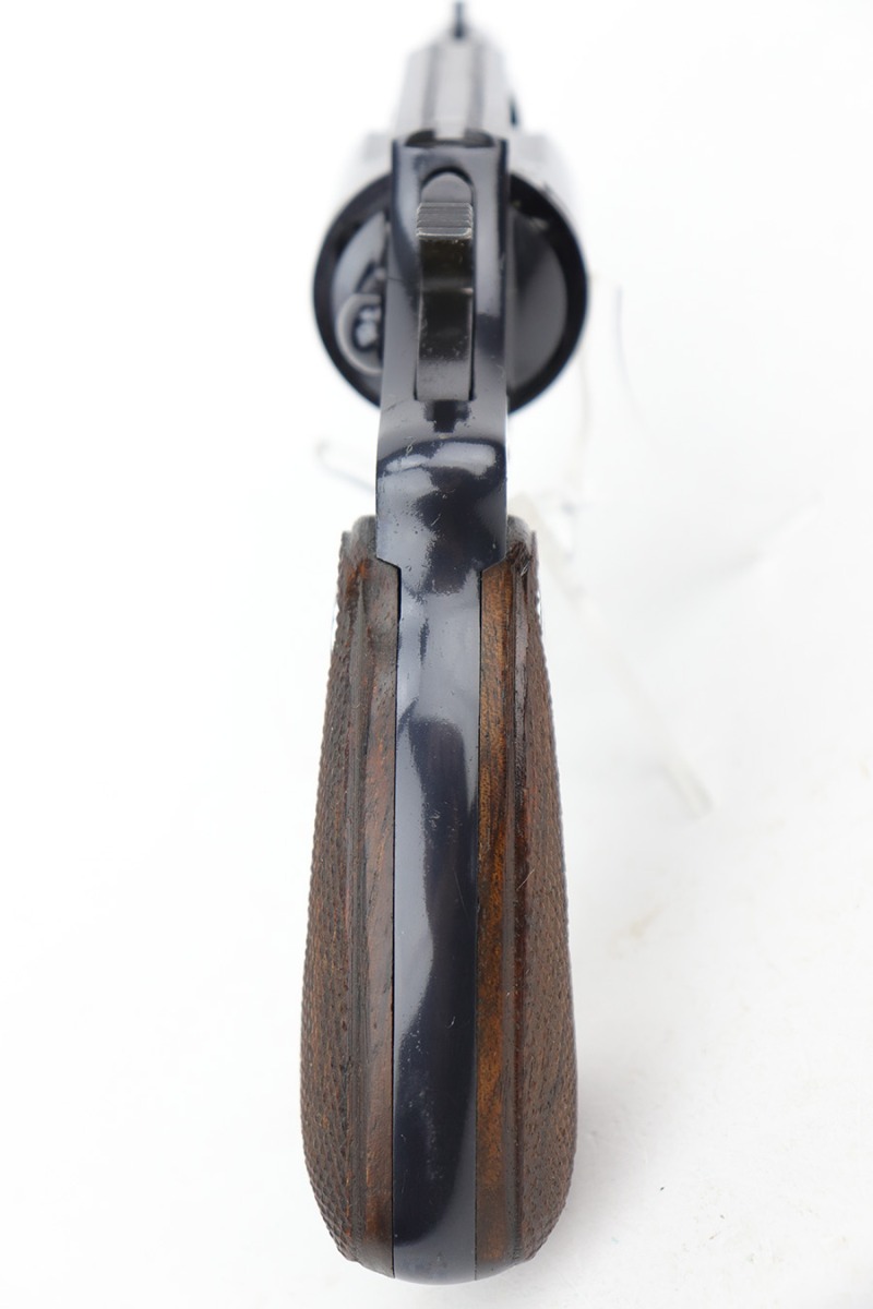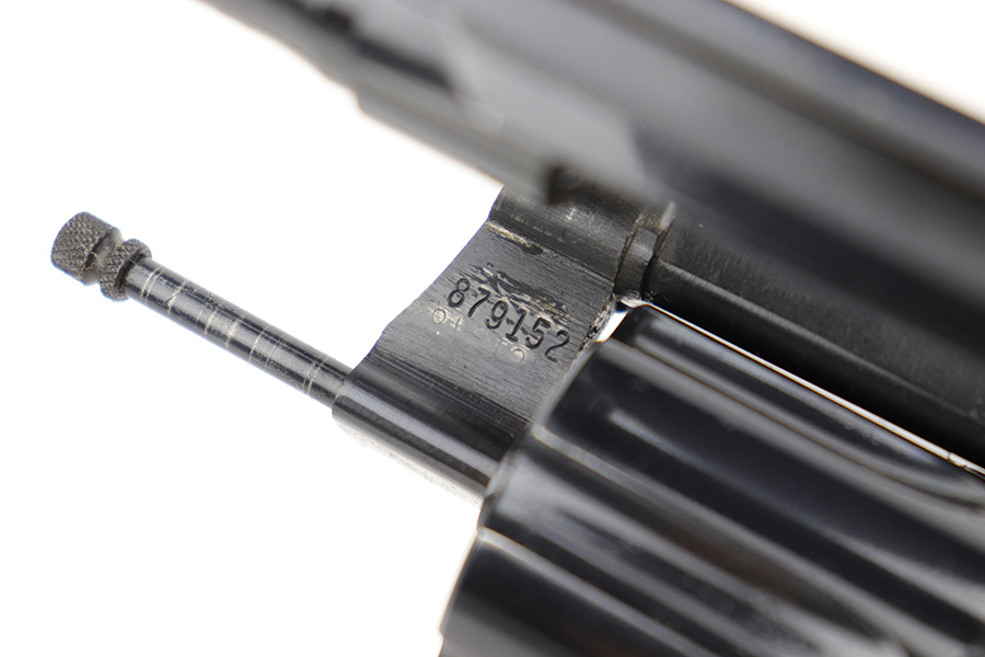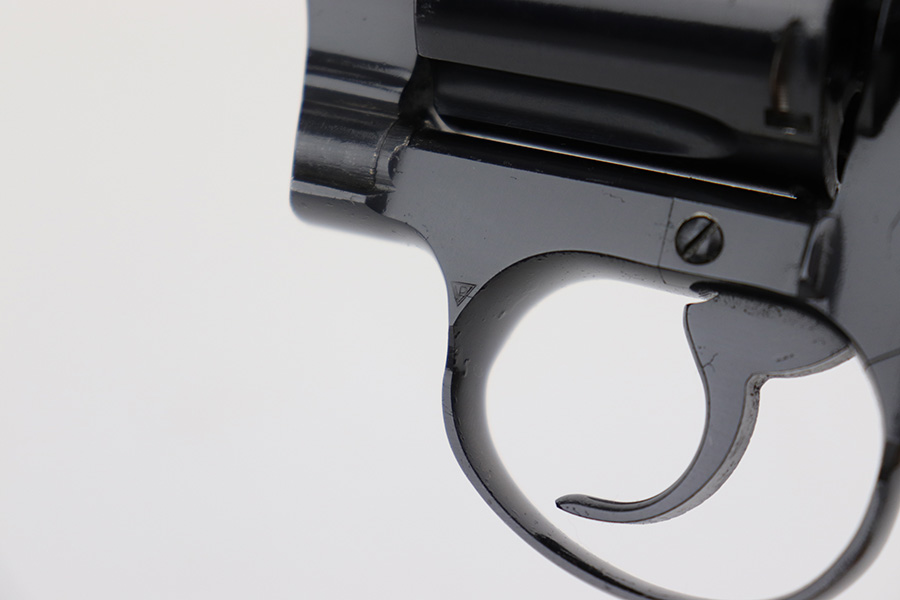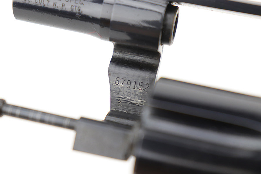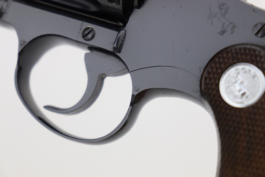 6/7/23 – This is a near-mint example of a scarce Colt Detective Special chambered in .32 New Police and manufactured in 1964. 2″ barrel. It is matching and comes with its original matching-numbered box. The gun itself has retained nearly all of its original high polish finish with just a hint of muzzle wear and a couple of small spots of wear on the cylinder. Fitted with mint hand-checkered Walnut grips. Mint bore. The cylinder is tight, and the action is smooth.