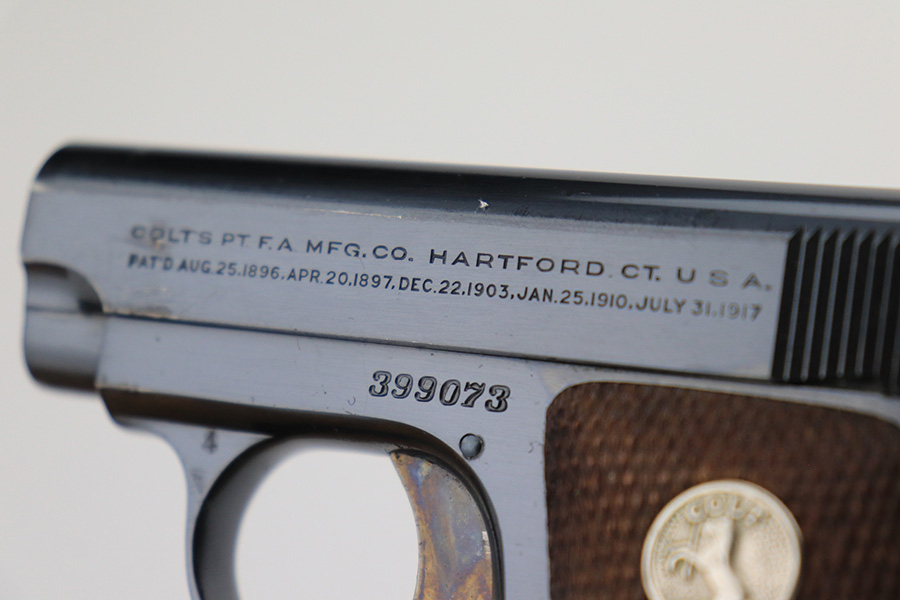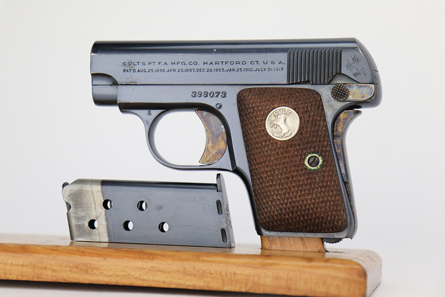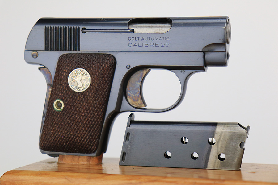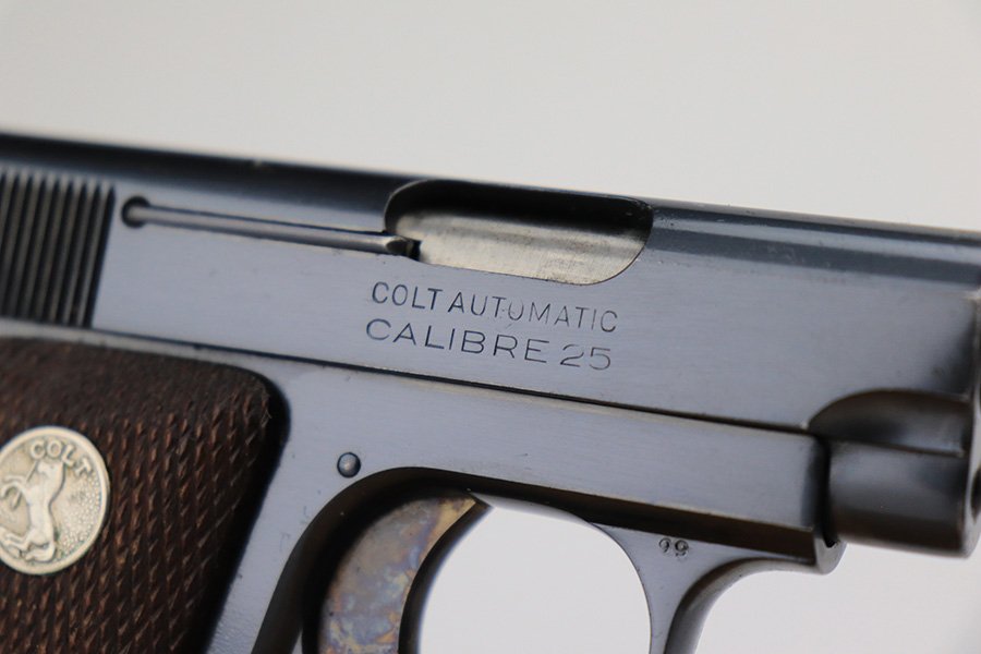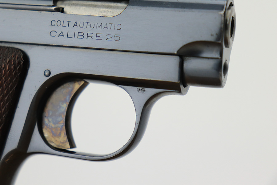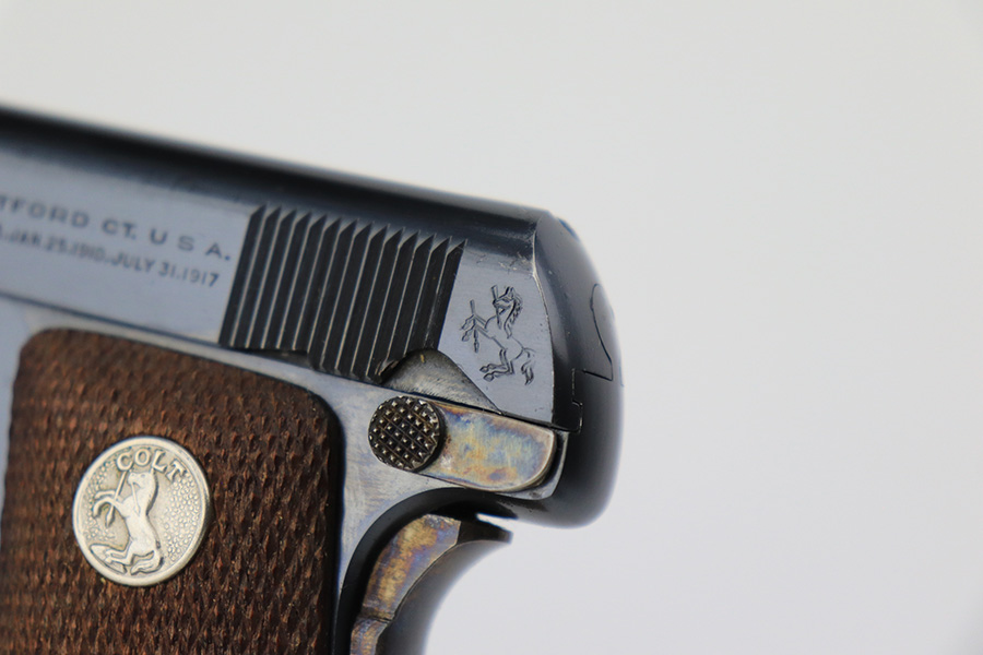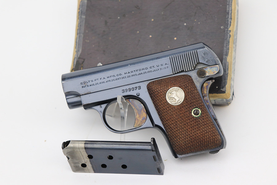 6/5/23 – This is a near-mint example of a Colt Model 1908 Vest Pocket, manufactured in 1934 and chambered in .25 ACP. It is all matching and comes with a period-correct box (not numbered) and one proper magazine. The edges of the box lid are repaired with tape. The gun itself is near-mint, retaining nearly all of its original finish. There are just hints of wear around the muzzle and on the high edges and a few tiny handling marks here and there. Gorgeous, vibrant case-hardening on the small parts. Fitted with mint, hand-checkered wood grips. The bore is factory-new.