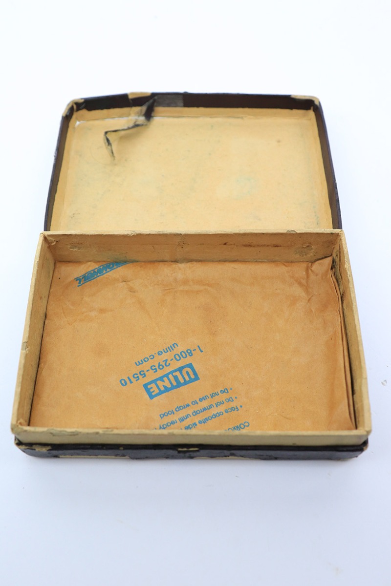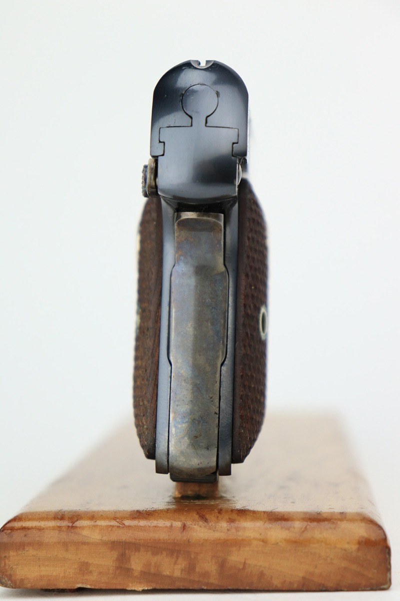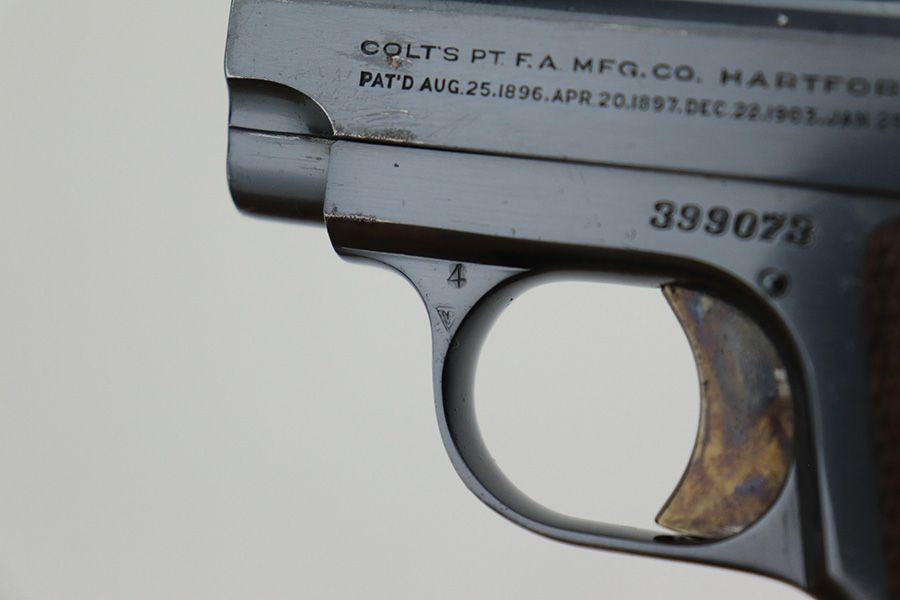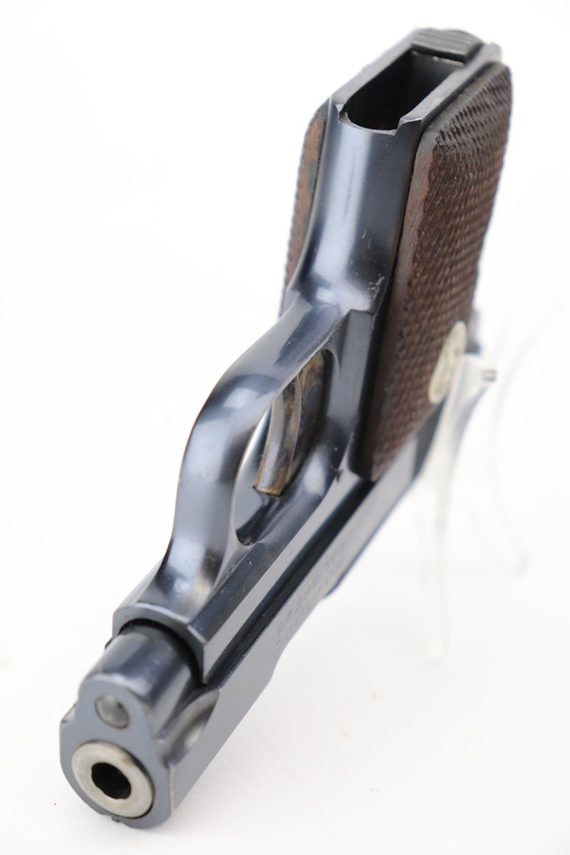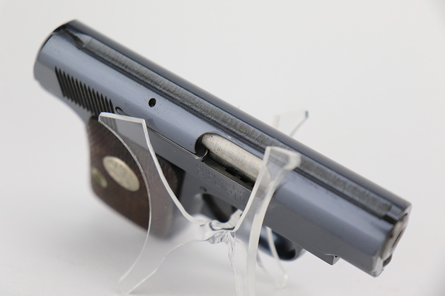 6/5/23 – This is a near-mint example of a Colt Model 1908 Vest Pocket, manufactured in 1934 and chambered in .25 ACP. It is all matching and comes with a period-correct box (not numbered) and one proper magazine. The edges of the box lid are repaired with tape. The gun itself is near-mint, retaining nearly all of its original finish. There are just hints of wear around the muzzle and on the high edges and a few tiny handling marks here and there. Gorgeous, vibrant case-hardening on the small parts. Fitted with mint, hand-checkered wood grips. The bore is factory-new.