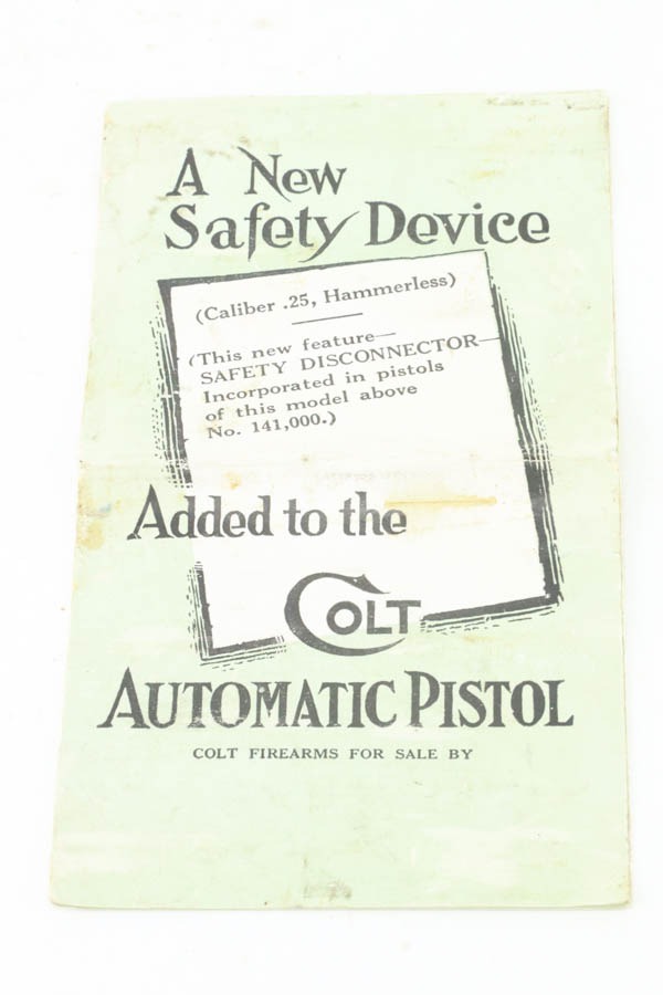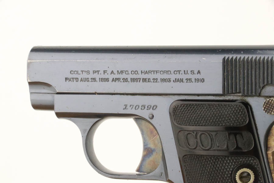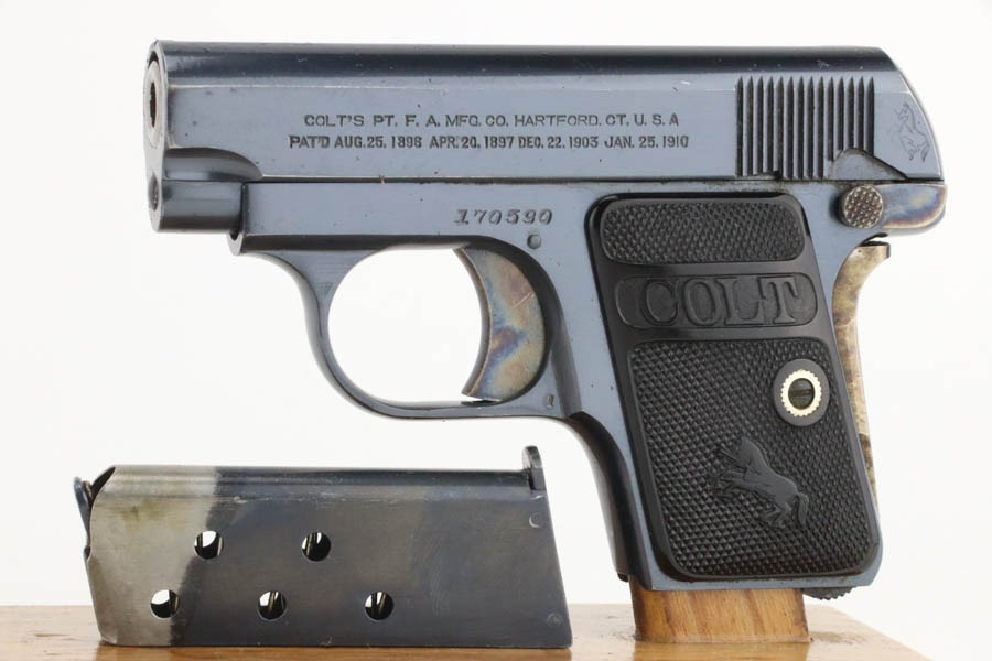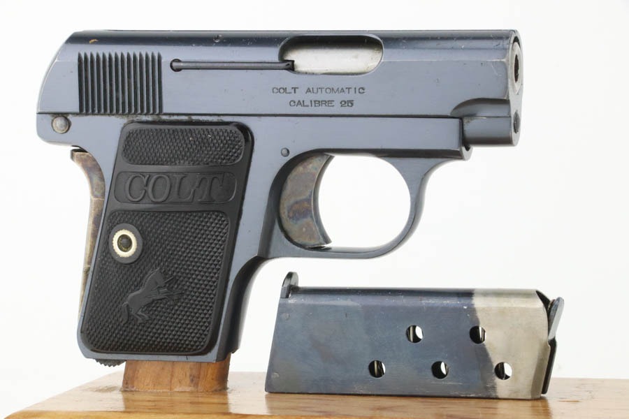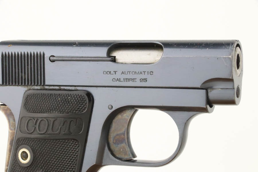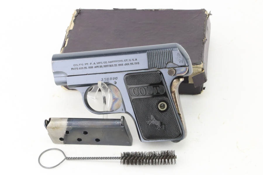 10/11/24 – This is a beautiful, near-mint example of a Colt M1908 Vest Pocket pistol, manufactured in 1917 and chambered in .25 ACP. It is all matching and comes with its original matching-numbered box, owners manual, and cleaning brush. The gun has retained nearly all of its finish with just the slightest hints of high edge wear and a few tiny dots of wear on the front strap. Gorgeous case-hardening on the small parts. Fitted with excellent black hard rubber grips. Excellent, shiny bore.