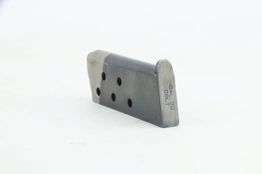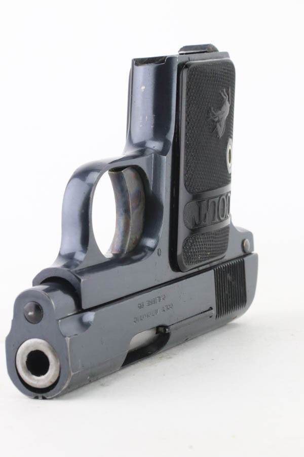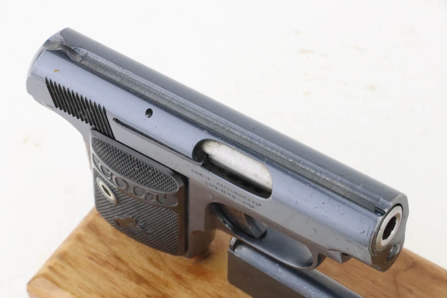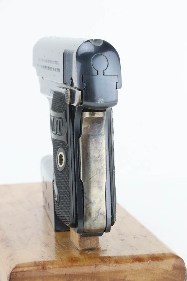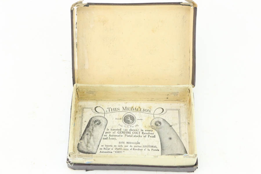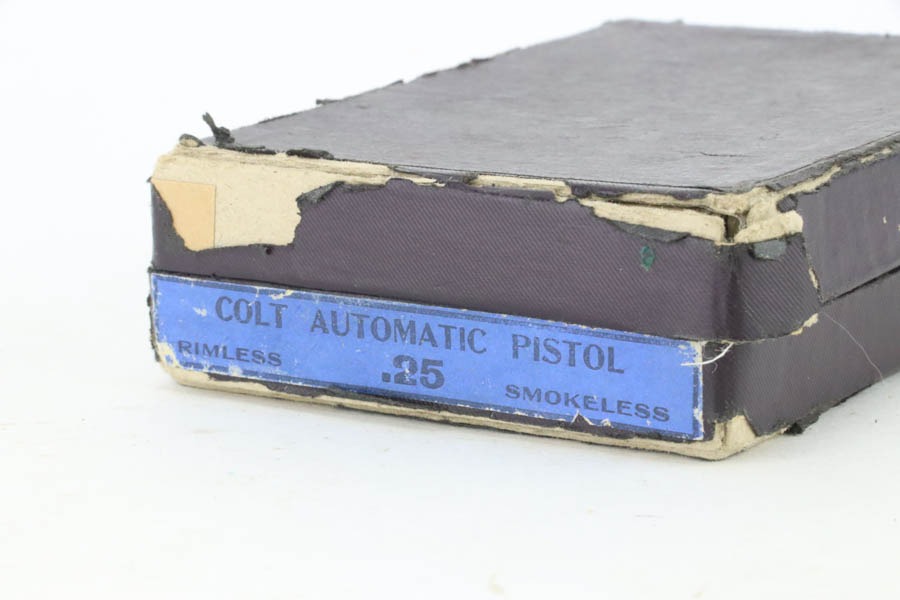 10/11/24 – This is a beautiful, near-mint example of a Colt M1908 Vest Pocket pistol, manufactured in 1917 and chambered in .25 ACP. It is all matching and comes with its original matching-numbered box, owners manual, and cleaning brush. The gun has retained nearly all of its finish with just the slightest hints of high edge wear and a few tiny dots of wear on the front strap. Gorgeous case-hardening on the small parts. Fitted with excellent black hard rubber grips. Excellent, shiny bore.