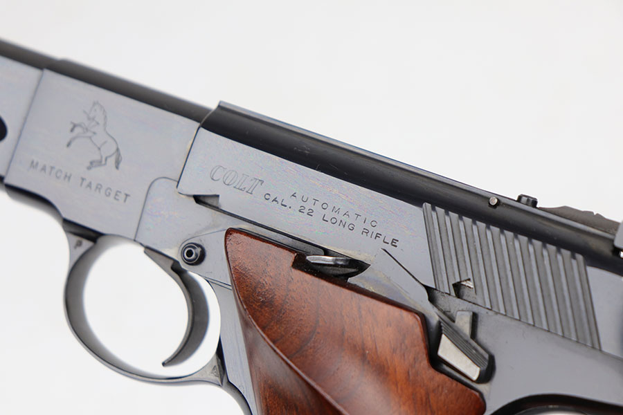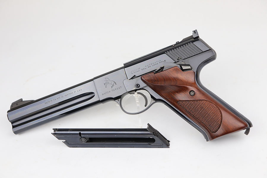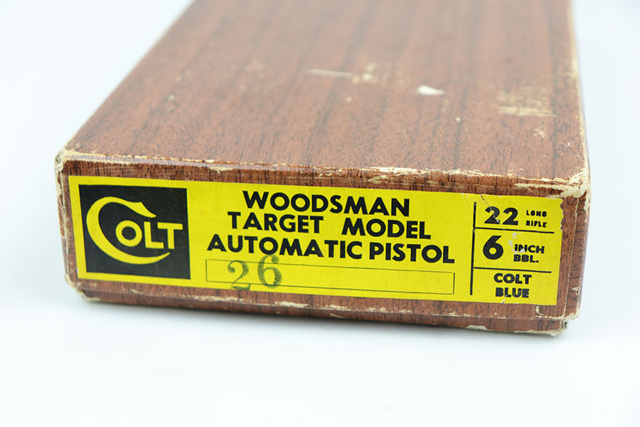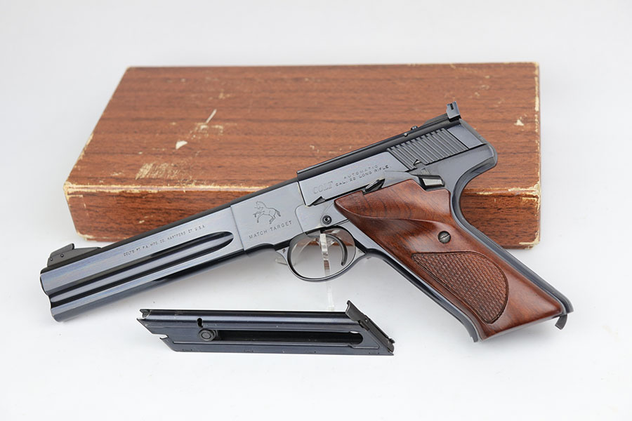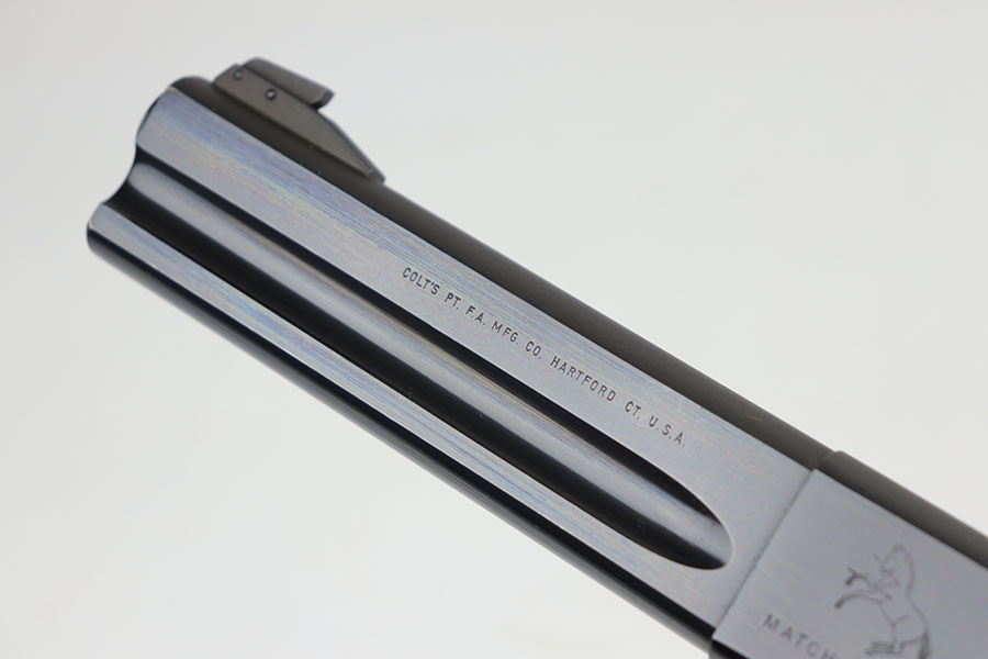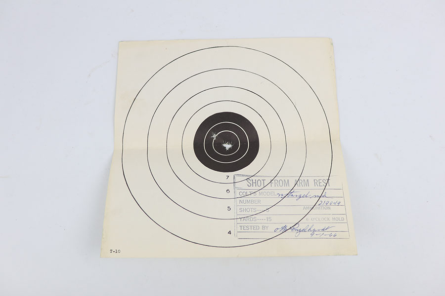 5/12/20 – This is a near-mint Colt Match Target that was made in 1963 and comes with an original box. The pistol has 99% of the original blue with tiny bits of edge wear from shifting in the box, and a couple of small surface scratches on the left side of the pistol. Mint bore with a six inch barrel. Grips are minty, too, and left panel has thumb rest. The box is original but the number is mismatched to the pistol. It comes with the original test target that matches the serial of the box.