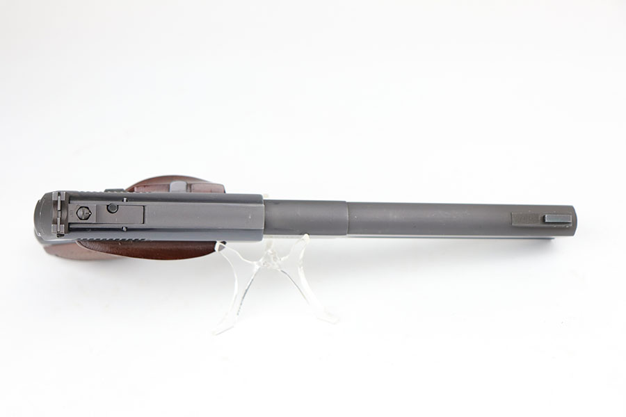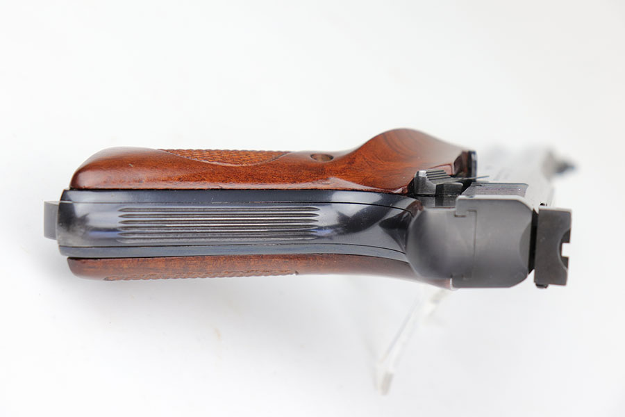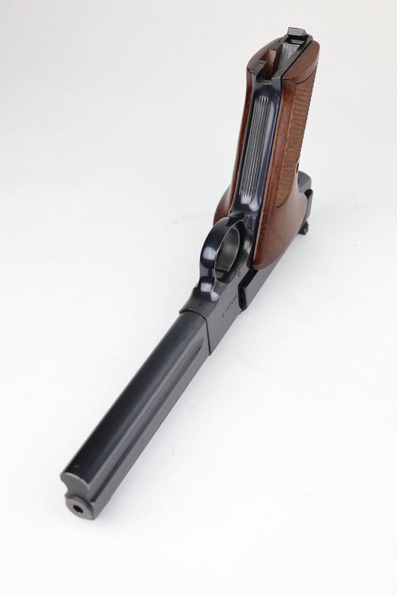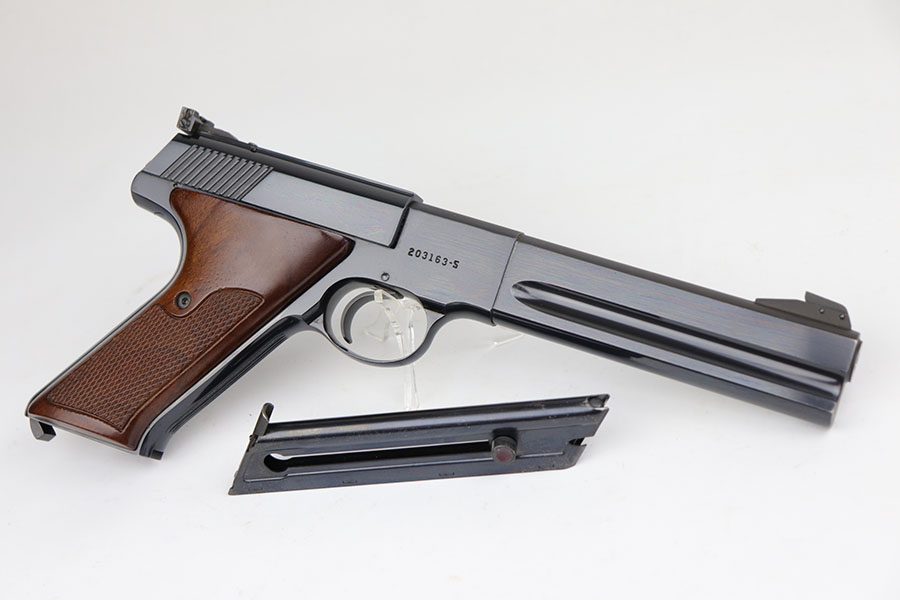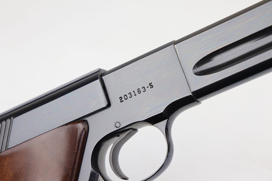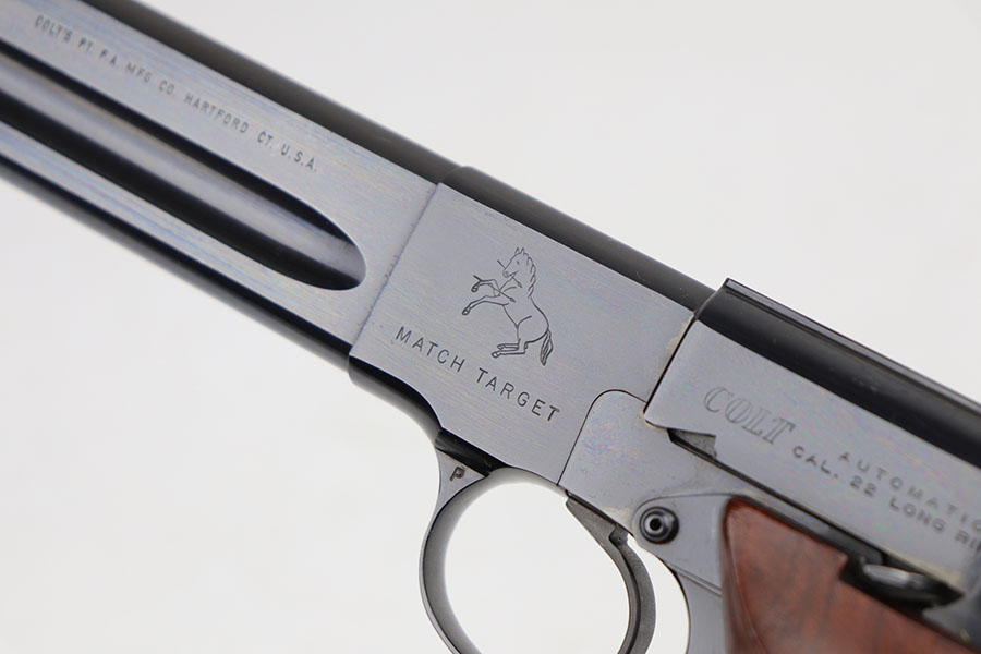 5/12/20 – This is a near-mint Colt Match Target that was made in 1963 and comes with an original box. The pistol has 99% of the original blue with tiny bits of edge wear from shifting in the box, and a couple of small surface scratches on the left side of the pistol. Mint bore with a six inch barrel. Grips are minty, too, and left panel has thumb rest. The box is original but the number is mismatched to the pistol. It comes with the original test target that matches the serial of the box.