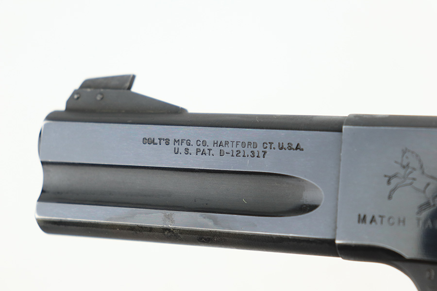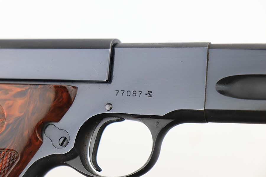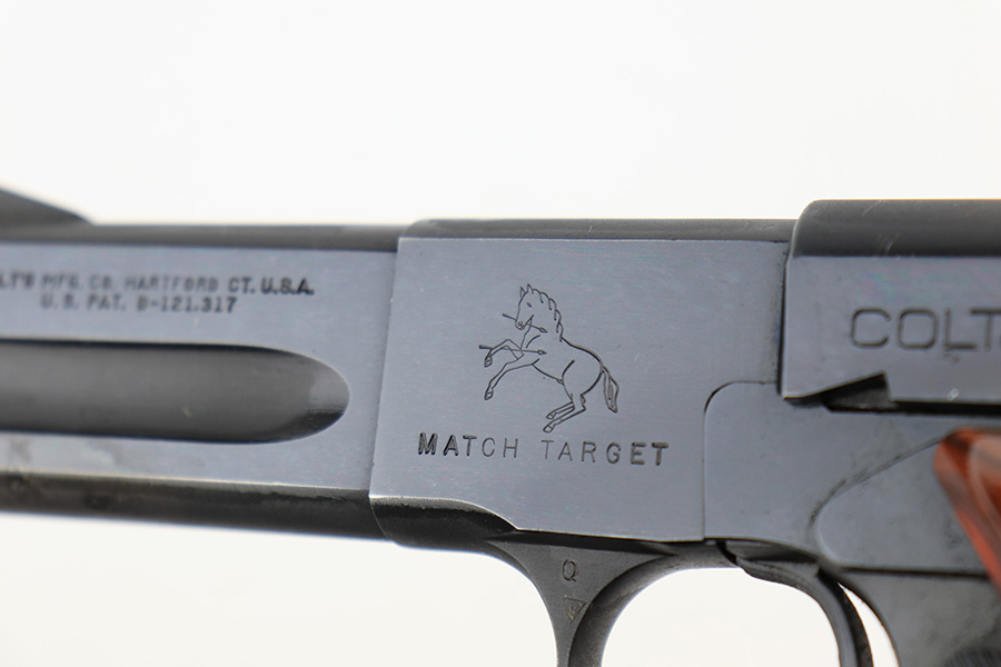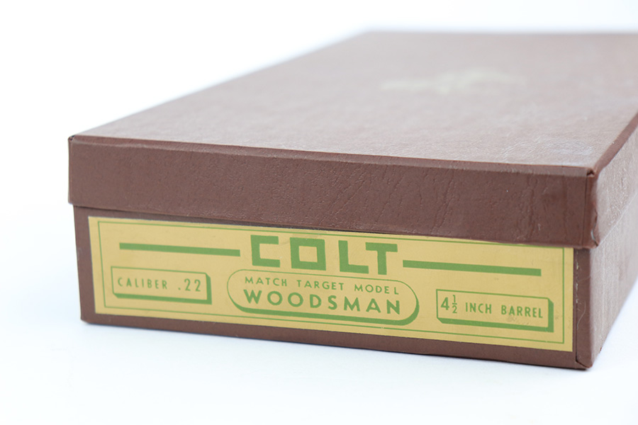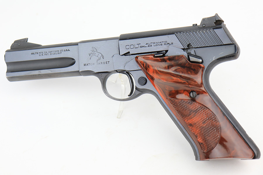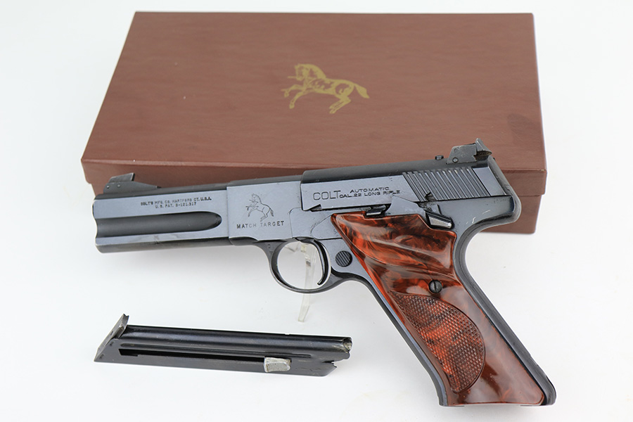 4/20/22 – This is a minty example of a Colt Match Target manufactured in 1950. It is all matching and comes with the original matching box and owners manual. The gun has retained nearly all of its original finish, but there is an area of spotty discoloration on the underside of the barrel. There are also a couple of tiny scratches at the back left of the frame. It comes with excellent marbled brown bakelite grips and one proper magazine. Stone-mint bore.
