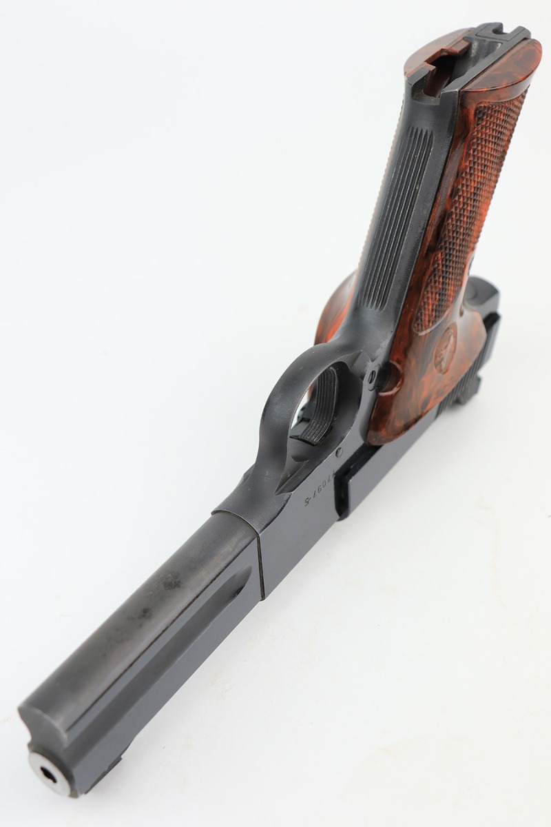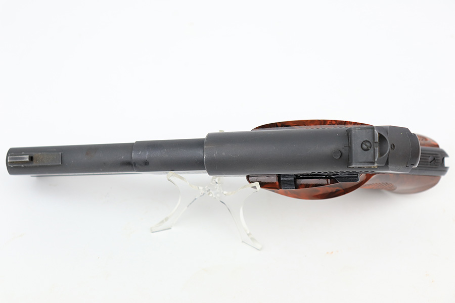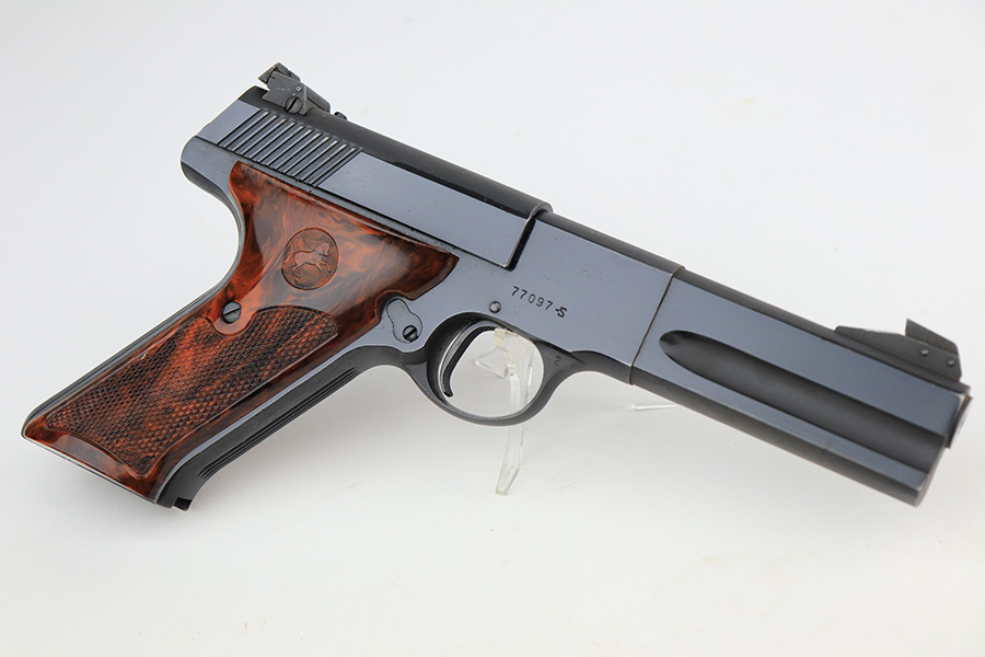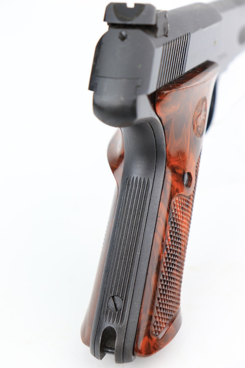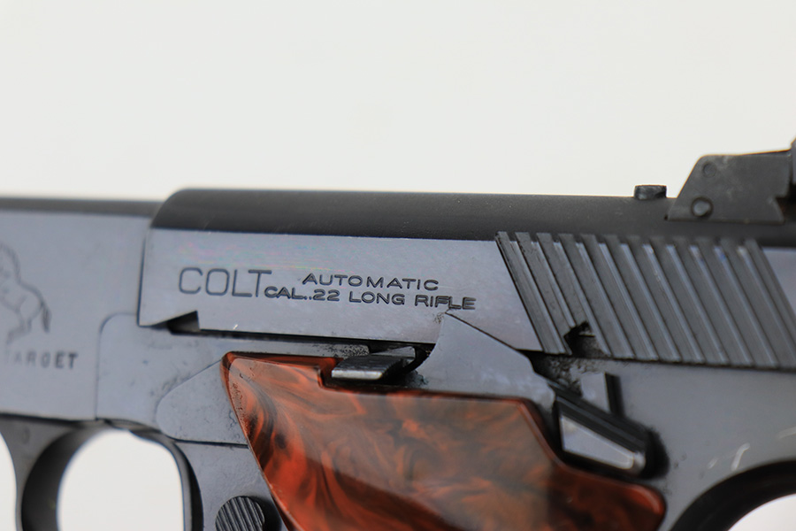 4/20/22 – This is a minty example of a Colt Match Target manufactured in 1950. It is all matching and comes with the original matching box and owners manual. The gun has retained nearly all of its original finish, but there is an area of spotty discoloration on the underside of the barrel. There are also a couple of tiny scratches at the back left of the frame. It comes with excellent marbled brown bakelite grips and one proper magazine. Stone-mint bore.