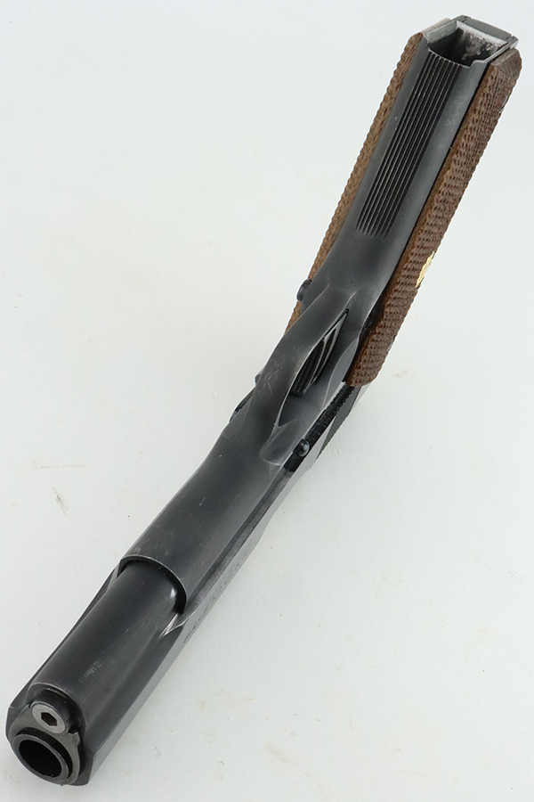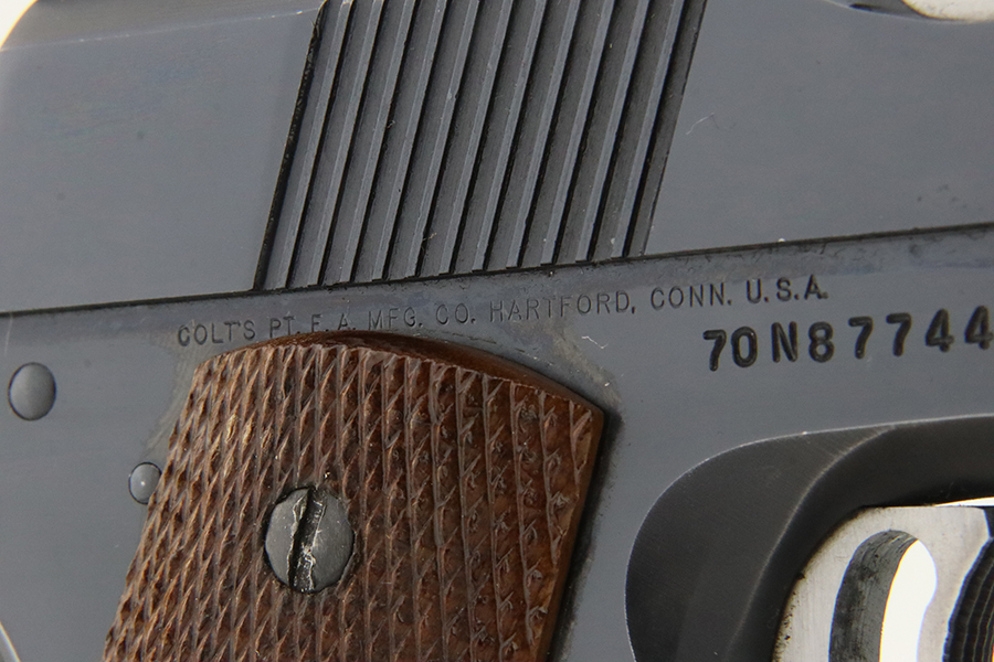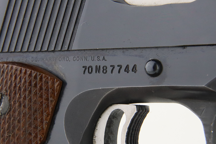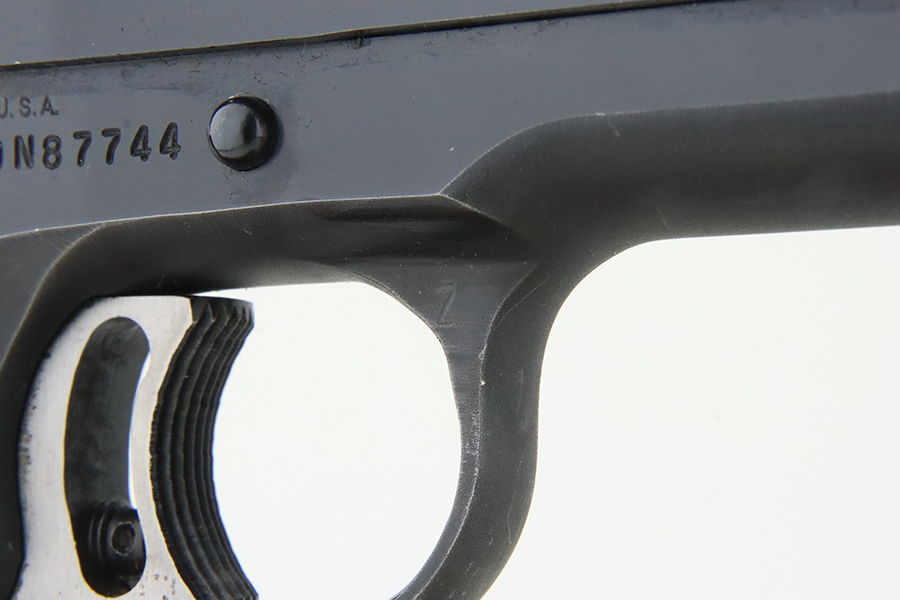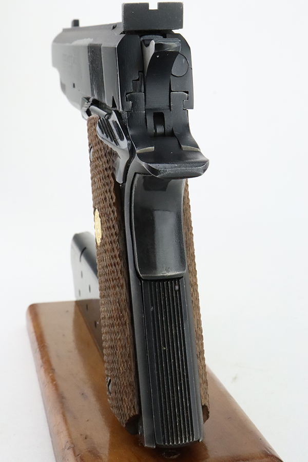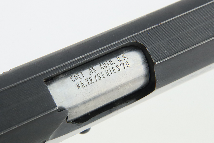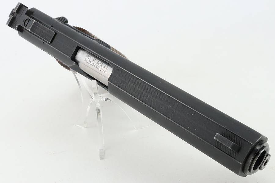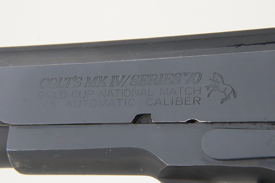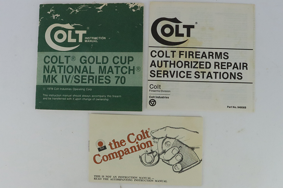 1/31/24 – This is a near-mint example of a Colt MK IV Series 70 Gold Cup National Match, manufactured in 1980 and chambered in .45 ACP. It comes with a proper box (the side panel is missing, so we can’t tell if it was matching), owners manual, and one magazine. The gun itself has retained nearly all of its original finish with just a hint of wear around the muzzle and on the edges of the grip safety. Minty wood grips. Mint bore.