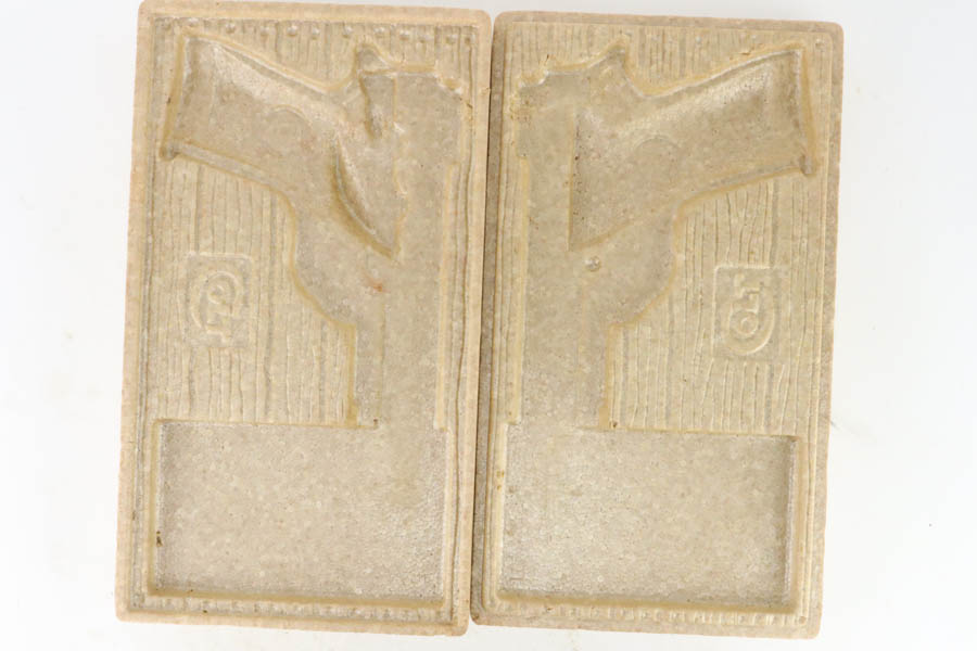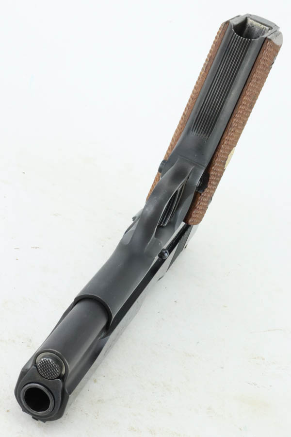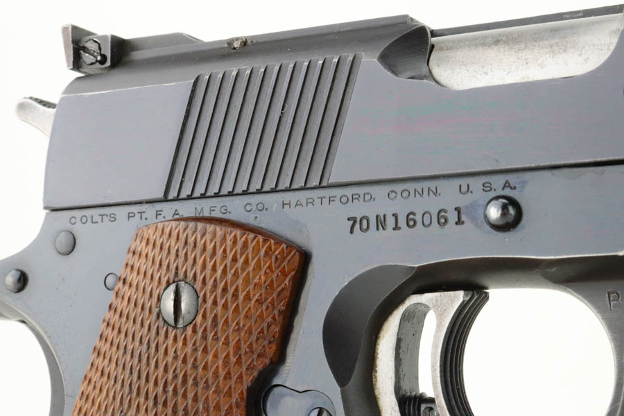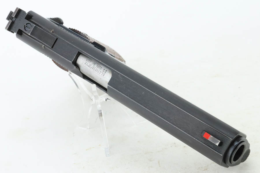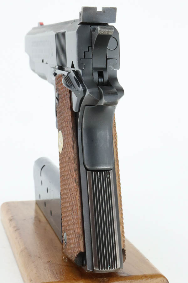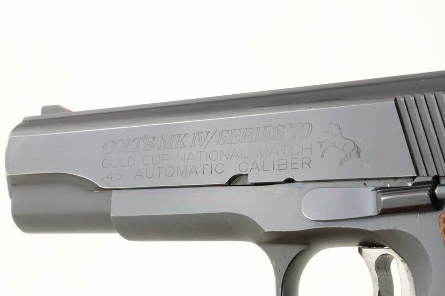 7/17/24 – This is a near-mint example of a Colt Mk IV Series 70 Gold Cup National Match, manufactured in 1974 and chambered in .45 ACP. It comes with a period-correct box, owners manual, sales papers, spare trigger, and one magazine. The box is matching-numbered, but it appears the box was re-numbered to match. One of the side panels of the box is missing. The gun has retained nearly all of its finish with just hints of high edge wear and some very minor discoloration on the front strap. Fitted with minty wood grips. Minty bore.