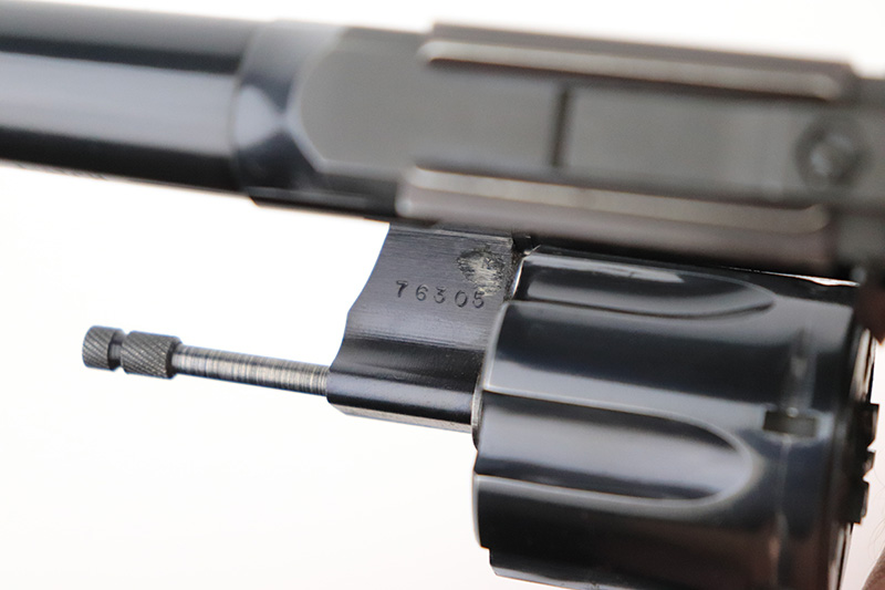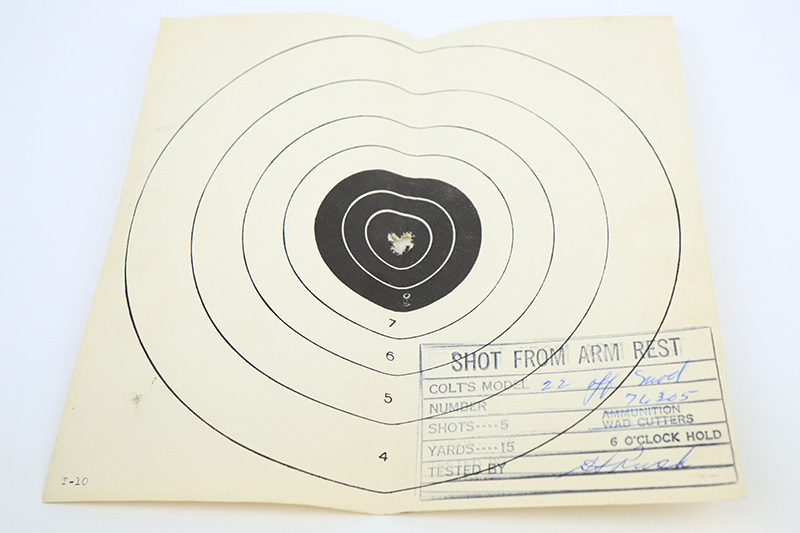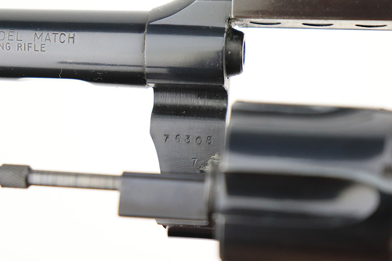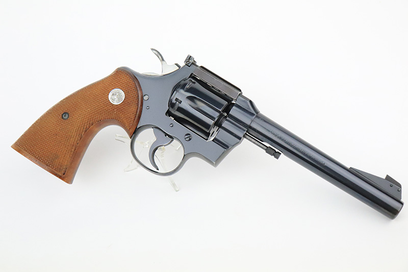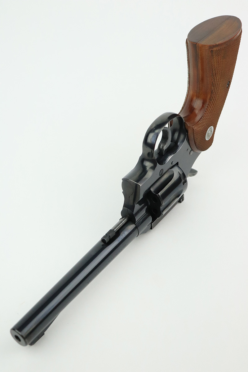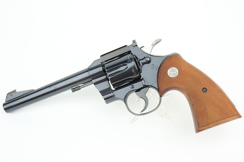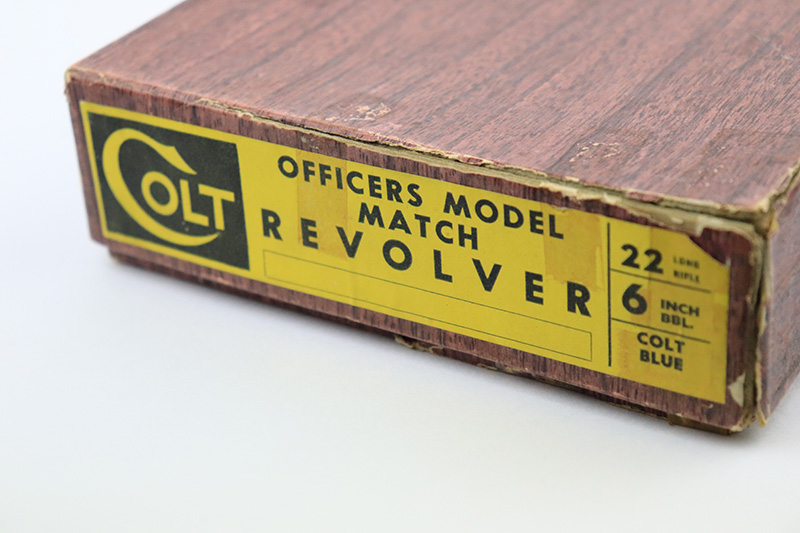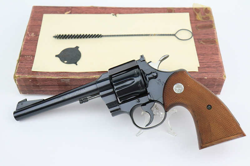 9/21/22 – This is a beautiful example of a Colt Officers Model Match Revolver, manufactured in 1958 and chambered in .22LR. 6″ barrel. It is all matching and comes with its original matching-numbered box, matching numbered test target, Colt multitool, and cleaning rod. The box is starting to tear along some of the edges, so it has been repaired with tape. The gun has retained nearly all of its original high polish Colt bluing. There are just hints of wear on some of the high edges, one tiny spot of wear on the underside of the trigger guard, and the faintest hint of a roll mark on the cylinder. Comes with beautiful hand-checkered wood grips. The bore is like-new. The cylinder is tight, and the action is very smooth.