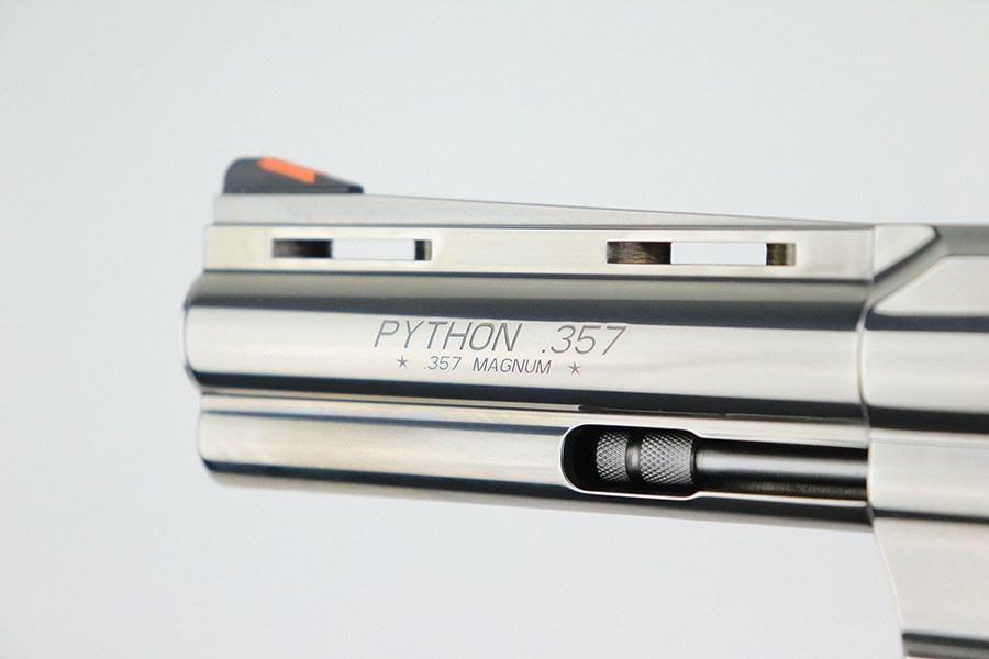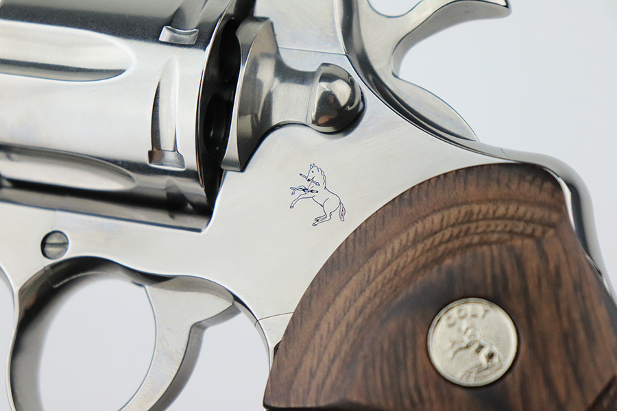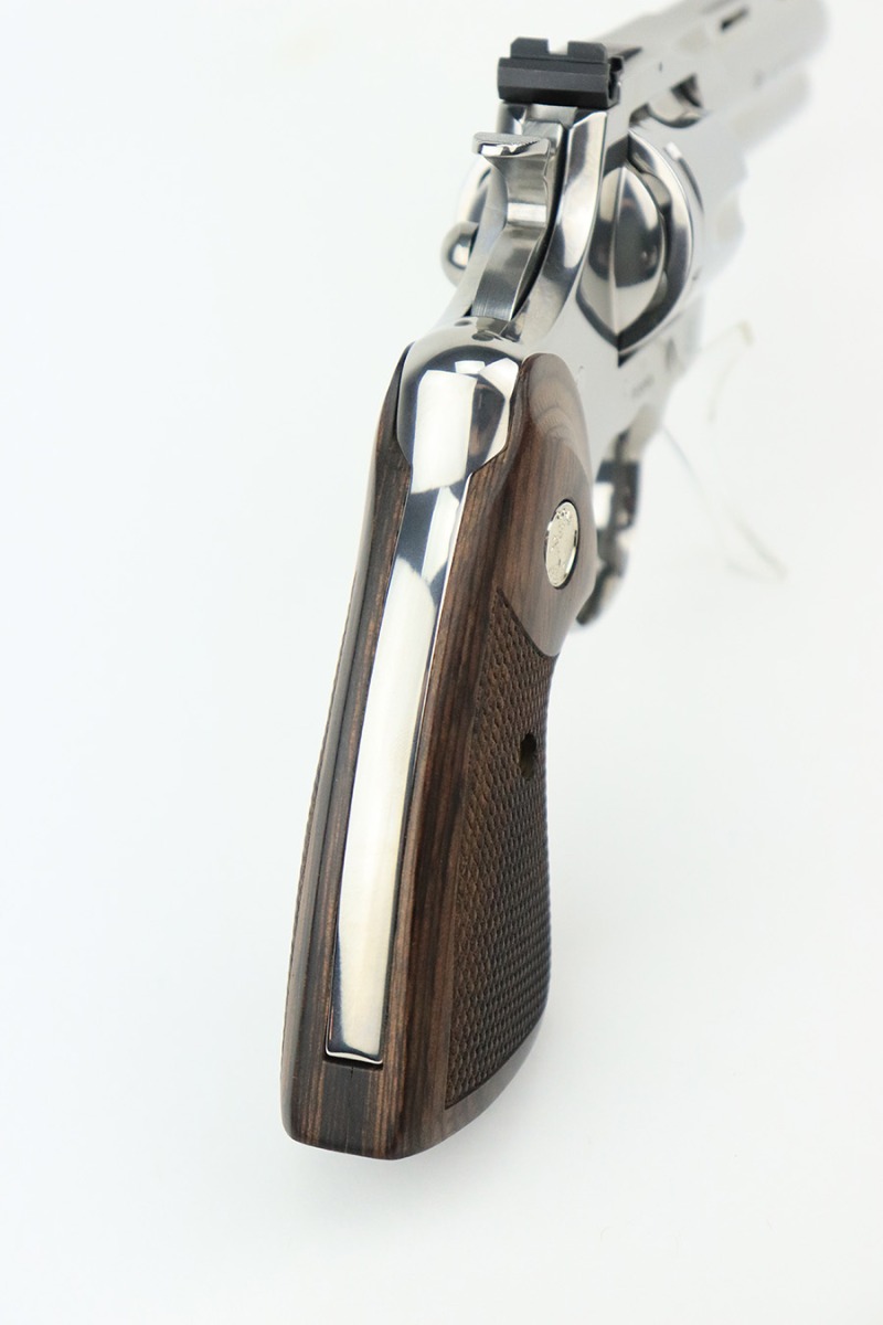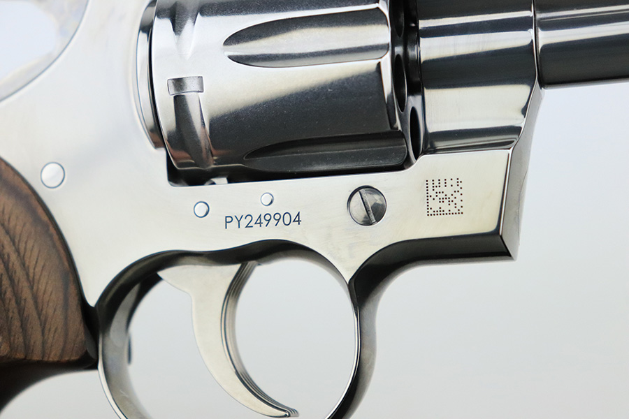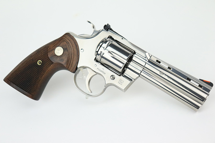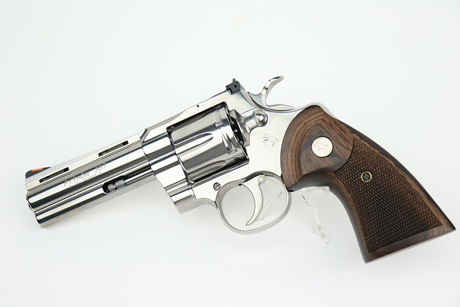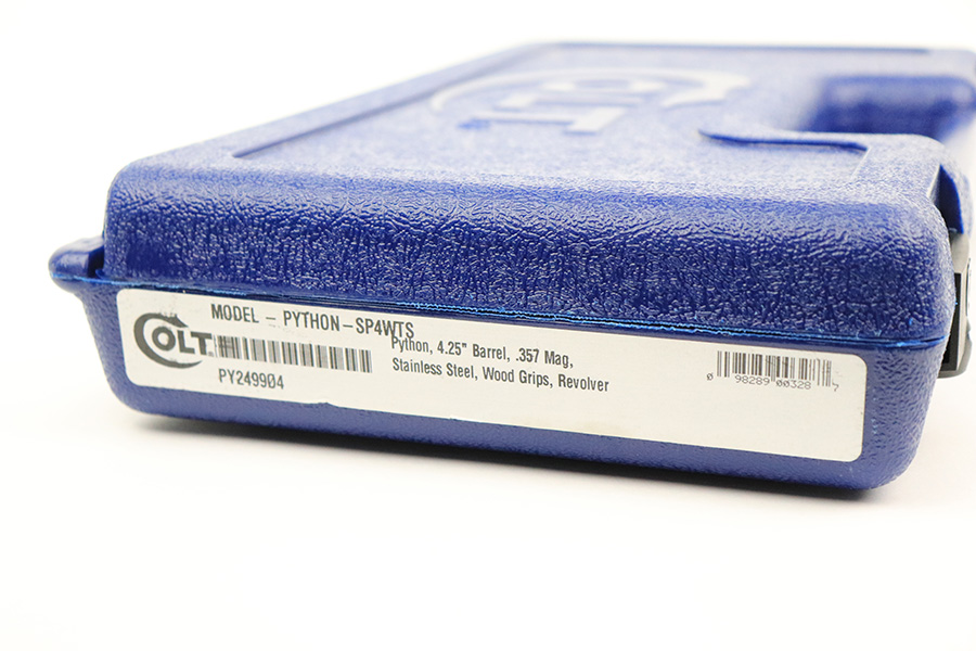 7/20/22 – This is a minty Colt Python in the original, matching box. Made as part of Colt’s recent reintroduction of the Colt Python, this one has a factory stainless steel finish with 4.25in barrel. Our consignor bought it factory new and says he only put a couple dozen cartridges through out. Still no visible turn line on the cylinder and a minty bore. Excellent wood grips with no handling wear. Colt hard case has the original manual and lock. FFL required.
