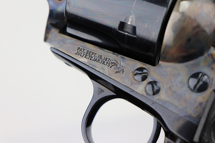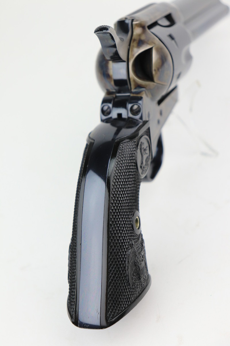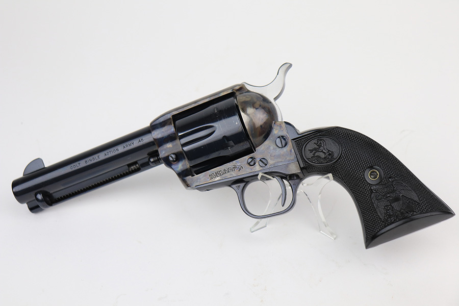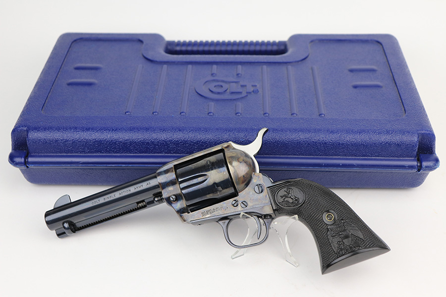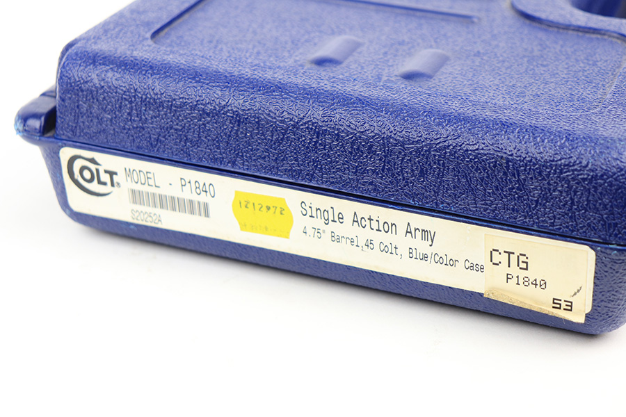 2/22/22 – This is a minty Colt Single Action Army revolver in its original, matching box. The gun has a hint of muzzle wear, and minor turn wear on the cylinder. Beautiful case hardening on frame with a minty bore. 4.75in barrel, chambered for .45c. Excellent, original grips with just a bit of handling wear. Comes in the original Colt case with serialized label. Comes with manual. Serial dates the gun to 1990, so it’s a 3rd gen example and requires FFL.