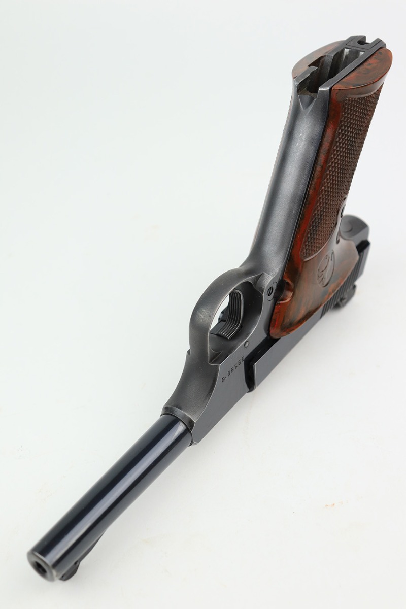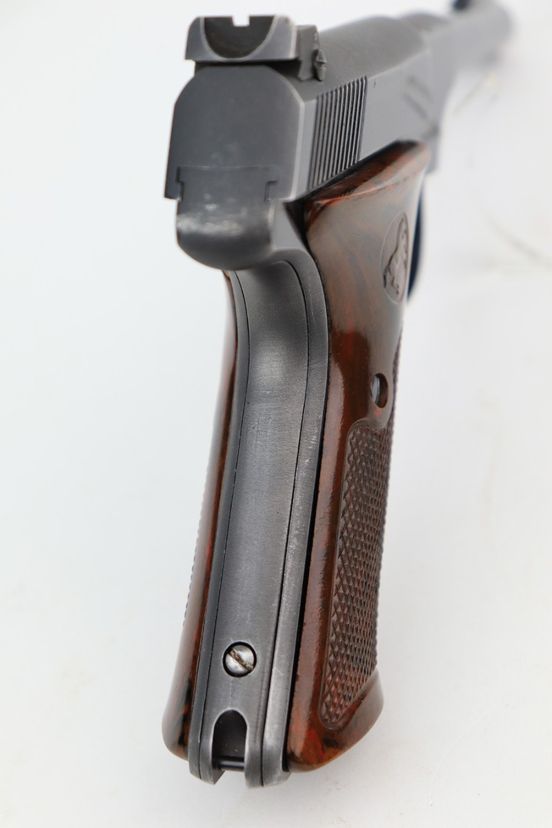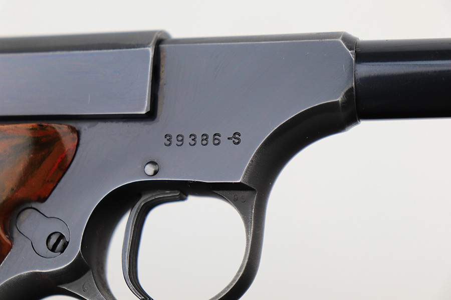 4/20/22 – This is a minty example of a Colt Woodsman manufactured in 1949. The gun is matching and comes with a period-correct box (not numbered), owners manual, two rear grip attachments, multitool, matching test target, and a photocopy of a Colt factory letter (we don’t have the original). The gun has retained about 97-98% of its original finish. There is minor muzzle wear, hints of wear on some of the high edges, hints of thinning on both grip straps, and a small spot of wear on the tang. Comes with excellent marbled brown bakelite grips and one proper magazine. Mint bore. Barrel is 4.5in.