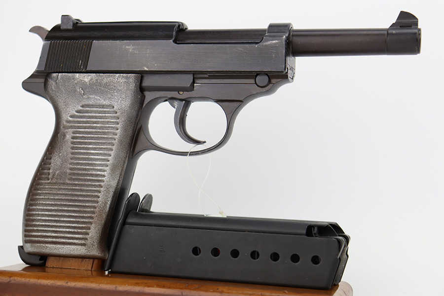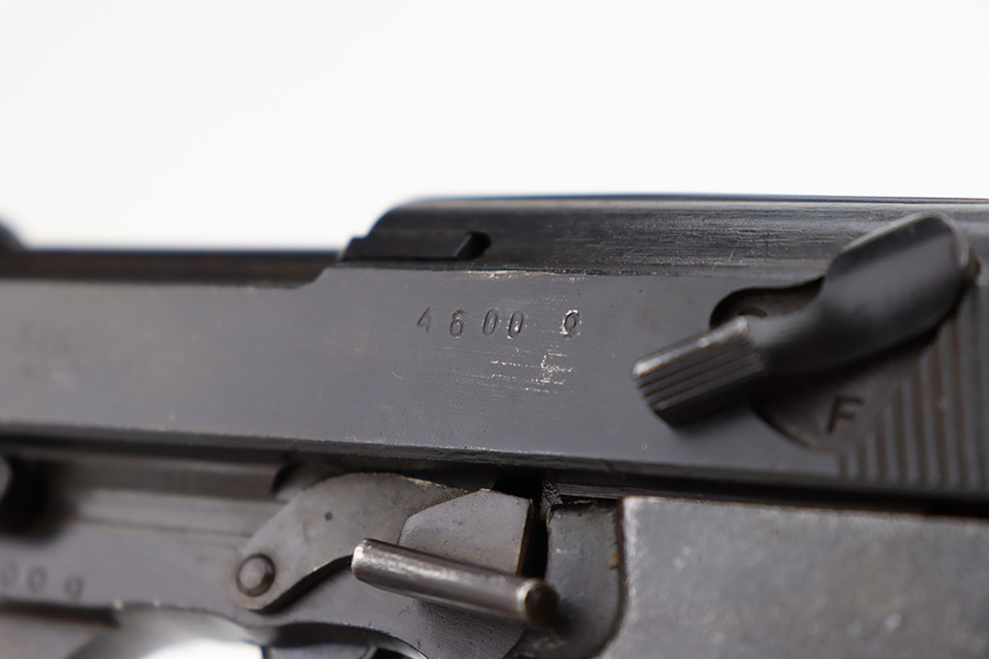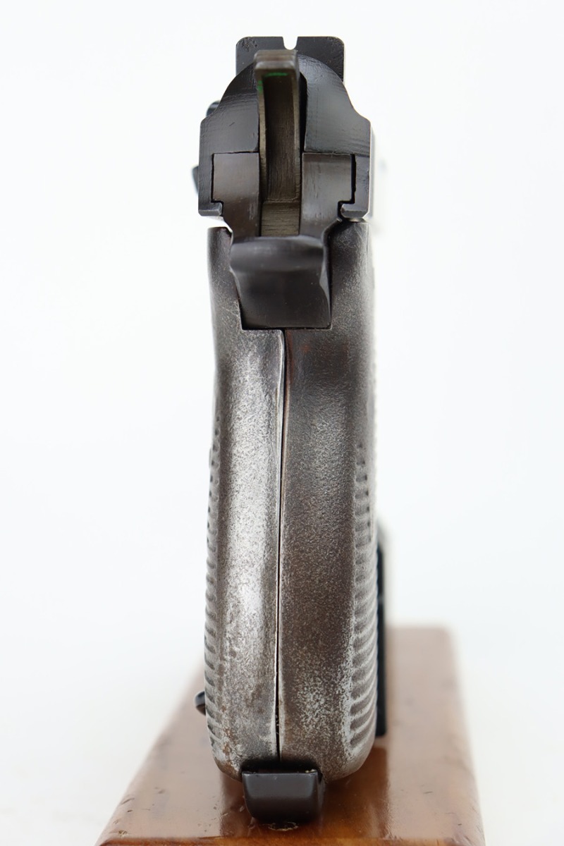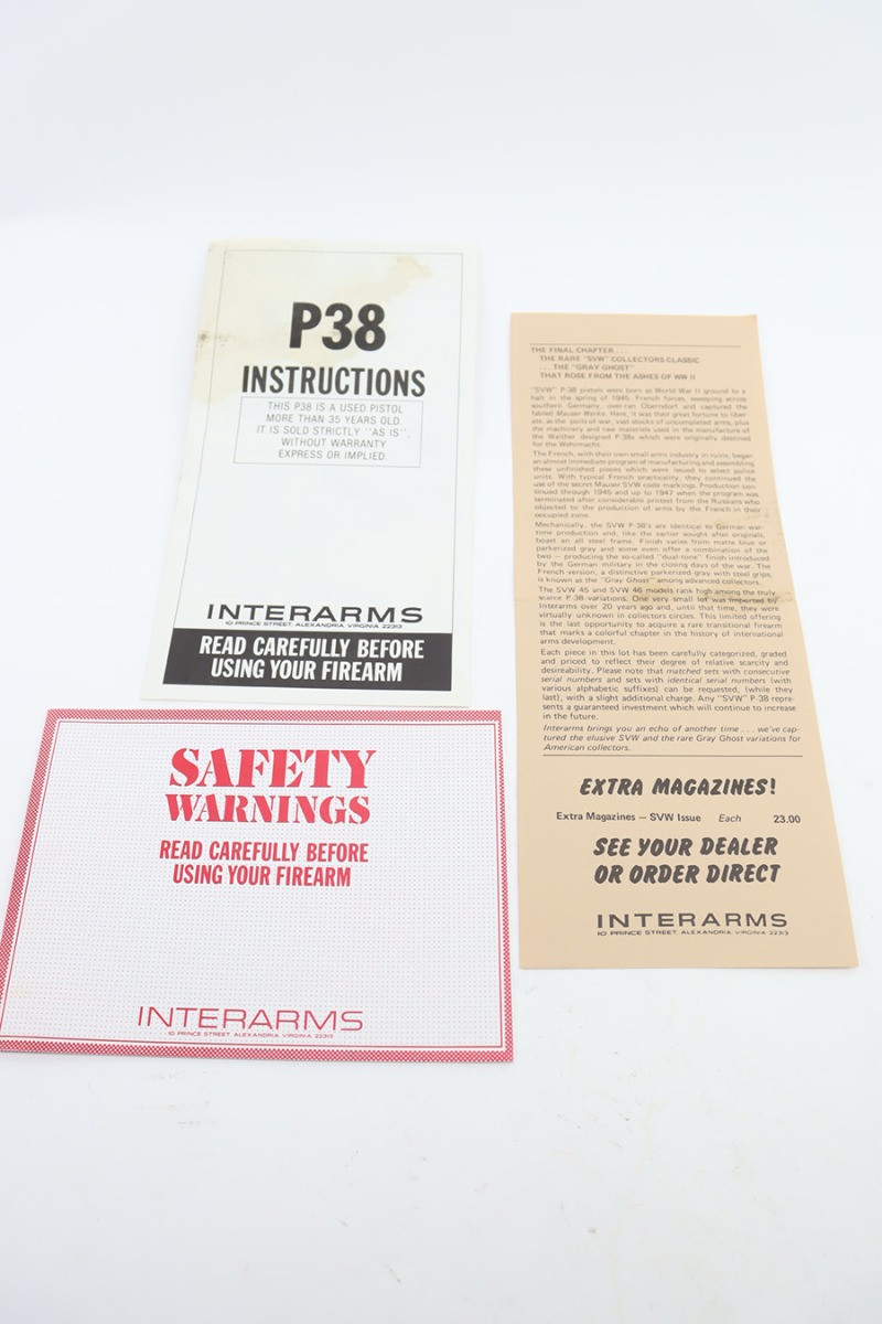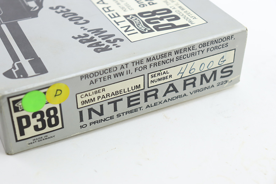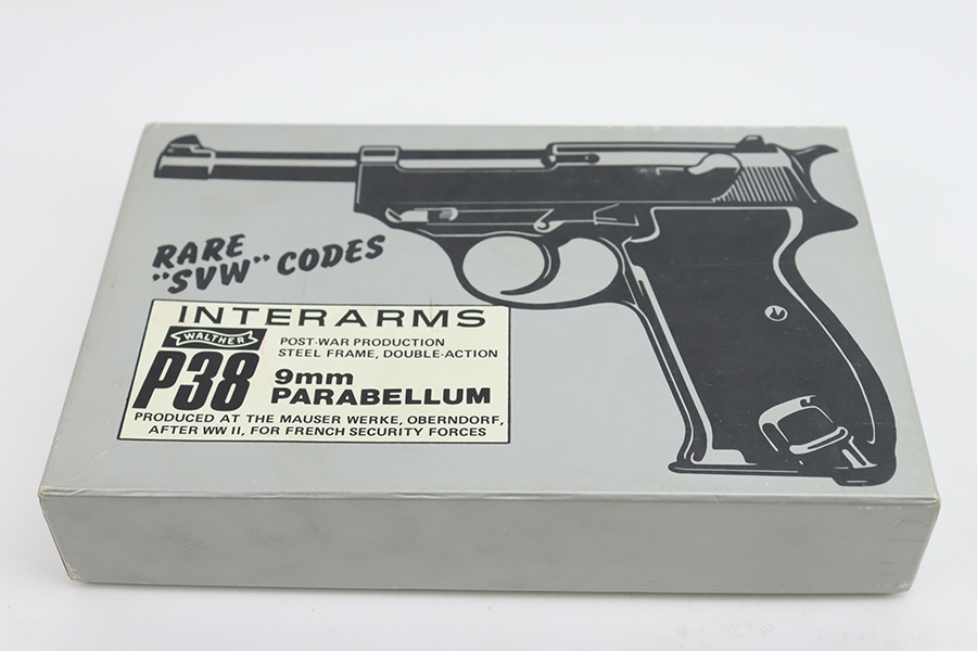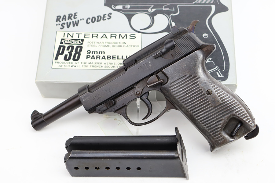 3/7/24 – This is a minty example of a Mauser P.38 put together by the French using leftover Nazi parts immediately after WW2, in 1945-46. This one was imported by Interarms. It comes with its original matching Interarms box, owners manual, and two WW2-era P.38 magazines. The gun is all matching, has no French proofs, and has one “Waffen 135” Nazi military acceptance proof on the barrel. Import mark on the underside of the slide. The gun is in minty condition, retaining nearly all of its finish with just some very light scuffs on the right side of the slide and on the front strap. Fitted with desirable “Grey Ghost” metal grips. The bore has good rifling with light pin-pricking throughout. De-cocker is functional.