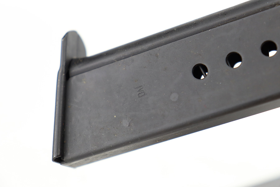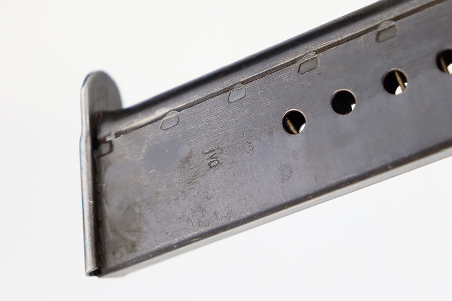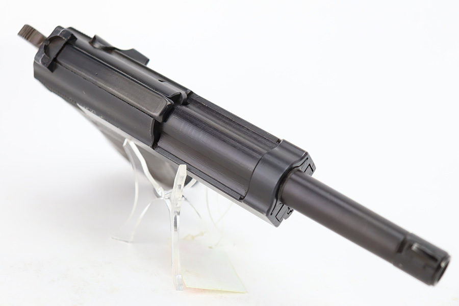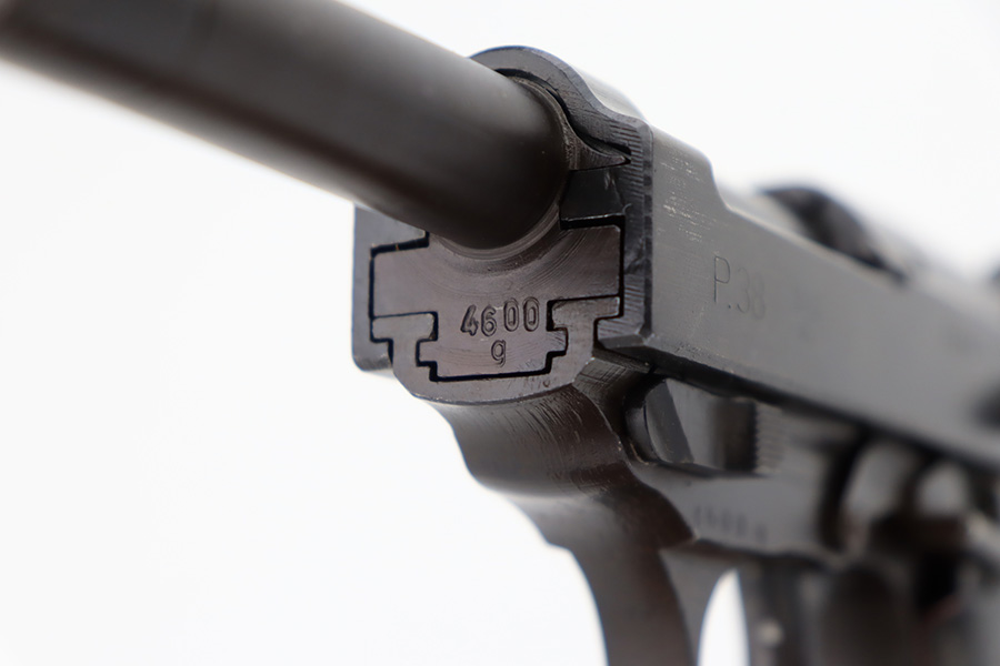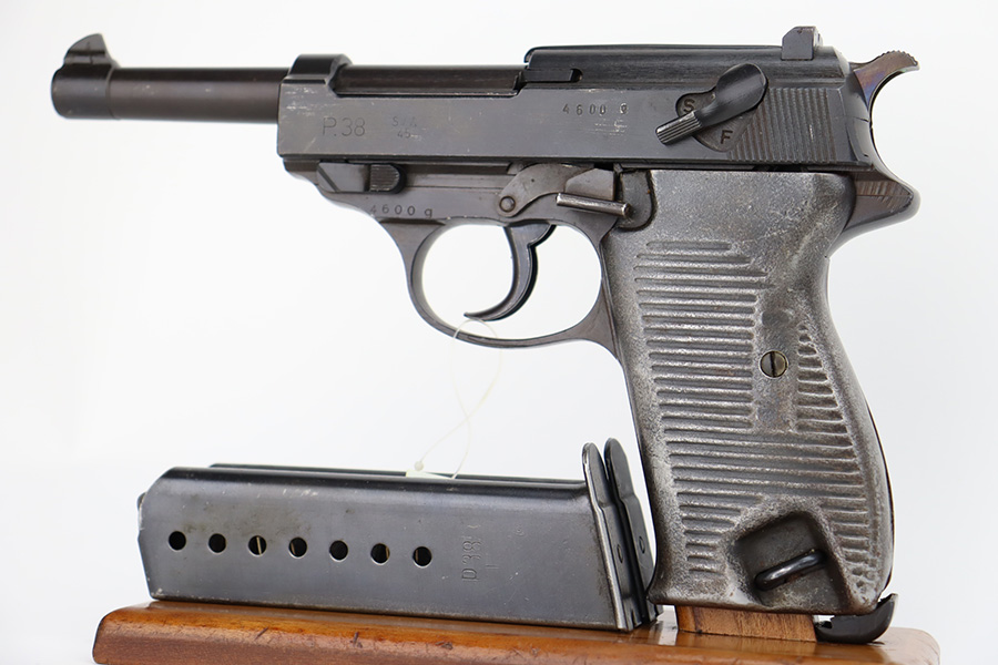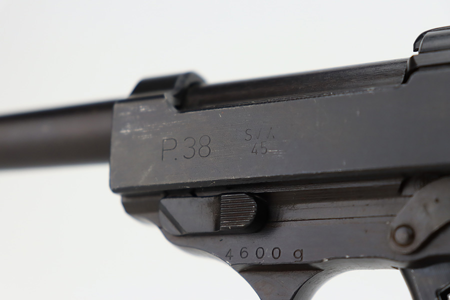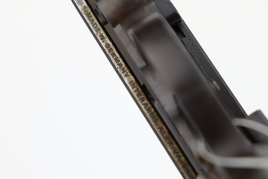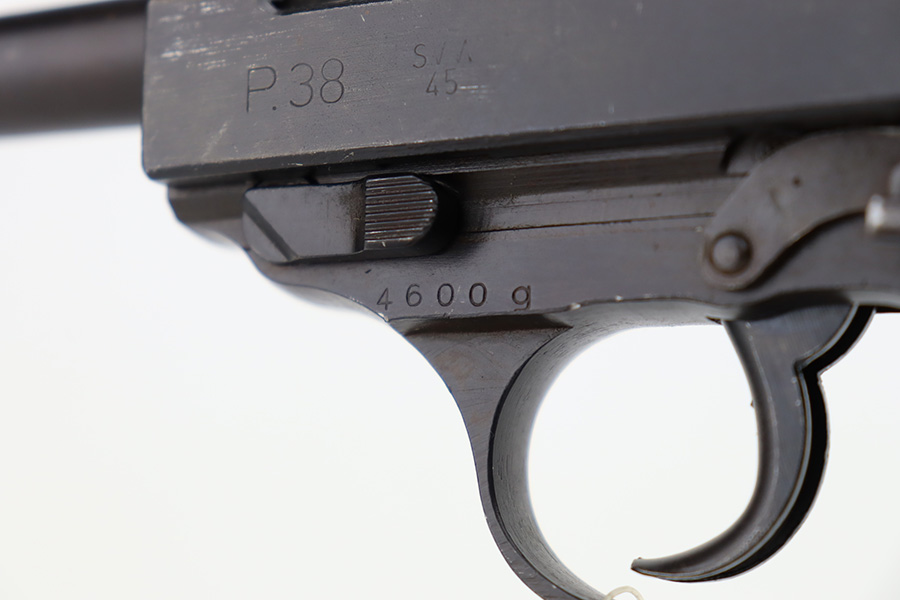 3/7/24 – This is a minty example of a Mauser P.38 put together by the French using leftover Nazi parts immediately after WW2, in 1945-46. This one was imported by Interarms. It comes with its original matching Interarms box, owners manual, and two WW2-era P.38 magazines. The gun is all matching, has no French proofs, and has one “Waffen 135” Nazi military acceptance proof on the barrel. Import mark on the underside of the slide. The gun is in minty condition, retaining nearly all of its finish with just some very light scuffs on the right side of the slide and on the front strap. Fitted with desirable “Grey Ghost” metal grips. The bore has good rifling with light pin-pricking throughout. De-cocker is functional.