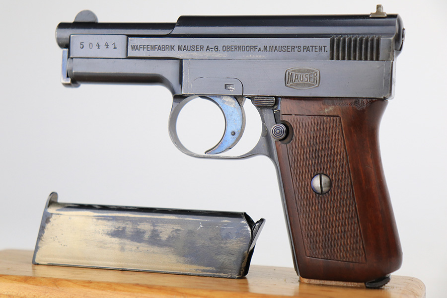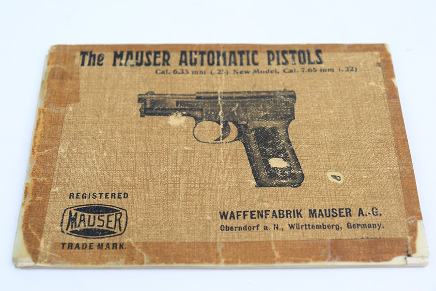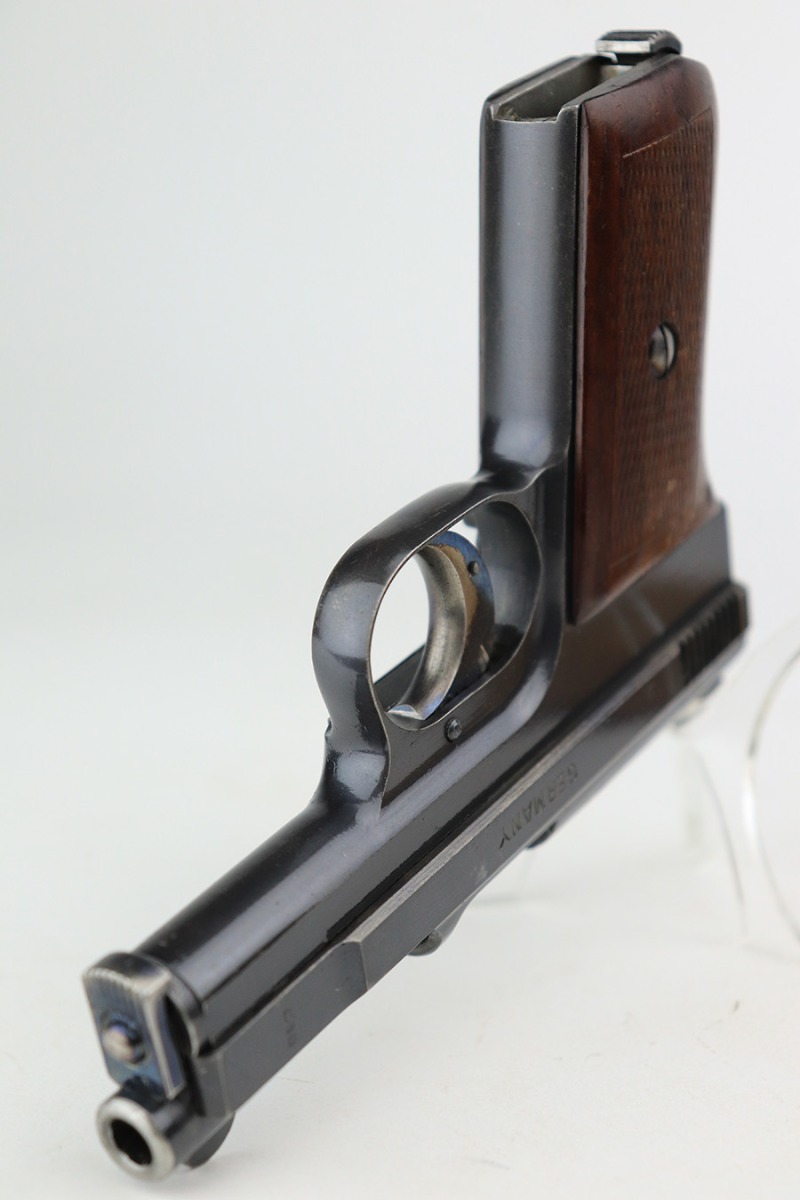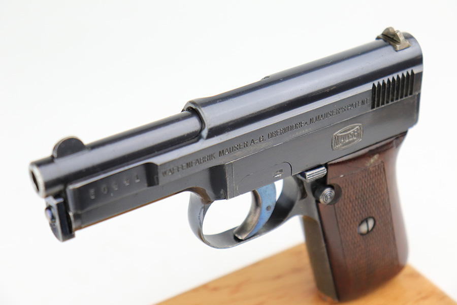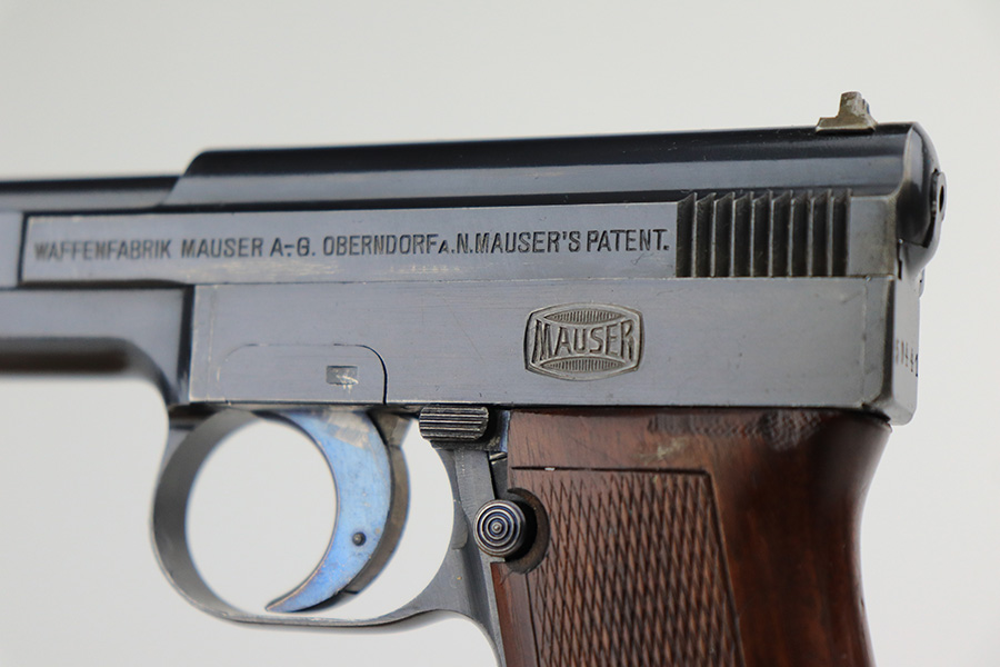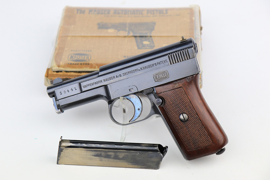 6/1/22 – This is a minty example of an early Mauser M1910 that is referred to as the ‘sidelatch’ variant, due to the obvious design feature on left side of the frame. There were only about 15,000 of this variation produced, and this example is in the proper serial range. It comes with a period-correct box (not serialized) and an original owners manual. The edges of both the box and owners manual have been repaired with clear tape. The pistol is all matching with about 98% blue remaining. There are hints of wear on some of the high edges and very minor thinning on the left side of the frame. Comes with an excellent wood grip and a proper magazine. There is some minor bruising near the top edges of both sides of the grip. The bore has excellent rifling with some very minor fouling in the grooves.