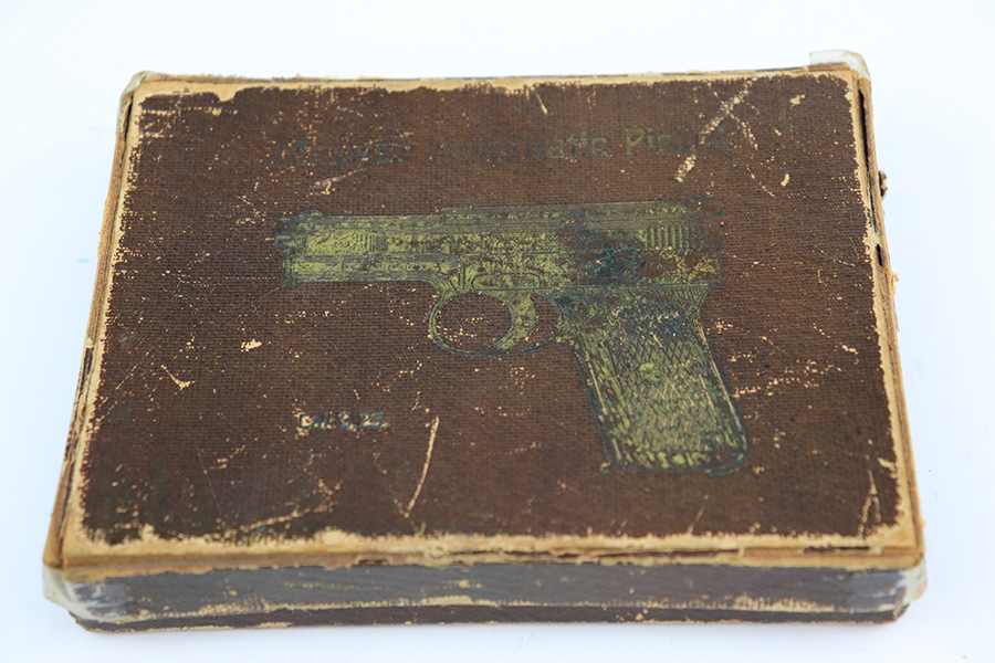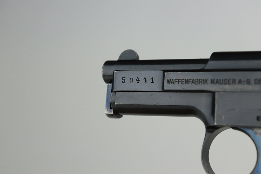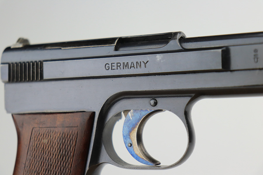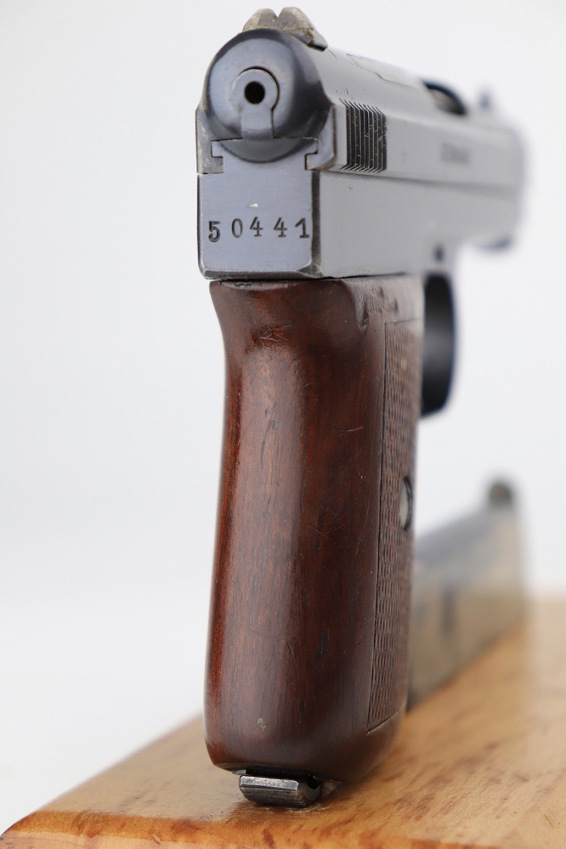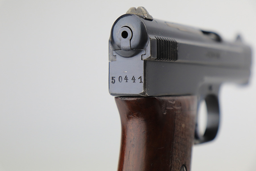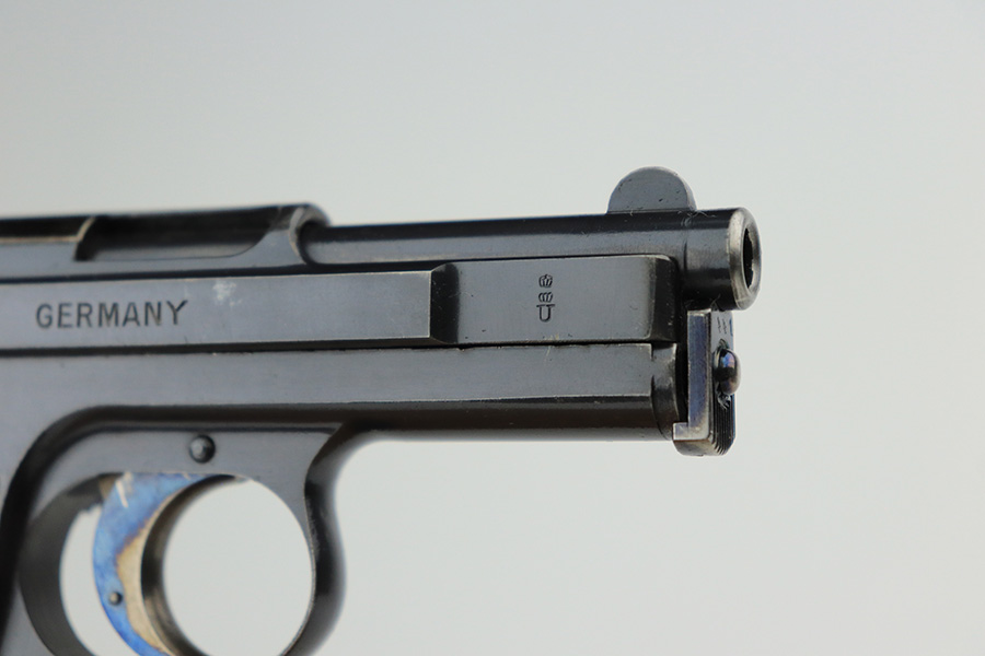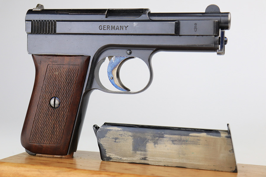 6/1/22 – This is a minty example of an early Mauser M1910 that is referred to as the ‘sidelatch’ variant, due to the obvious design feature on left side of the frame. There were only about 15,000 of this variation produced, and this example is in the proper serial range. It comes with a period-correct box (not serialized) and an original owners manual. The edges of both the box and owners manual have been repaired with clear tape. The pistol is all matching with about 98% blue remaining. There are hints of wear on some of the high edges and very minor thinning on the left side of the frame. Comes with an excellent wood grip and a proper magazine. There is some minor bruising near the top edges of both sides of the grip. The bore has excellent rifling with some very minor fouling in the grooves.