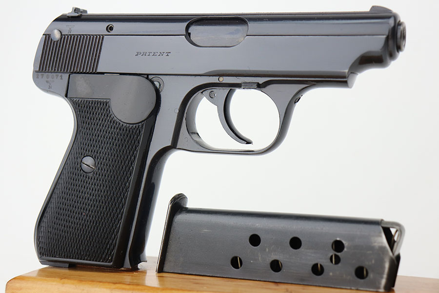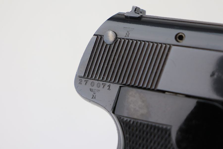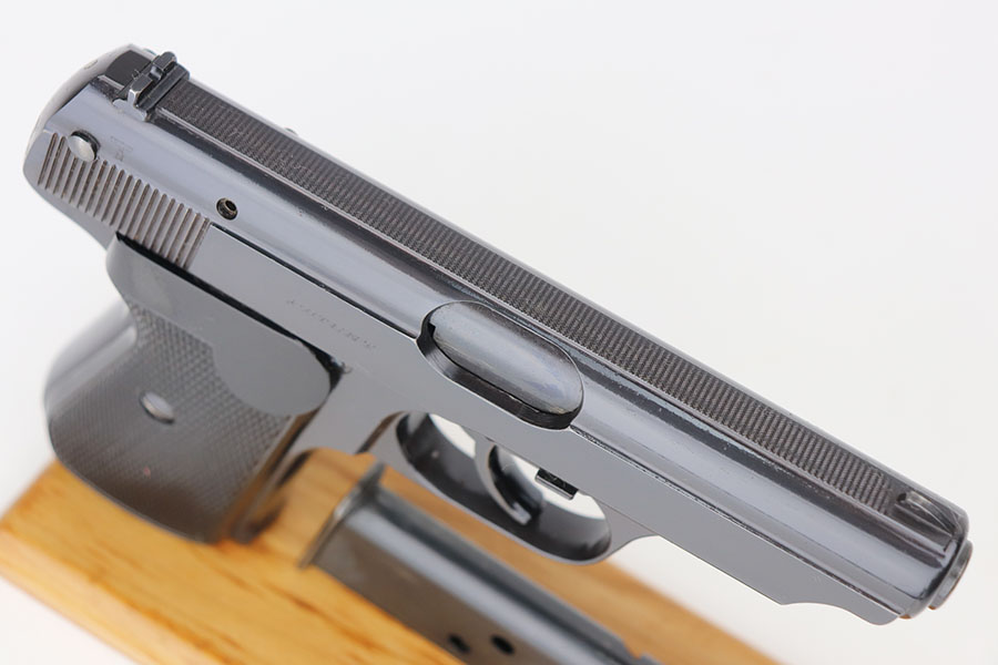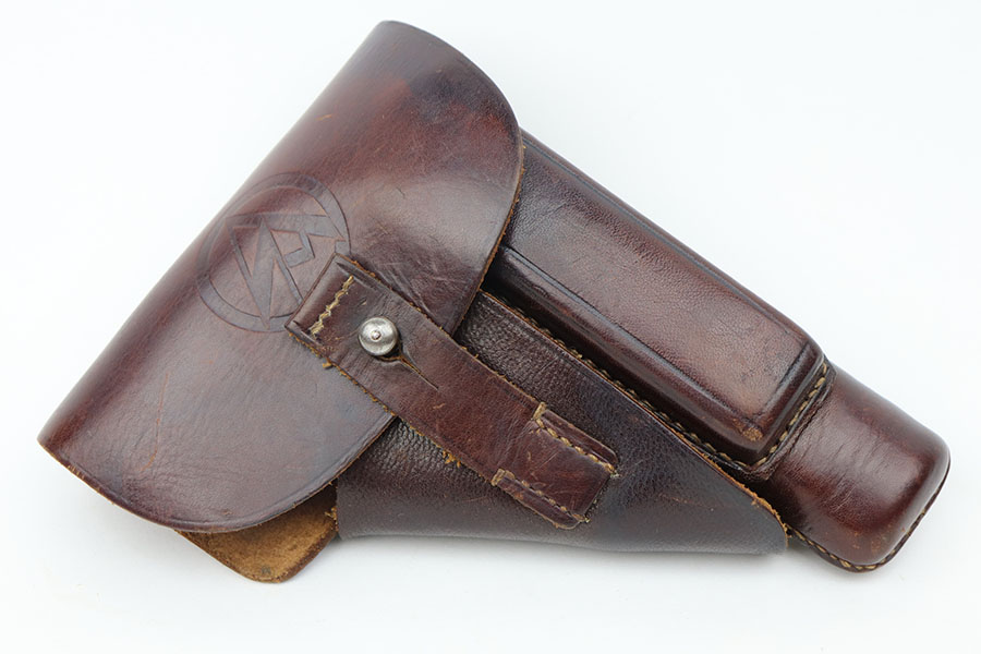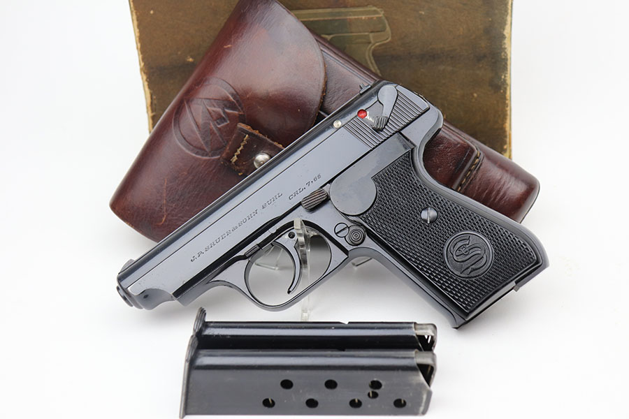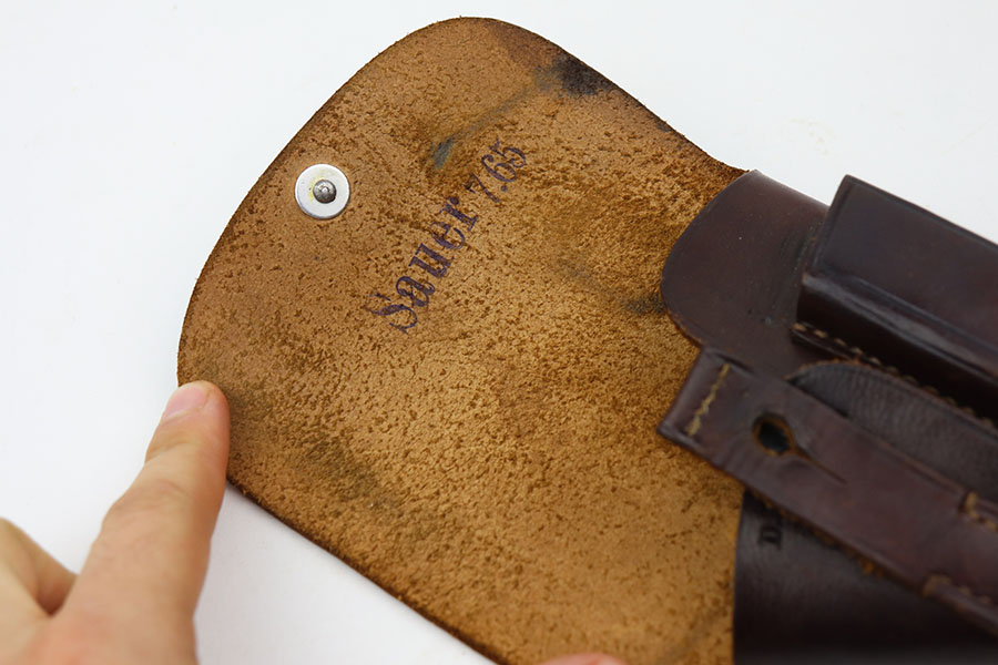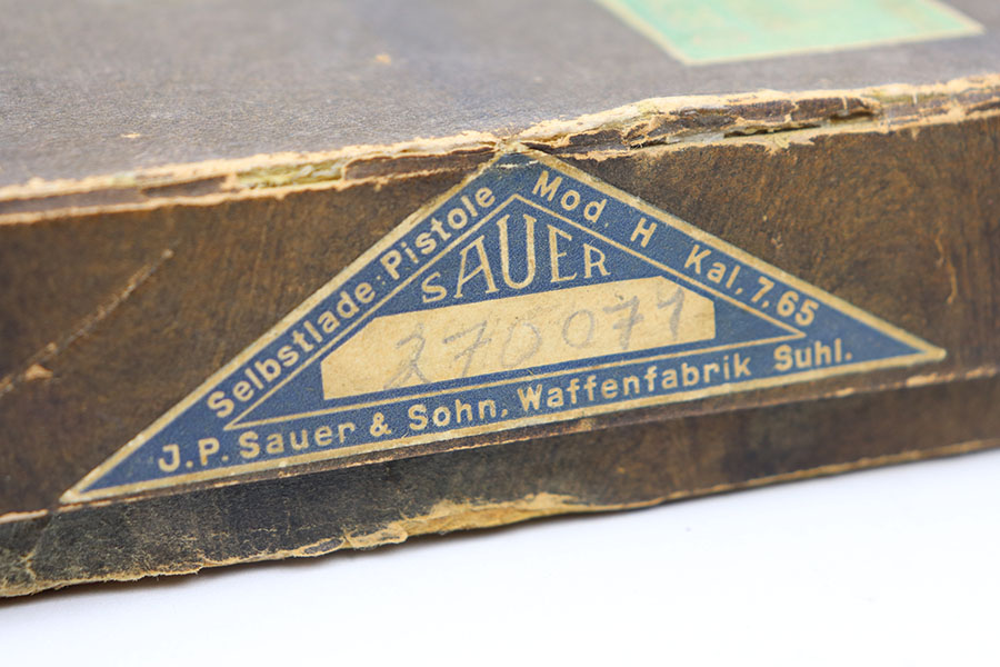 4/20/21 – This is a minty, early Sauer 38h in the original box with rare SA marked holster. Cate’s book on Sauers posits many of the early commercial Sauers may have been issued to the SA, and this group includes one of the finest examples of the rare SA holster you’ll ever see. The pistol itself has 99% of the original, high-polish blue remaining. It has a mint bore and terrific grips. The original box is hand numbered and matching to the pistol on the label. It comes with a spare magazine, manual and cleaning rod. A rare find all around, and in condition you won’t be able to upgrade. Hischier collection.