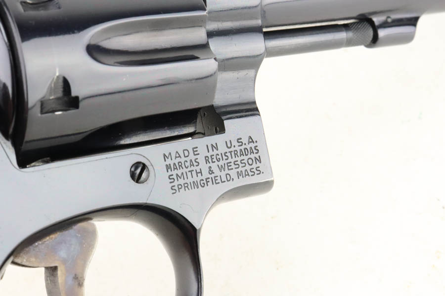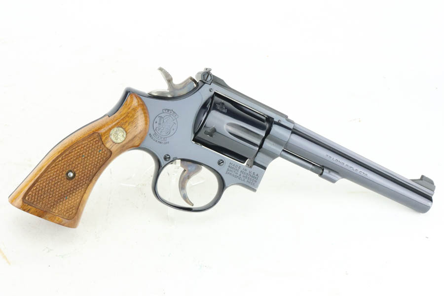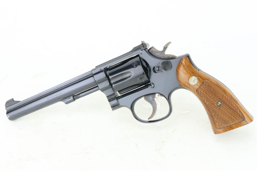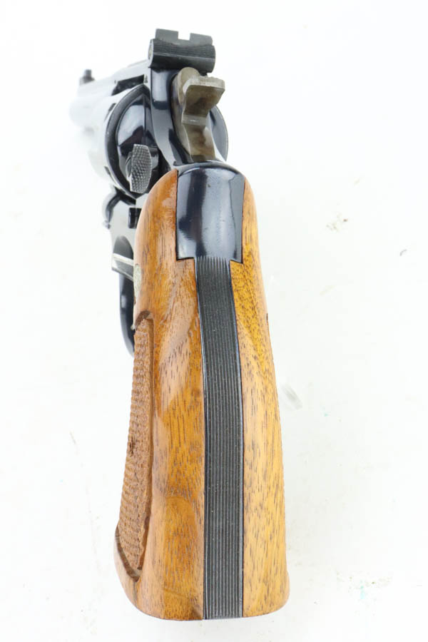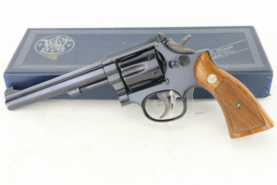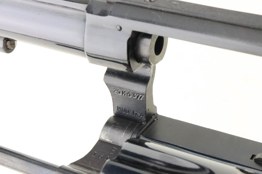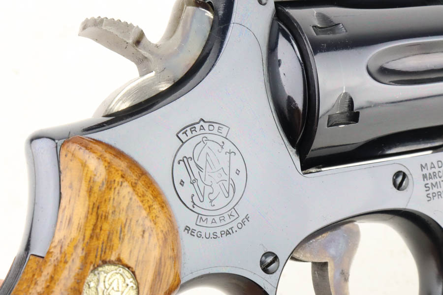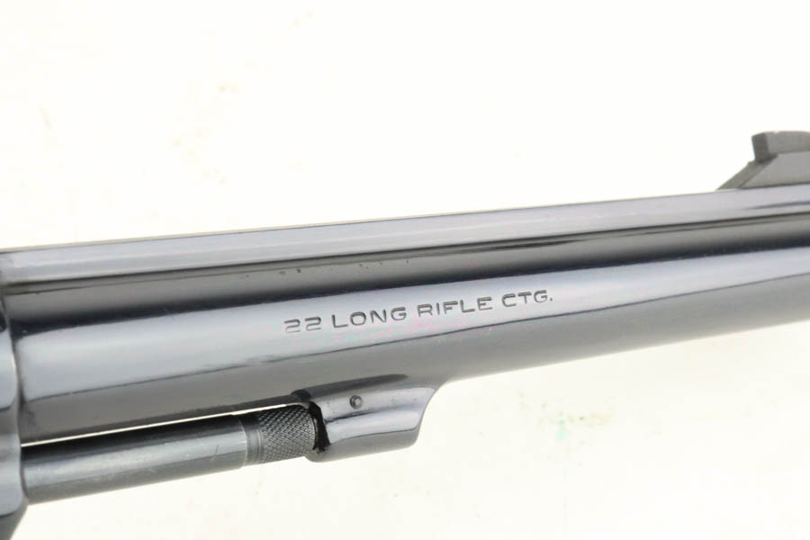 6/21/24 – This is a near-mint example of a Smith & Wesson Model 17-4 Revolver, manufactured in about 1978 and chambered in .22 LR. It comes with a matching-numbered and owners manual. Although the box is matching, we believe the label is likely reprinted. The gun itself has retained nearly all of its original high polish finish with just a hint of muzzle wear and a very light roll mark on the cylinder. Fitted with excellent checkered Walnut grips. Mint bore.
