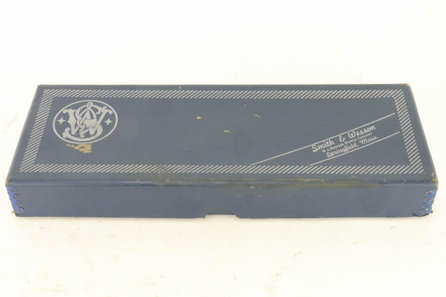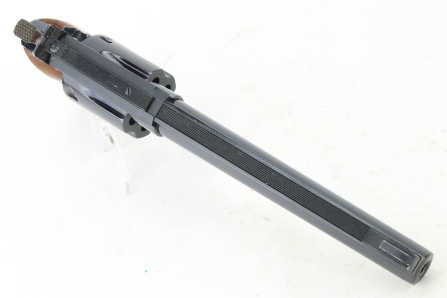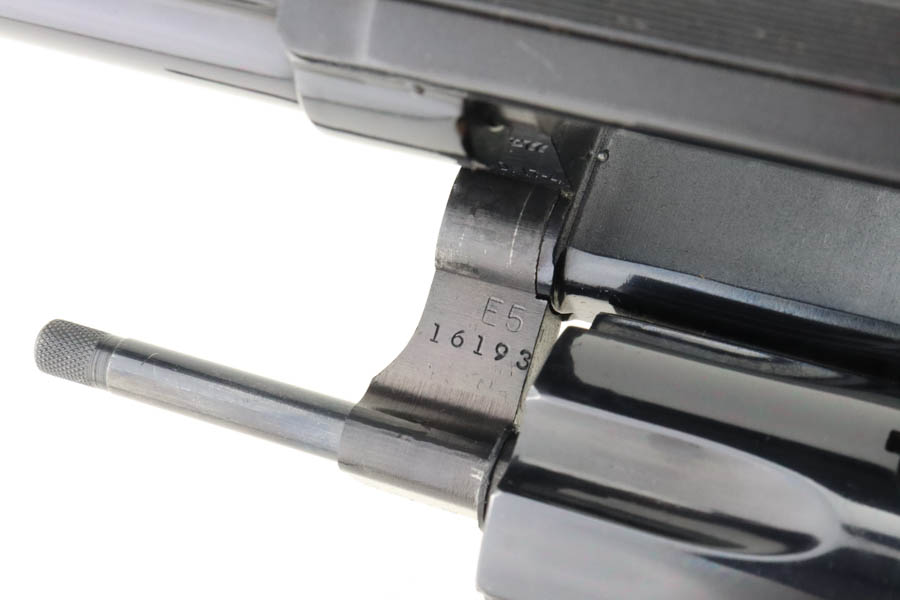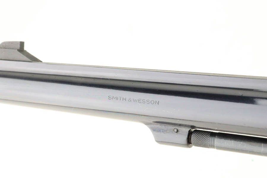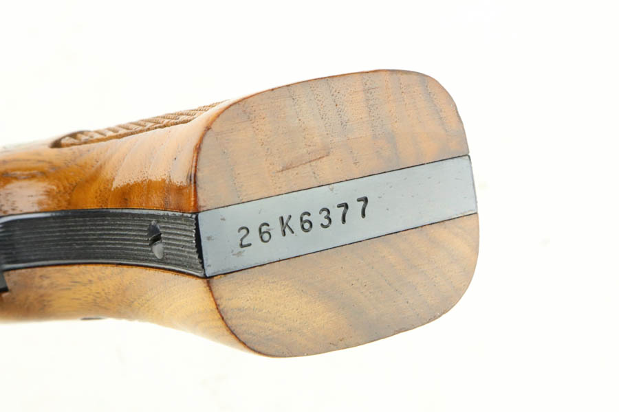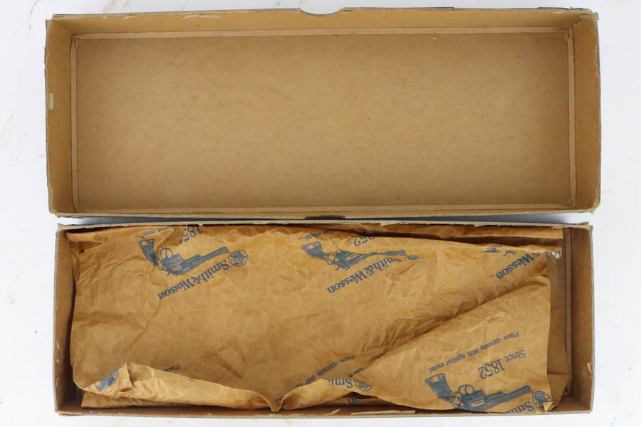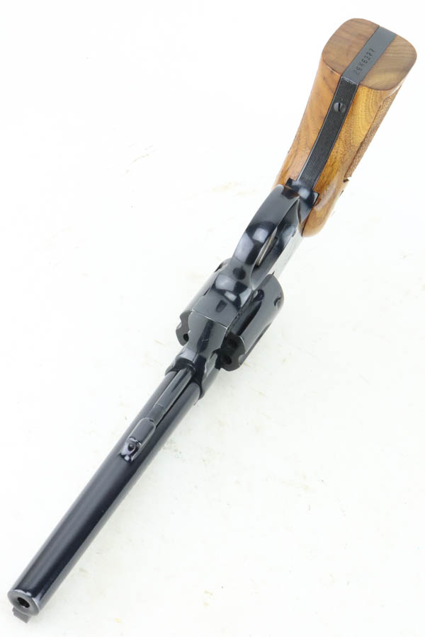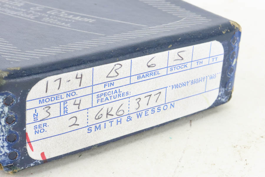 6/21/24 – This is a near-mint example of a Smith & Wesson Model 17-4 Revolver, manufactured in about 1978 and chambered in .22 LR. It comes with a matching-numbered and owners manual. Although the box is matching, we believe the label is likely reprinted. The gun itself has retained nearly all of its original high polish finish with just a hint of muzzle wear and a very light roll mark on the cylinder. Fitted with excellent checkered Walnut grips. Mint bore.