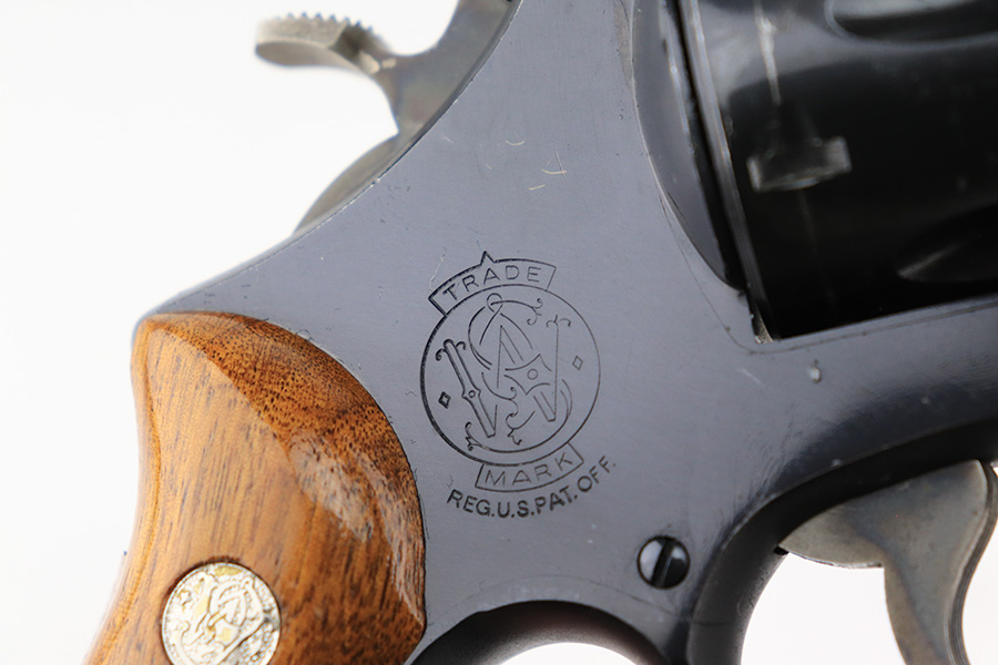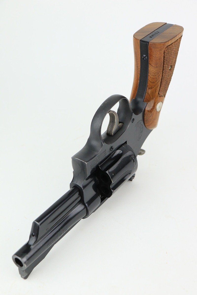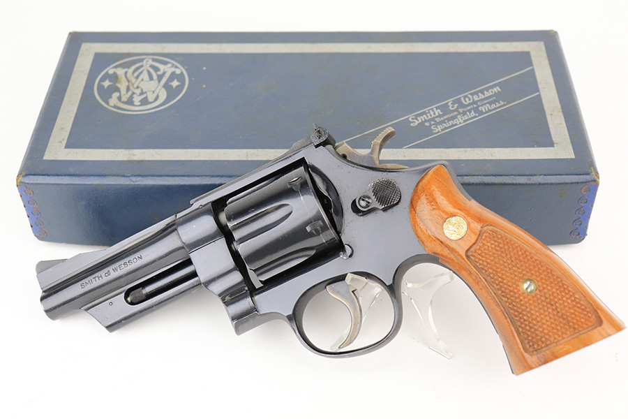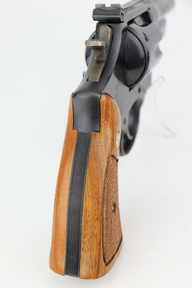 5/12/22 – This is a near-mint example of a Smith and Wesson Model 28-2 “Highway Patrolman” revolver, chambered in .357 Magnum and was manufactured in 1970-71. 4″ barrel. It comes with a period-correct box that is numbered but does not match the gun. The gun itself has retained more than 98% of its finish. There is a hint of muzzle wear, hints of wear on the high edges of the cylinder, and a light roll mark on the cylinder. Some tiny handling marks here and there. Very nice case-hardening on the hammer and trigger. Comes with minty wood grips. Mint bore. The cylinder is tight and the action is smooth. Mint bore.