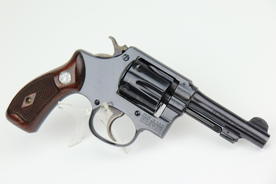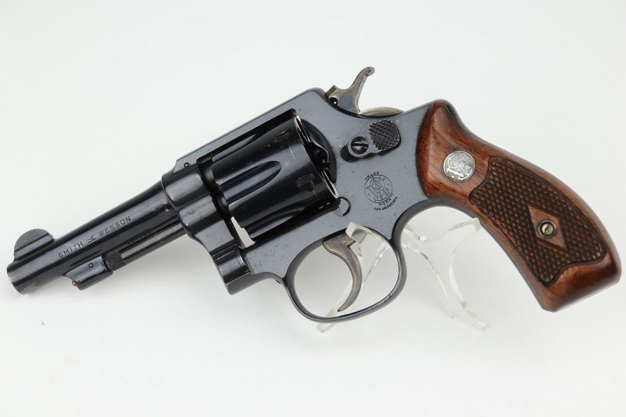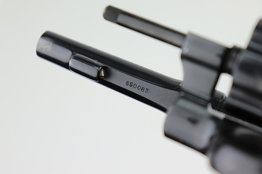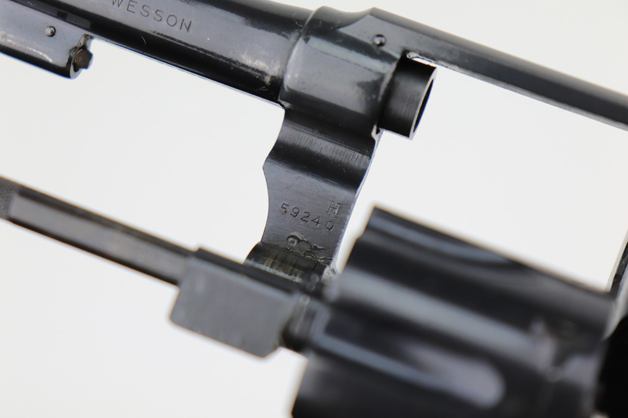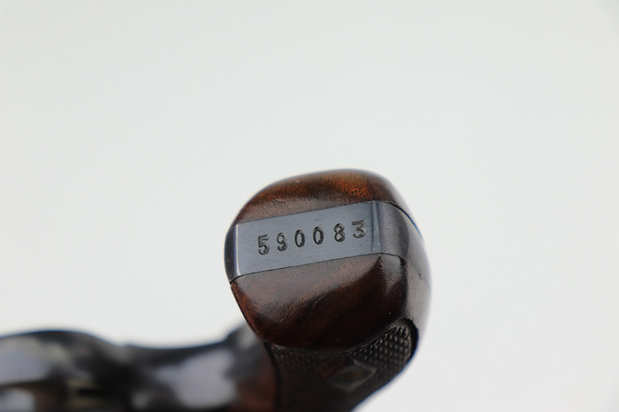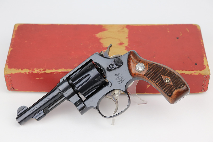 4/1/22 – This is a minty example of a Smith & Wesson .32 Caliber Hand Ejector revolver manufactured in the 1950’s. It is all matching and comes with a period-correct box that is not serial-numbered. The gun has retained about 98% of its original high polish finish. There is very minor muzzle wear, a few very light scratches along the left side of the barrel, and a very light roll mark on the cylinder. While there is very little actual finish loss, there is a small area of minor pin-pricking on the right side of the frame where the frame meets the barrel. Tiny freckling on the right side of the frame. Comes with excellent walnut grips. Mint bore.