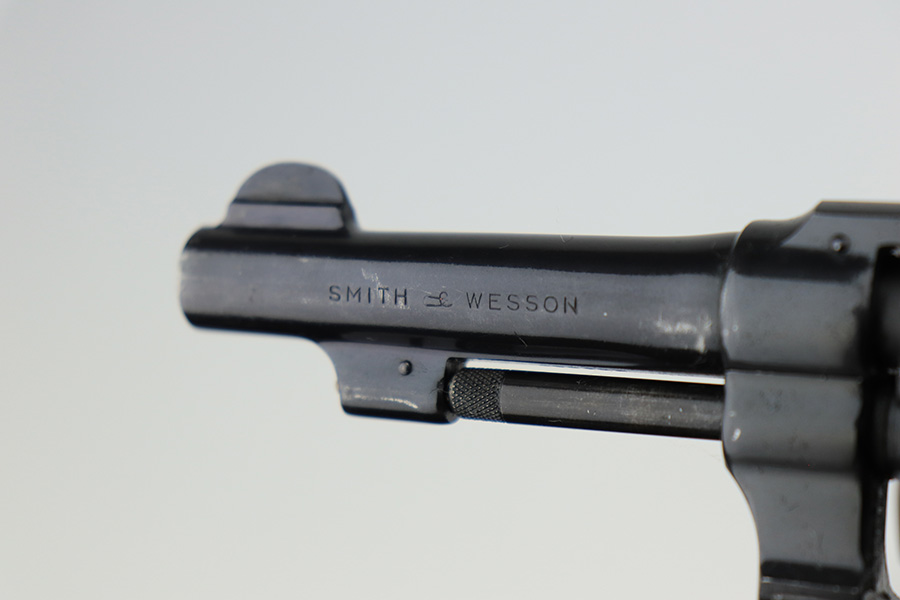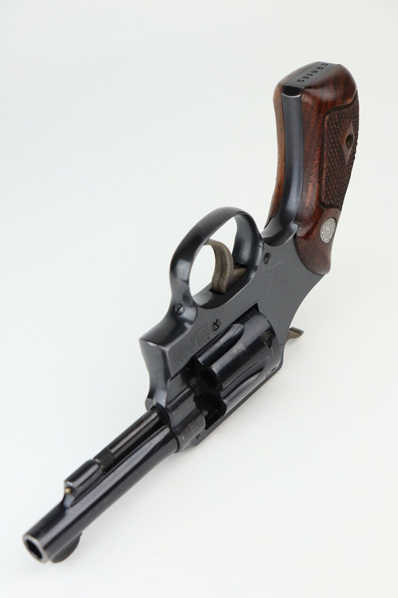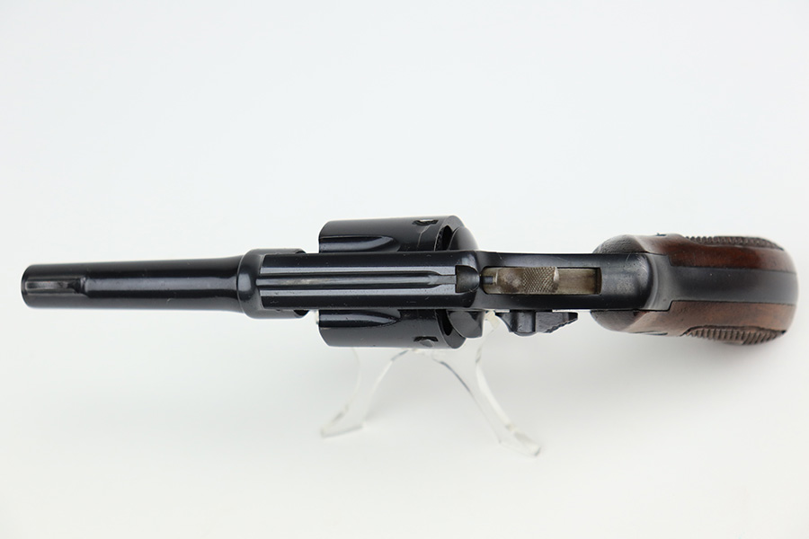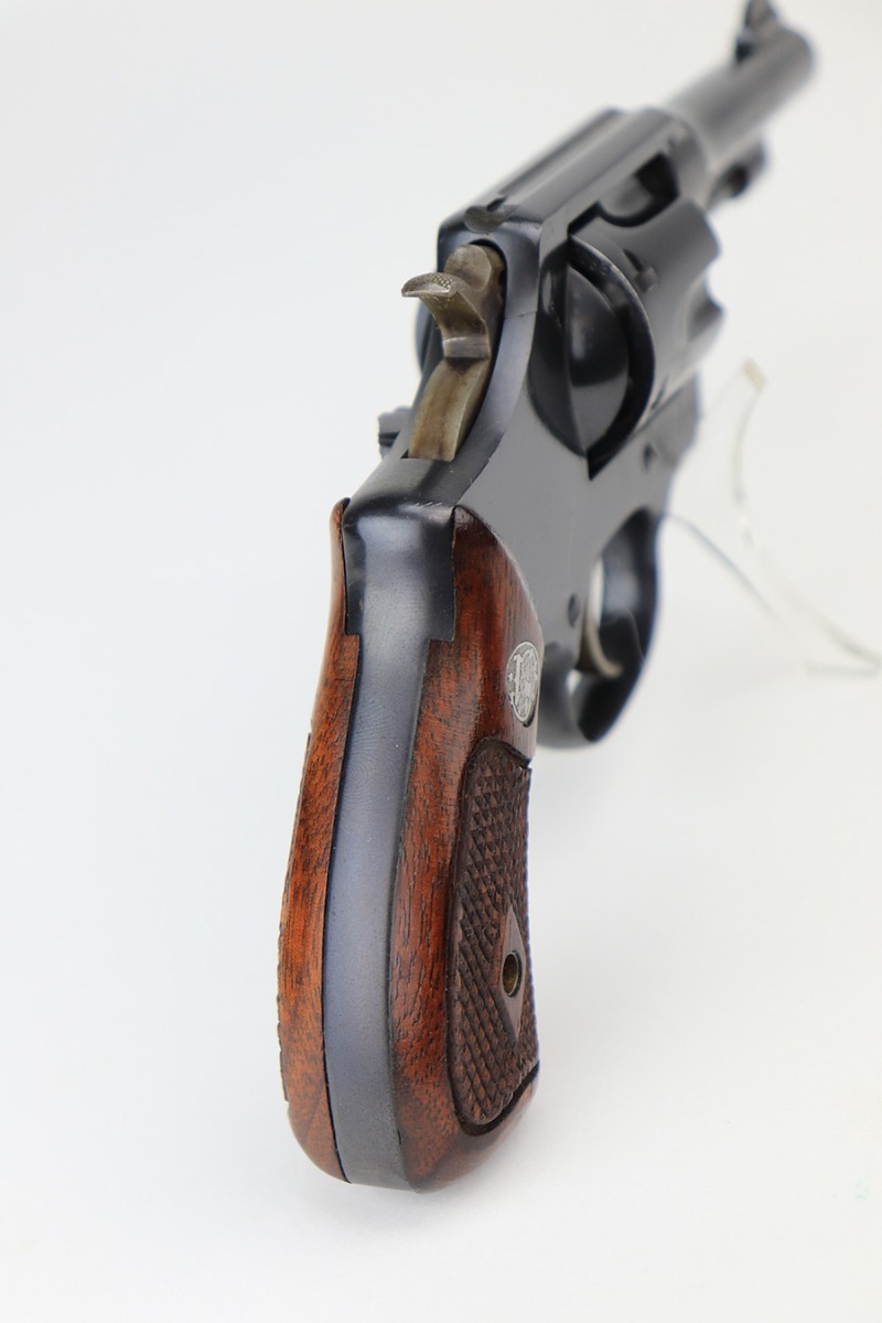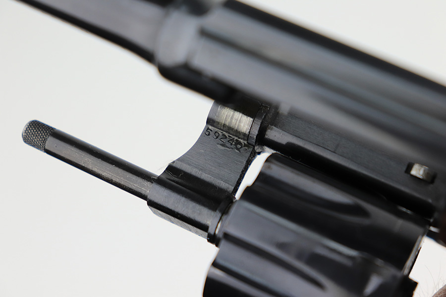 4/1/22 – This is a minty example of a Smith & Wesson .32 Caliber Hand Ejector revolver manufactured in the 1950’s. It is all matching and comes with a period-correct box that is not serial-numbered. The gun has retained about 98% of its original high polish finish. There is very minor muzzle wear, a few very light scratches along the left side of the barrel, and a very light roll mark on the cylinder. While there is very little actual finish loss, there is a small area of minor pin-pricking on the right side of the frame where the frame meets the barrel. Tiny freckling on the right side of the frame. Comes with excellent walnut grips. Mint bore.