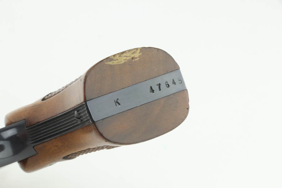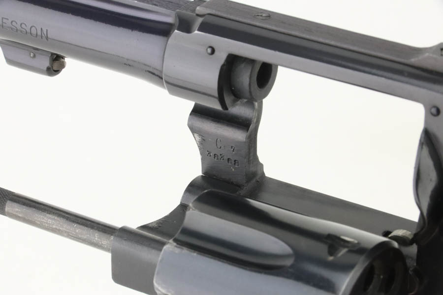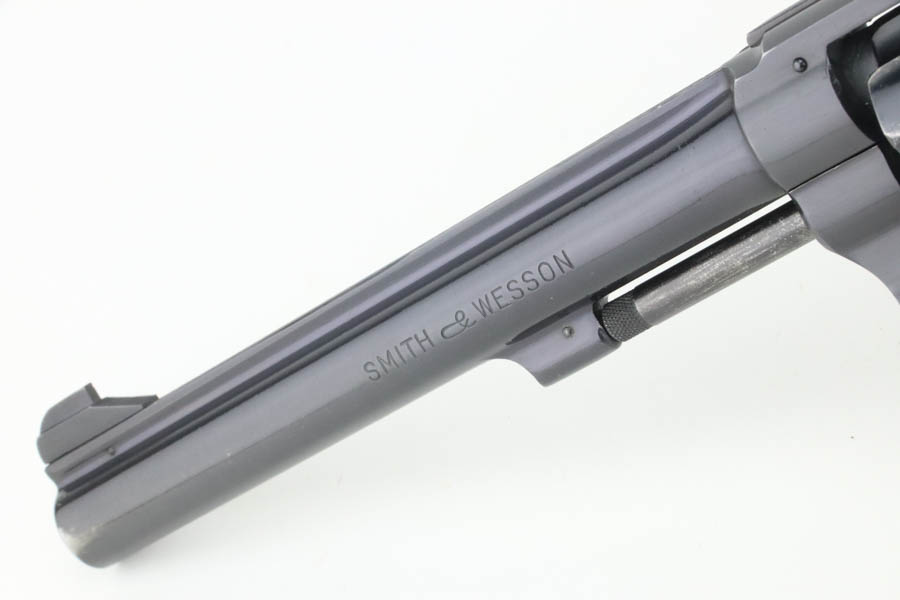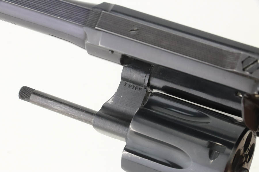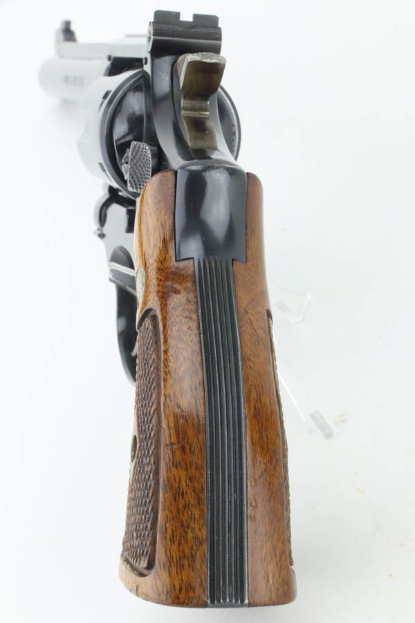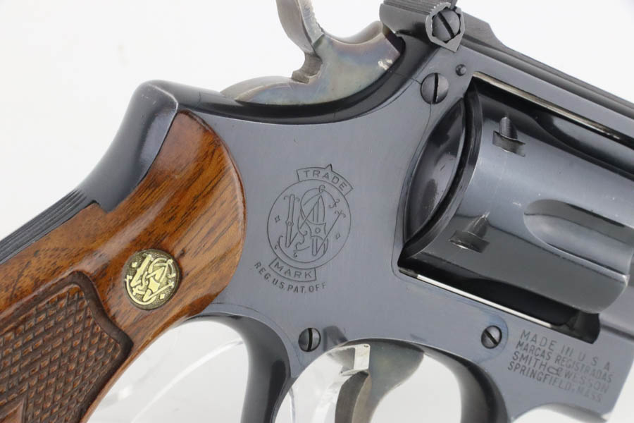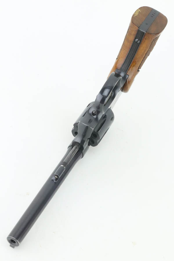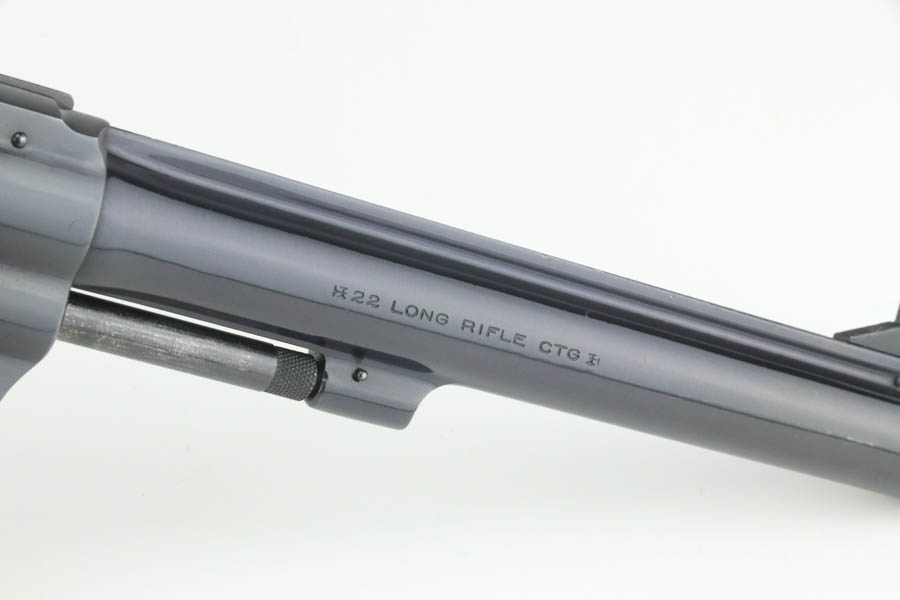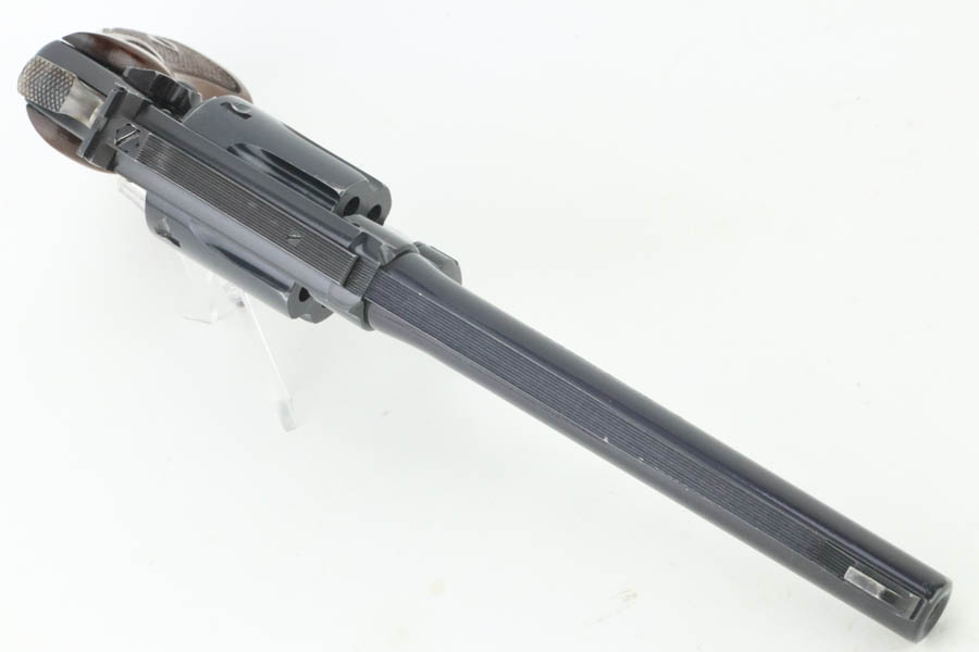 8/6/24 – This is a near-mint example of a Smith & Wesson K-22 Masterpiece revolver, manufactured in 1948 and chambered in .22 LR. It comes with a period-correct box. There is a very faint serial number written on the bottom of the box, but it is not legible. The gun’s original high polish bluing rates about 97-98% with just very minor muzzle and high edge wear. Excellent case-hardening on the hammer and trigger. Fitted with excellent hand-checkered Walnut grips. Mint bore.