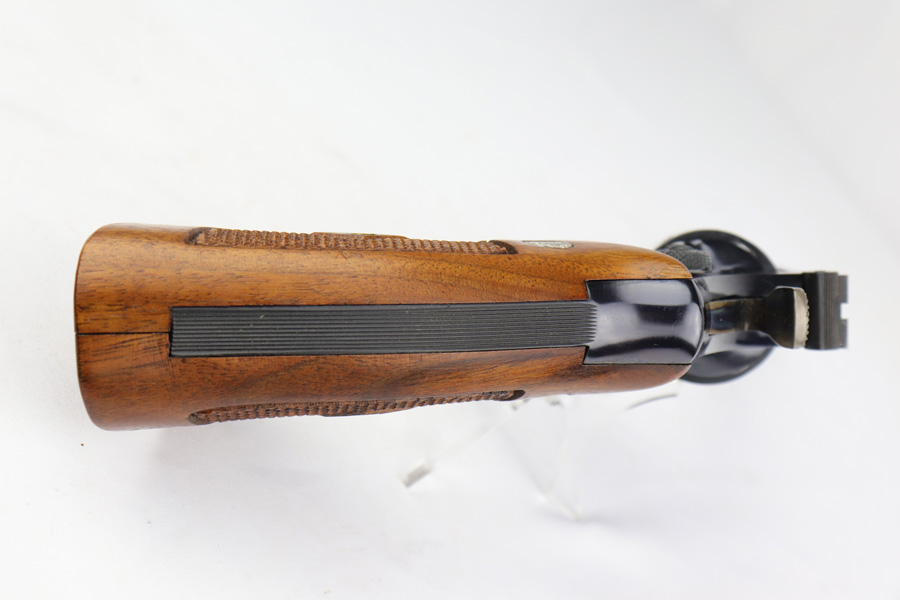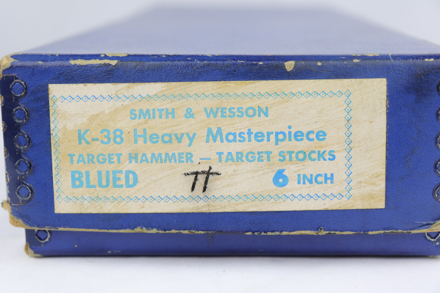 3/1/19 – This is a mint Smith & Wesson Model 14 revolver in the original S&W box. The gun shows only minor edge wear and a roll mark on the cylinder, with a mint bore. Believe the serial dates this one to the early 1960s, making it C&R eligible. The box is hand numbered and matching to the gun on the bottom. It is also labeled ‘Smith & Wesson K-38 Heavy Masterpiece Target Hammer Target Stocks’. Notice the pistol has a larger “target style” trigger and hammer. These add scarcity to this model. The K-38 Target Masterpiece was originally manufactured in 1947, then later renamed the Model 14 in 1957 when all Smith & Wesson revolvers were given numerical model numbers. This one is marked MOD-14 inside the cylinder well. The gun features nice case hardening on the trigger and hammer, with excellent grips. Beautiful all original condition.